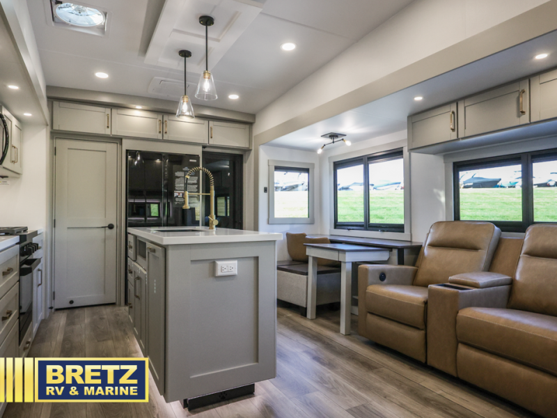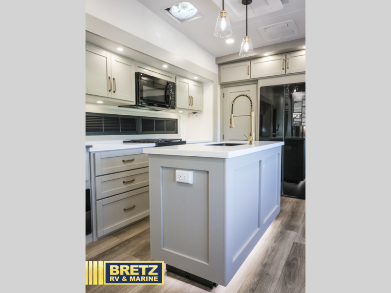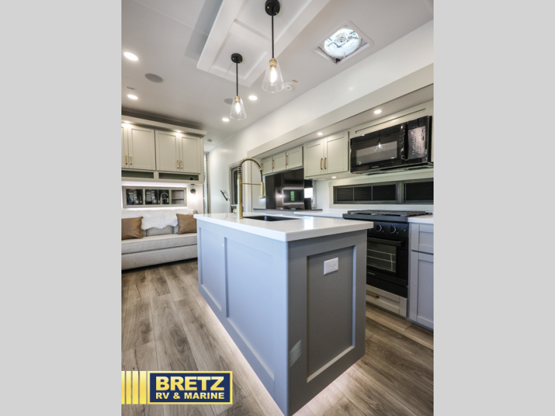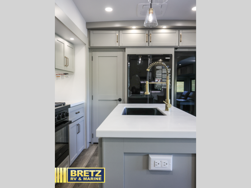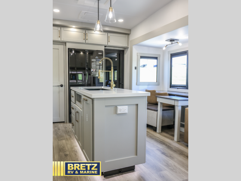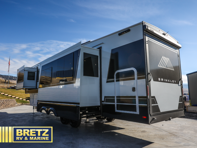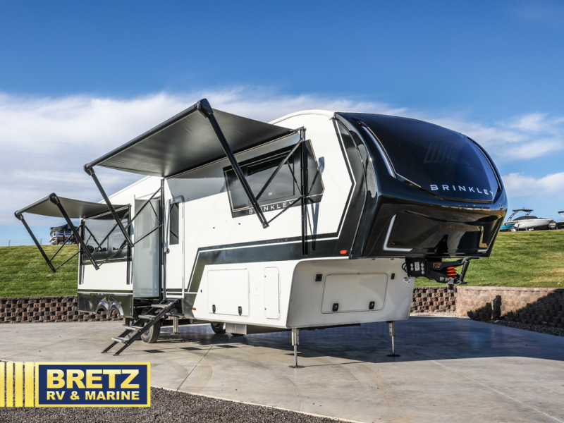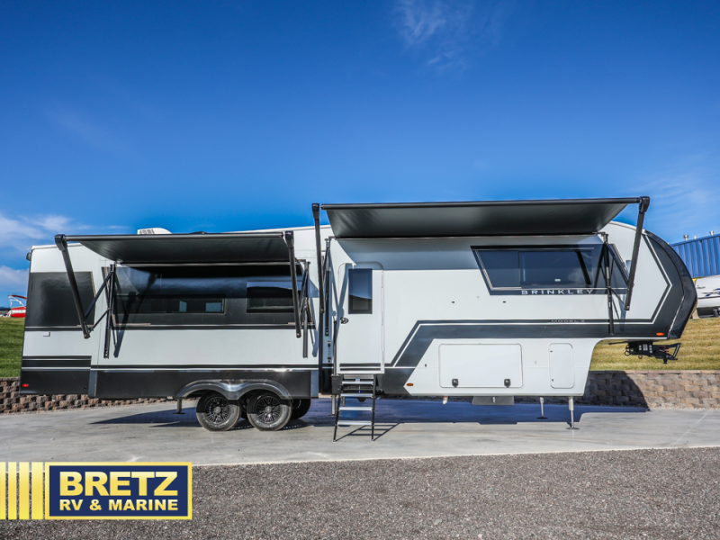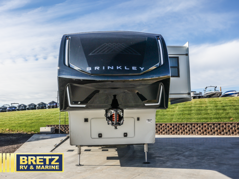 The Brinkley mid-profile Model Z fifth wheels bring you clean lines and an upscale look with plenty of style and exciting new features like the industry first brass plumbing connections. These units also feature an automotive grade front cap, plenty of exterior storage, exterior hot and cold showers, and wide stance leveling jacks for easy set up. Residential frameless windows provide a clean look and beautiful views, and ample electrical outlets and 6 USB/USB-C outlets allow all of your electronics and appliances to easily be used and charged.