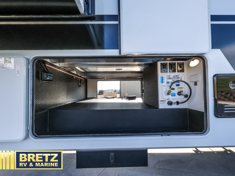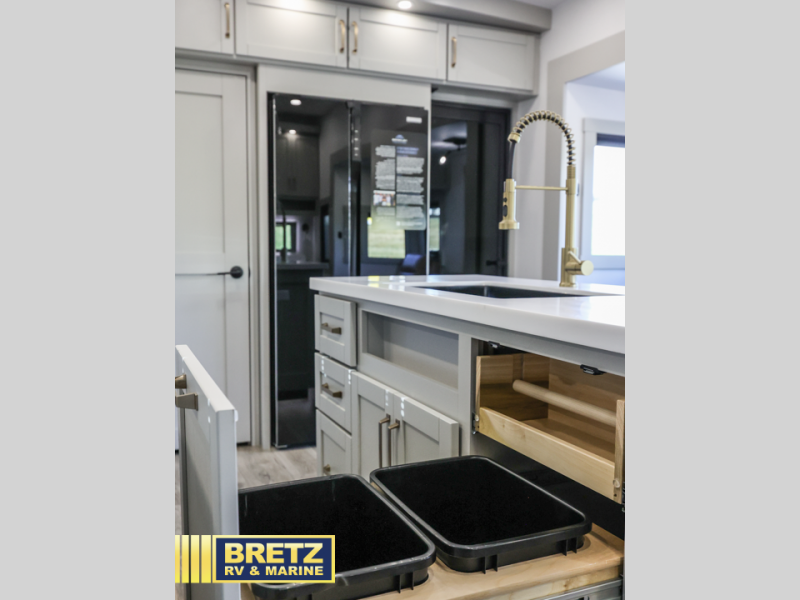 You're going to love every minute spent in this triple slide out fifth wheel! Once you arrive at the campground, you can put out the two side awnings, set up the rear patio and awning, then make lunch on the outdoor kitchen! There is also an outdoor TV here, a bar sink, and a refrigerator to keep drinks close by! Inside, the chef will find everything they need if the weather isn't cooperating, including a 30" residential microwave, 16 cu. ft. refrigerator, plus a large kitchen island, complete with dual trash bins and dog bowls at the foot. Your crew can get cozy on the tri-fold sofa that extends to a 54" x 70" bed for guests, and there is theater seating across from the televator and fireplace for easy viewing! You will find the front private bedroom ultra accommodating with its king bed slide out, sliding dresser top with hidden storage, your own TV, and a front wardrobe with shelves and a shoe rack. There is even washer and dryer prep if you want the option to make laundry day that much easier!