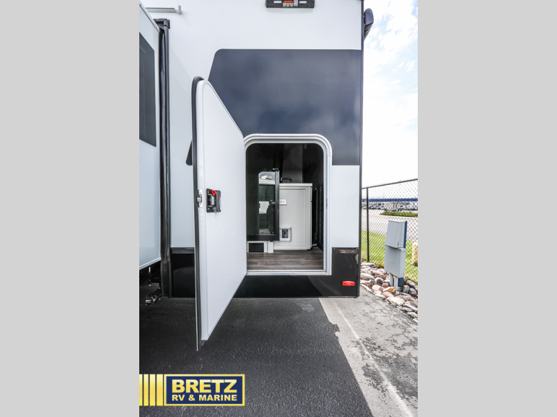 You're going to love every minute spent in this triple slide out fifth wheel! Once you arrive at the campground, you can put out the two side awnings, set up the rear patio and awning, then make lunch on the outdoor kitchen! There is also an outdoor TV here, a bar sink, and a refrigerator to keep drinks close by! Inside, the chef will find everything they need if the weather isn't cooperating, including a 30" residential microwave, 16 cu. ft. refrigerator, plus a large kitchen island, complete with dual trash bins and dog bowls at the foot. Your crew can get cozy on the tri-fold sofa that extends to a 54" x 70" bed for guests, and there is theater seating across from the televator and fireplace for easy viewing! You will find the front private bedroom ultra accommodating with its king bed slide out, sliding dresser top with hidden storage, your own TV, and a front wardrobe with shelves and a shoe rack. There is even washer and dryer prep if you want the option to make laundry day that much easier!