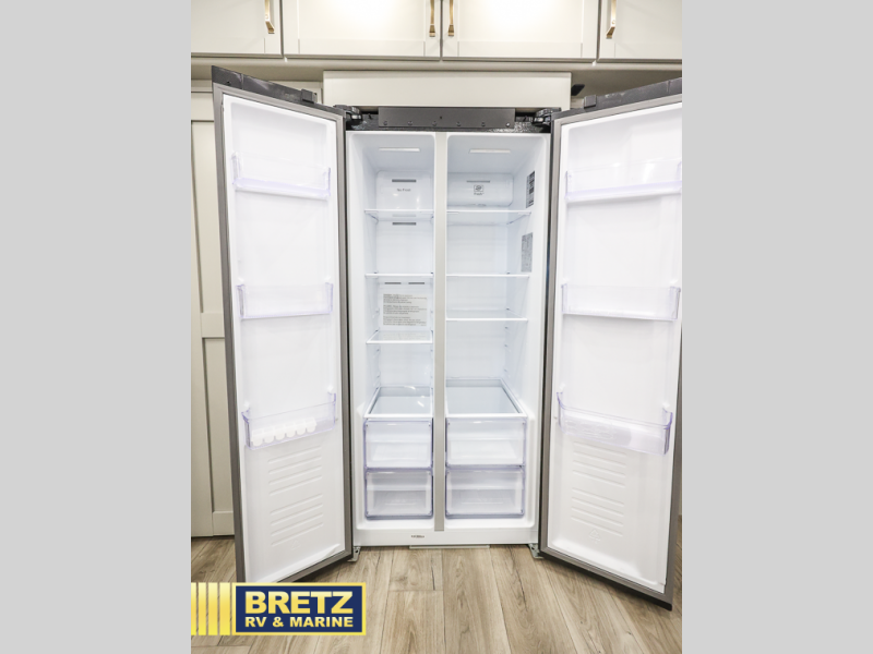 You're going to love every minute spent in this triple slide out fifth wheel! Once you arrive at the campground, you can put out the two side awnings, set up the rear patio and awning, then make lunch on the outdoor kitchen! There is also an outdoor TV here, a bar sink, and a refrigerator to keep drinks close by! Inside, the chef will find everything they need if the weather isn't cooperating, including a 30" residential microwave, 16 cu. ft. refrigerator, plus a large kitchen island, complete with dual trash bins and dog bowls at the foot. Your crew can get cozy on the tri-fold sofa that extends to a 54" x 70" bed for guests, and there is theater seating across from the televator and fireplace for easy viewing! You will find the front private bedroom ultra accommodating with its king bed slide out, sliding dresser top with hidden storage, your own TV, and a front wardrobe with shelves and a shoe rack. There is even washer and dryer prep if you want the option to make laundry day that much easier!