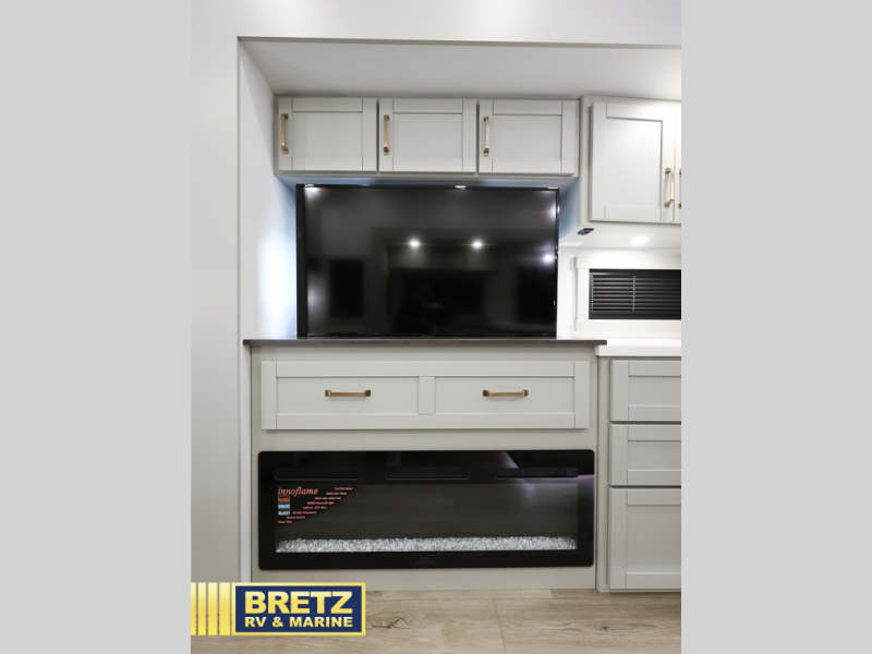 You're going to love every minute spent in this triple slide out fifth wheel! Once you arrive at the campground, you can put out the two side awnings, set up the rear patio and awning, then make lunch on the outdoor kitchen! There is also an outdoor TV here, a bar sink, and a refrigerator to keep drinks close by! Inside, the chef will find everything they need if the weather isn't cooperating, including a 30" residential microwave, 16 cu. ft. refrigerator, plus a large kitchen island, complete with dual trash bins and dog bowls at the foot. Your crew can get cozy on the tri-fold sofa that extends to a 54" x 70" bed for guests, and there is theater seating across from the televator and fireplace for easy viewing! You will find the front private bedroom ultra accommodating with its king bed slide out, sliding dresser top with hidden storage, your own TV, and a front wardrobe with shelves and a shoe rack. There is even washer and dryer prep if you want the option to make laundry day that much easier!