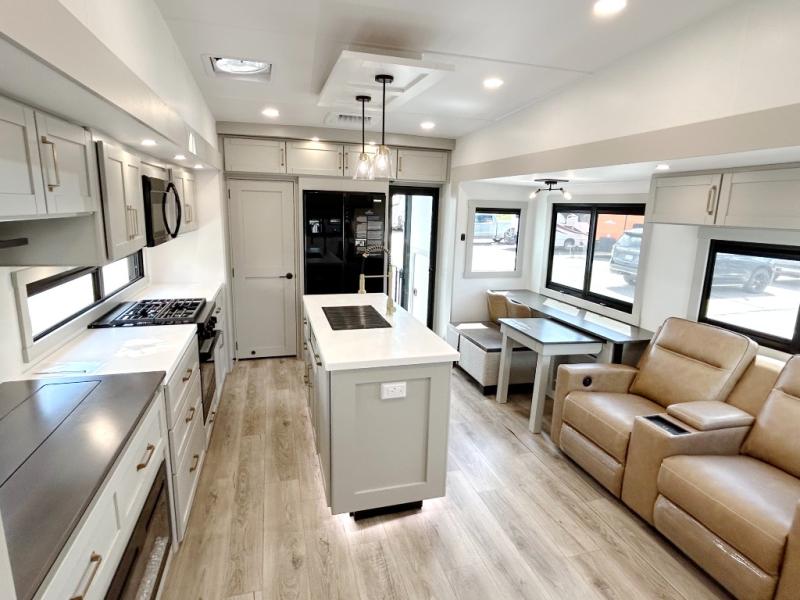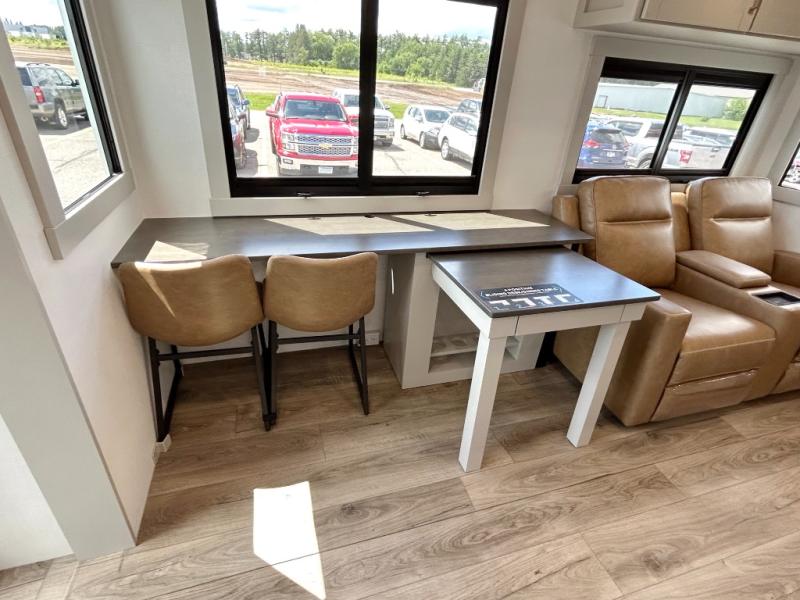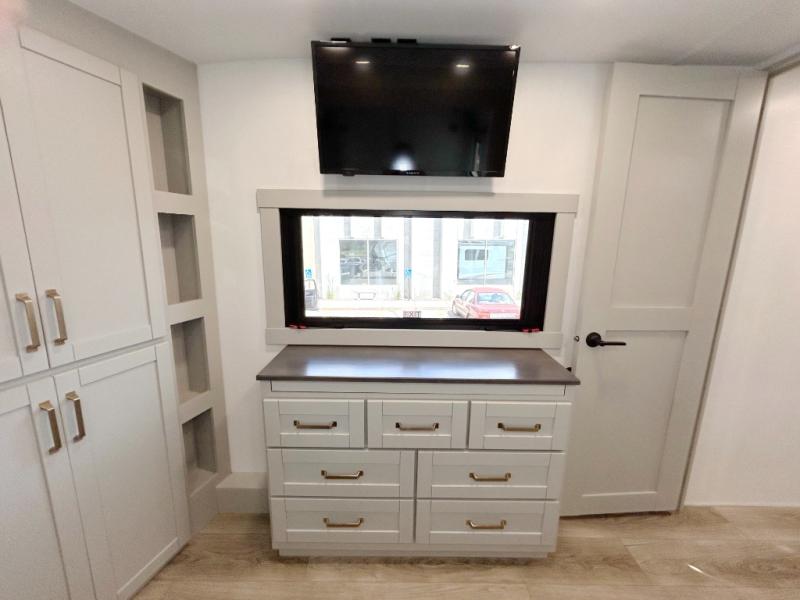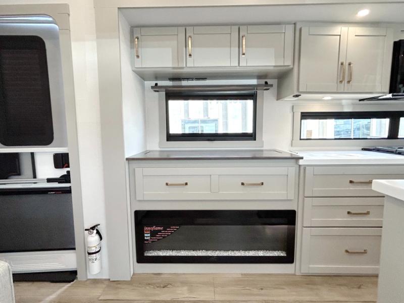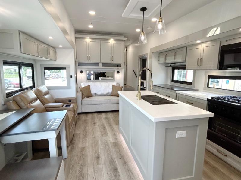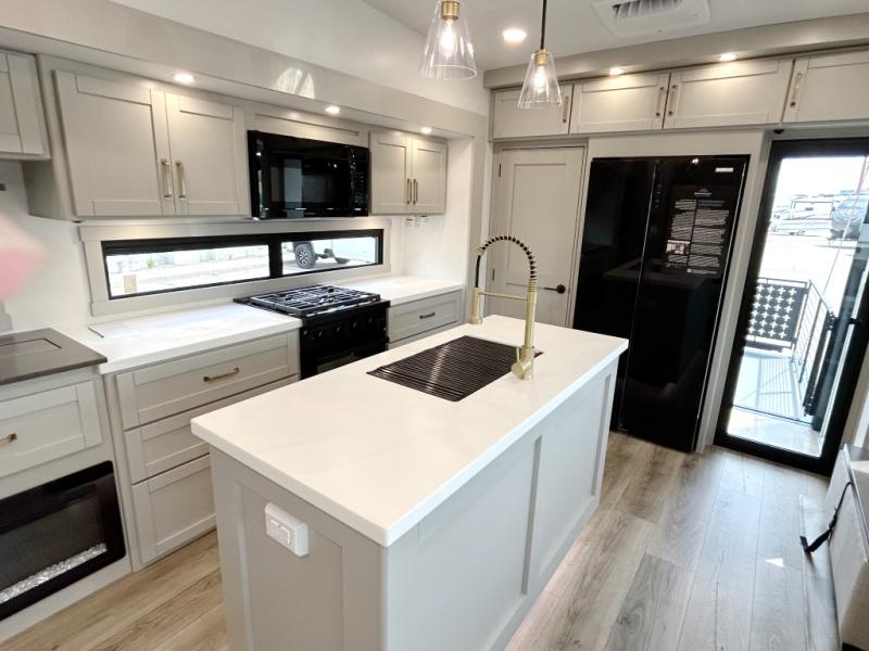 You're going to love every minute spent in this triple slide out fifth wheel! Once you arrive at the campground, you can put out the two side awnings, set up the rear patio and awning, then make lunch on the outdoor kitchen! There is also an outdoor TV here, a bar sink, and a refrigerator to keep drinks close by! Inside, the chef will find everything they need if the weather isn't cooperating, including a 30" residential microwave, 16 cu. ft. refrigerator, plus a large kitchen island, complete with dual trash bins and dog bowls at the foot. Your crew can get cozy on the tri-fold sofa that extends to a 54" x 70" bed size for guests, and there is theater seating across from the televator and fireplace for easy viewing! You will find the front private bedroom ultra accommodating with its king bed slide out, sliding dresser top with hidden storage, your own TV, and a front wardrobe with shelves and a shoe rack. There is even washer and dryer prep if you want the option to make laundry day that much easier! This pre-production preview model is subject to feature and layout changes.