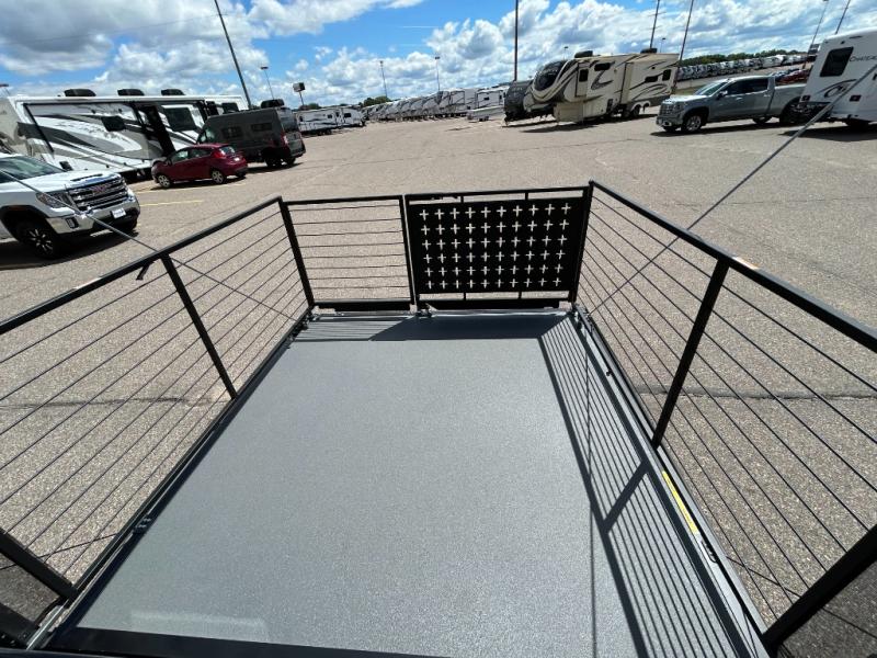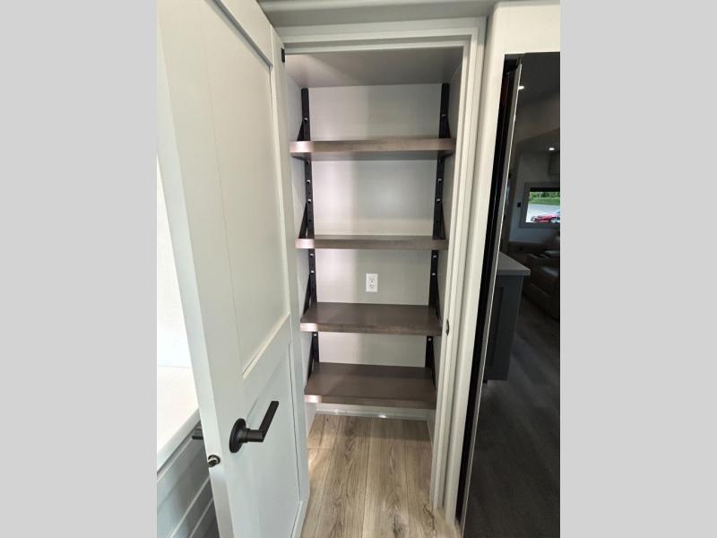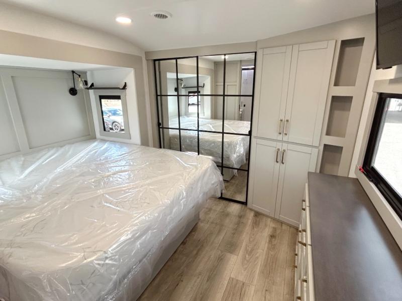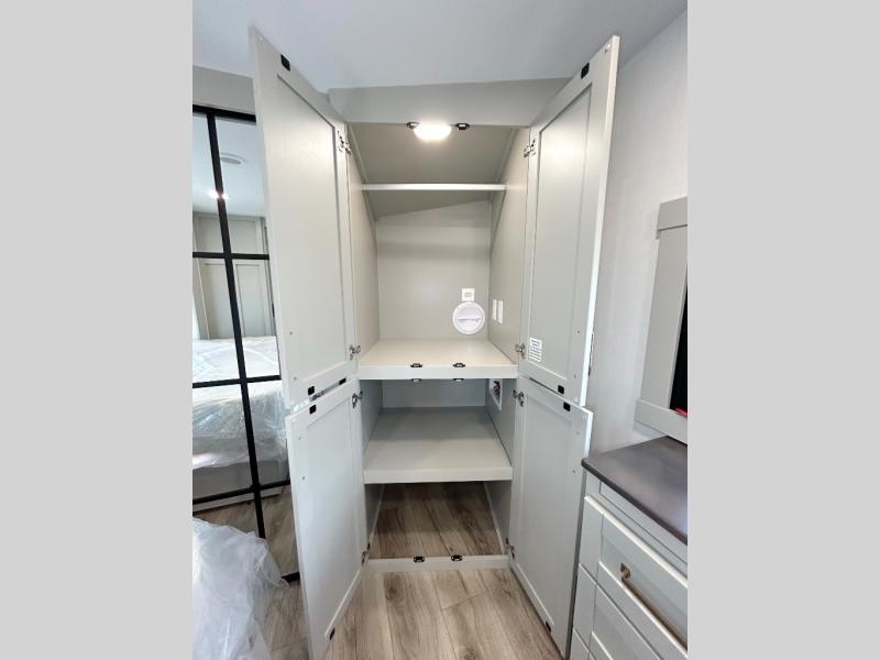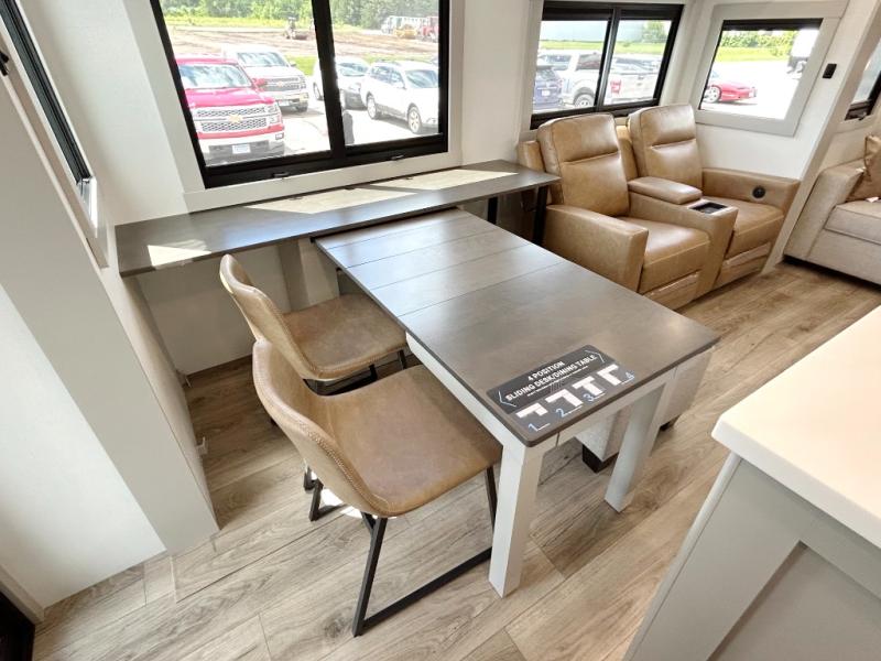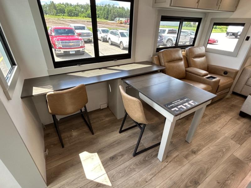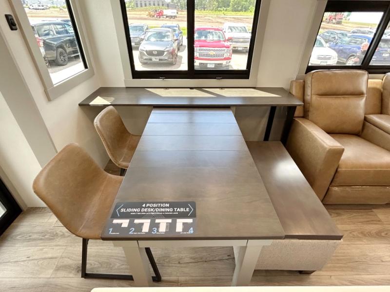 You're going to love every minute spent in this triple slide out fifth wheel! Once you arrive at the campground, you can put out the two side awnings, set up the rear patio and awning, then make lunch on the outdoor kitchen! There is also an outdoor TV here, a bar sink, and a refrigerator to keep drinks close by! Inside, the chef will find everything they need if the weather isn't cooperating, including a 30" residential microwave, 16 cu. ft. refrigerator, plus a large kitchen island, complete with dual trash bins and dog bowls at the foot. Your crew can get cozy on the tri-fold sofa that extends to a 54" x 70" bed size for guests, and there is theater seating across from the televator and fireplace for easy viewing! You will find the front private bedroom ultra accommodating with its king bed slide out, sliding dresser top with hidden storage, your own TV, and a front wardrobe with shelves and a shoe rack. There is even washer and dryer prep if you want the option to make laundry day that much easier! This pre-production preview model is subject to feature and layout changes.
