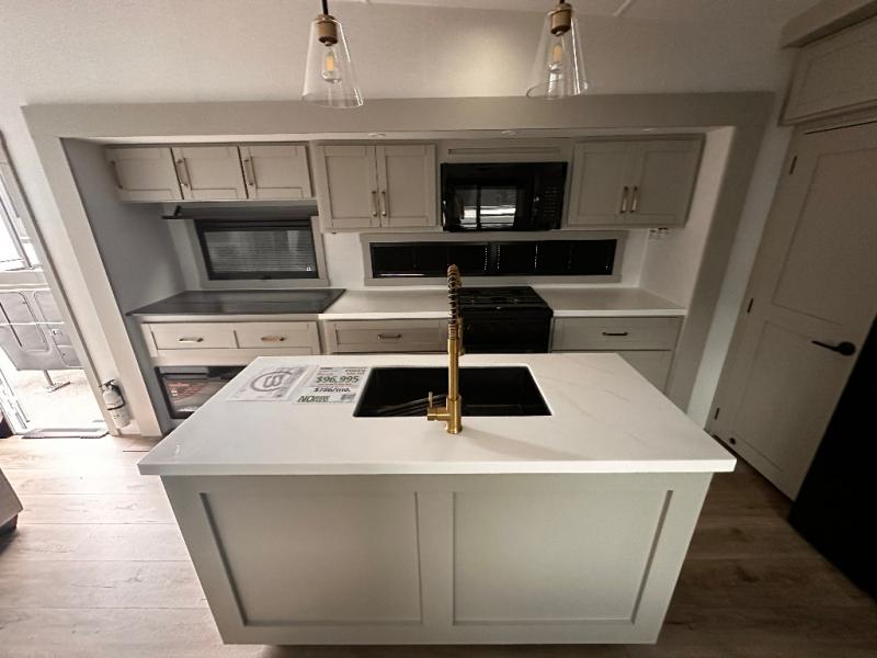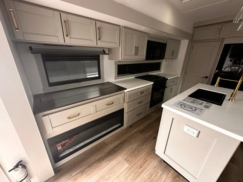 You're going to love every minute spent in this triple slide out fifth wheel! Once you arrive at the campground, you can put out the two side awnings, set up the rear patio and awning, then make lunch on the outdoor kitchen! There is also an outdoor TV here, a bar sink, and a refrigerator to keep drinks close by! Inside, the chef will find everything they need if the weather isn't cooperating, including a 30" residential microwave, 16 cu. ft. refrigerator, plus a large kitchen island, complete with dual trash bins and dog bowls at the foot. Your crew can get cozy on the tri-fold sofa that extends to a 54" x 70" bed for guests, and there is theater seating across from the televator and fireplace for easy viewing! You will find the front private bedroom ultra accommodating with its king bed slide out, sliding dresser top with hidden storage, your own TV, and a front wardrobe with shelves and a shoe rack. There is even washer and dryer prep if you want the option to make laundry day that much easier!