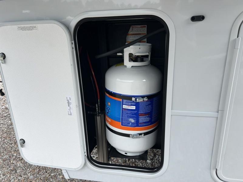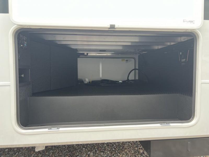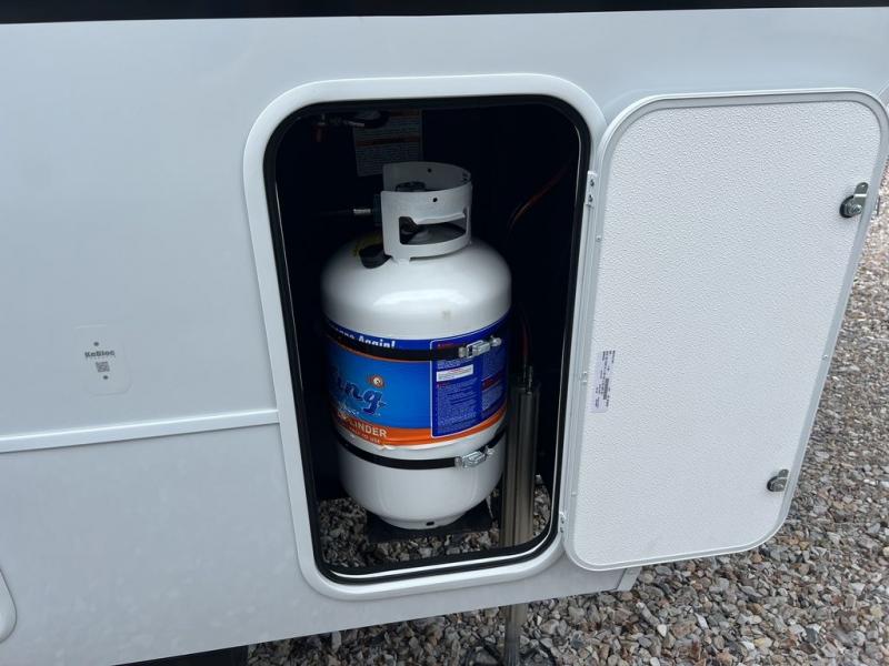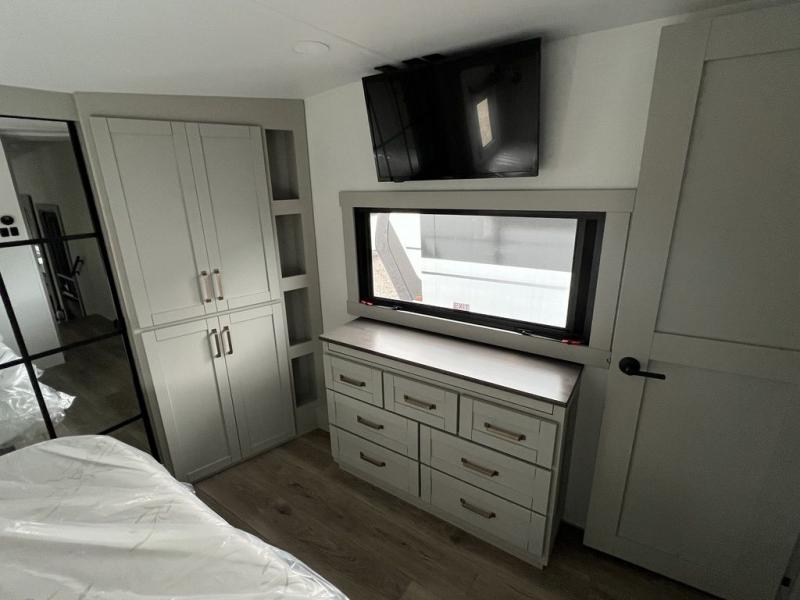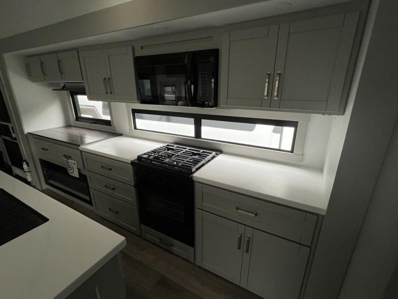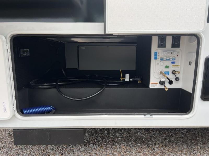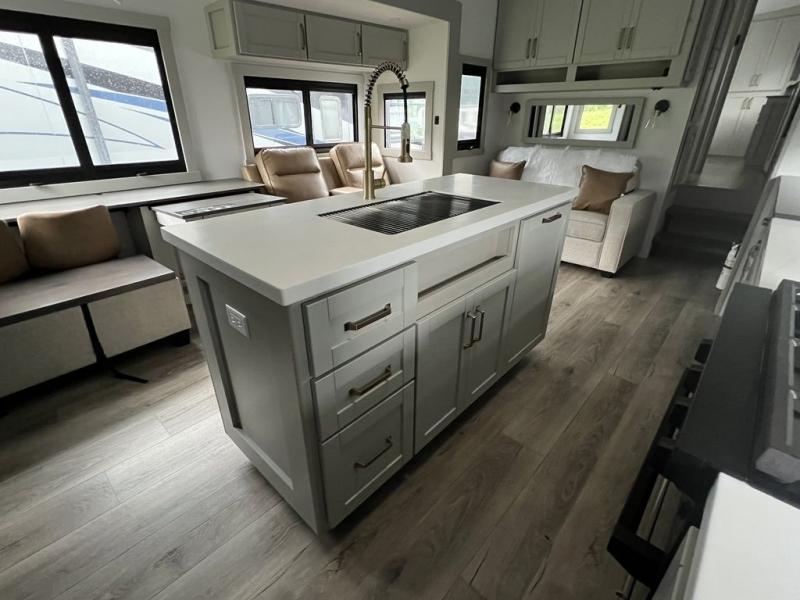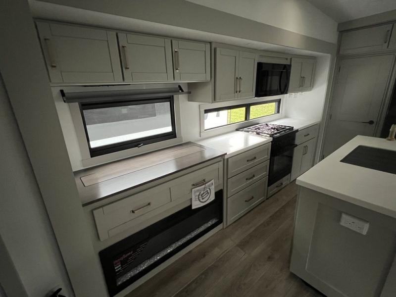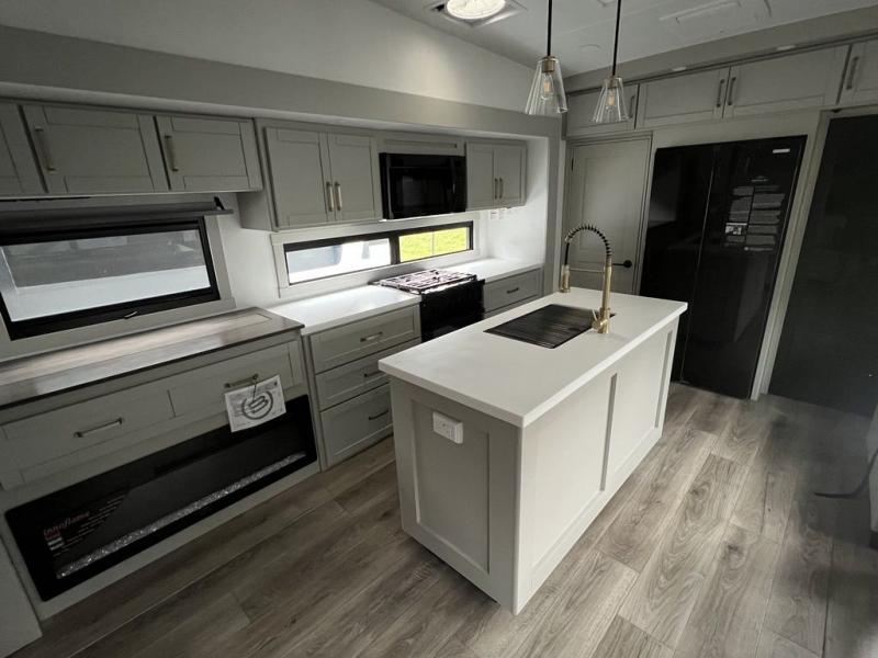You're going to love every minute spent in this triple slide out fifth wheel! Once you arrive at the campground, you can put out the two side awnings, set up the rear patio and awning, then make lunch on the outdoor kitchen! There is also an outdoor TV here, a bar sink, and a refrigerator to keep drinks close by! Inside, the chef will find everything they need if the weather isn't cooperating, including a 30" residential microwave, 16 cu. ft. refrigerator, plus a large kitchen island, complete with dual trash bins and dog bowls at the foot. Your crew can get cozy on the tri-fold sofa that extends to a 54" x 70" bed for guests, and there is theater seating across from the televator and fireplace for easy viewing! You will find the front private bedroom ultra accommodating with its king bed slide out, sliding dresser top with hidden storage, your own TV, and a front wardrobe with shelves and a shoe rack. There is even washer and dryer prep if you want the option to make laundry day that much easier!