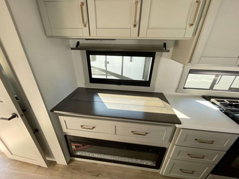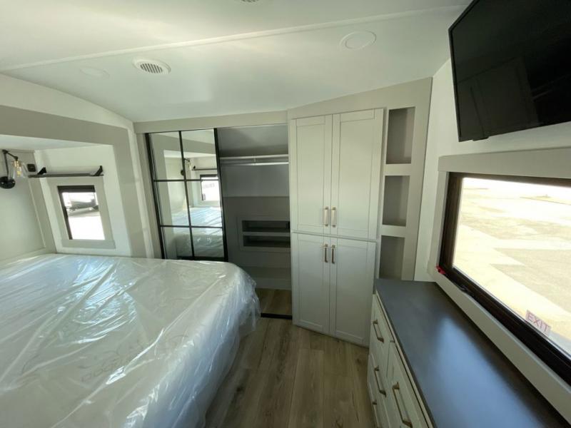 If you're looking for a feature-packed fifth wheel, this is the one! The rear multipurpose flex space can be used as an office/butler's pantry/laundry room/mudroom! There is an adjustable-height desk, storage space, plus washer and dryer prep. One of the dual entry doors is even found here for added convenience. The combined middle kitchen and living room includes dual opposing slides, a tri-fold sofa, theater seating, and a sliding desk/dining table. There is also a televator and fireplace, kitchen island with pet bowls, and an 84" pantry with adjustable shelving to name a few more features. A full bath towards the front includes a 30" x 42" shower, and the front private bedroom will feel just like home with its king bed slide out. There is also a sliding dresser top with hidden storage, bedside shelves, a front wardrobe, and washer and dryer prep here also!