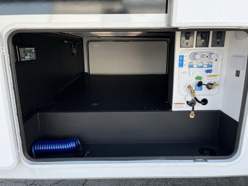 If you're looking for a feature-packed fifth wheel, this is the one! The rear multipurpose flex space can be used as an office/butler's pantry/laundry room/mudroom! There is an adjustable-height desk, storage space, plus washer and dryer prep. One of the dual entry doors is even found here for added convenience. The combined middle kitchen and living room includes dual opposing slides, a tri-fold sofa, theater seating, and a sliding desk/dining table. There is also a televator and fireplace, kitchen island with pet bowls, and an 84" pantry with adjustable shelving to name a few more features. A full bath towards the front includes a 30" x 42" shower, and the front private bedroom will feel just like home with its king bed slide out. There is also a sliding dresser top with hidden storage, bedside shelves, a front wardrobe, and washer and dryer prep here also!
