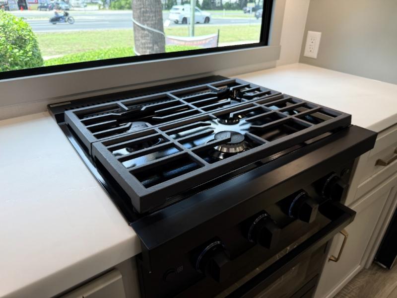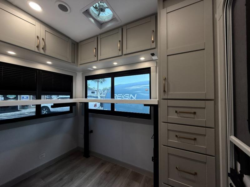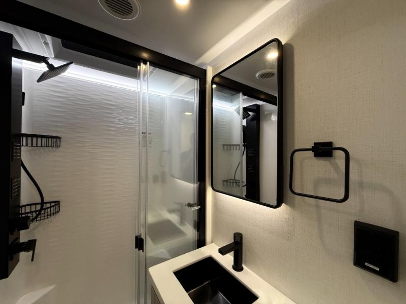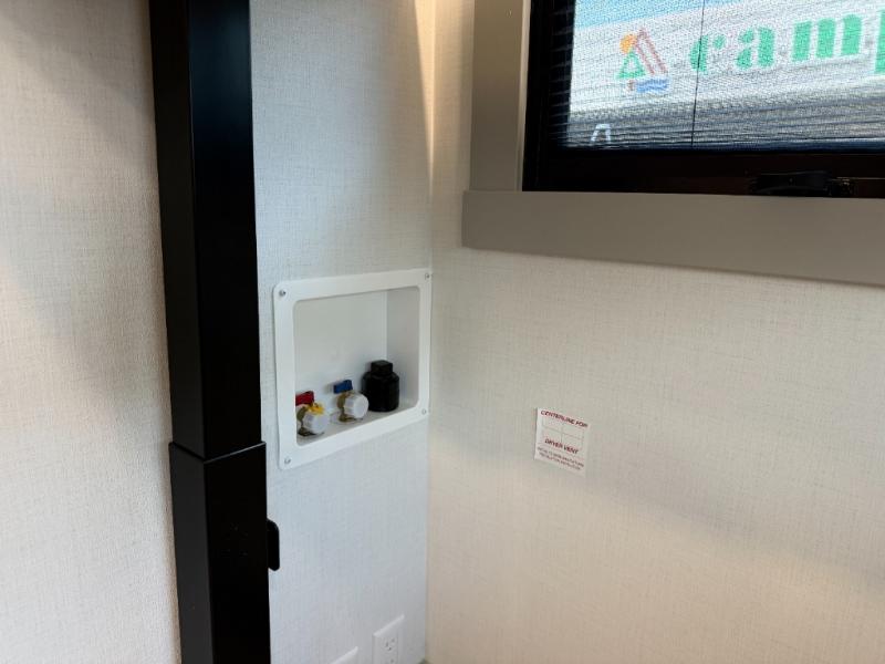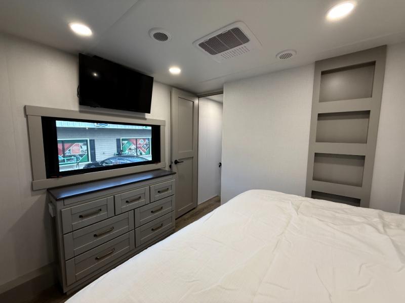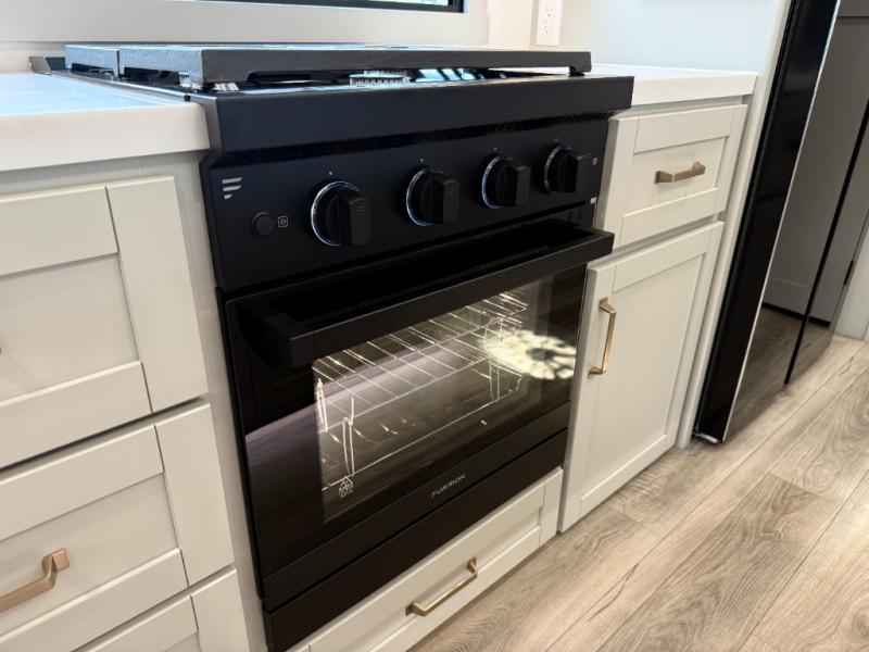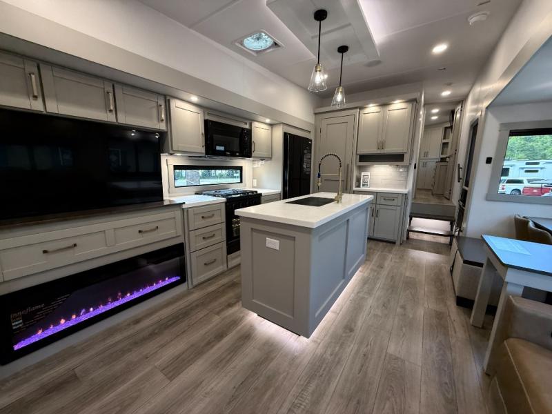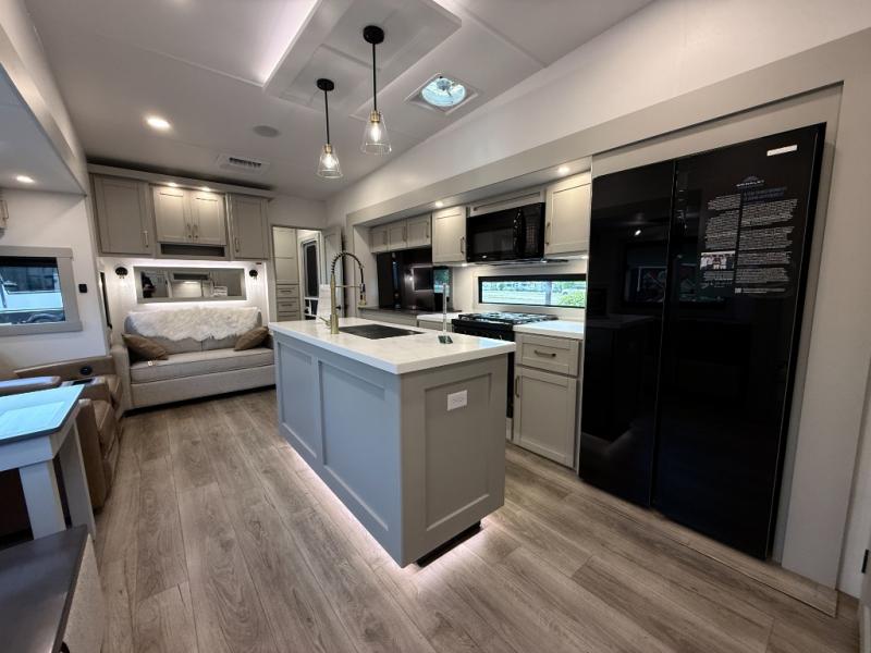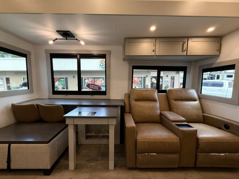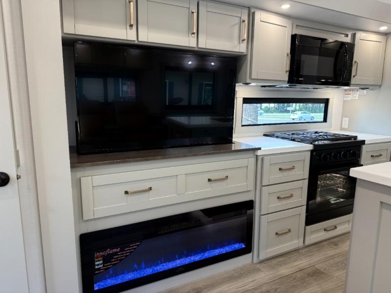 This premium fifth wheel delivers high-end residential comfort with next-level versatility. The rear flex room features a second entry door, washer/dryer prep, adjustable-height desk, and ample storage—perfect as an office, butler's pantry, or mudroom. In the main living area, enjoy dual opposing slides, a tri-fold sofa, theater seating, fireplace, and televator for a clean look. The sliding desk/table adapts for work or dining.