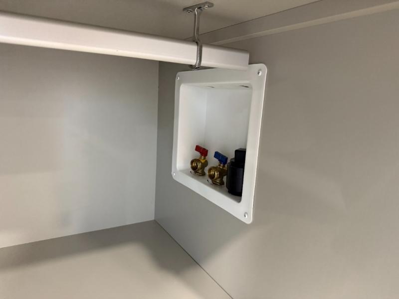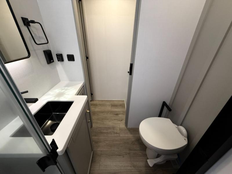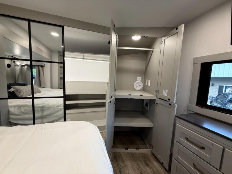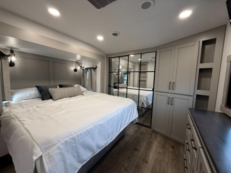 Storage is no issue with the 84" adjustable pantry, rear pass-thru compartment, and sliding dresser top with hidden storage in the bedroom. The king bed slide offers luxury rest, while the front wardrobe and extra washer/dryer prep provide practical convenience. A spacious full bath with 30" x 42" shower completes the home-like feel.