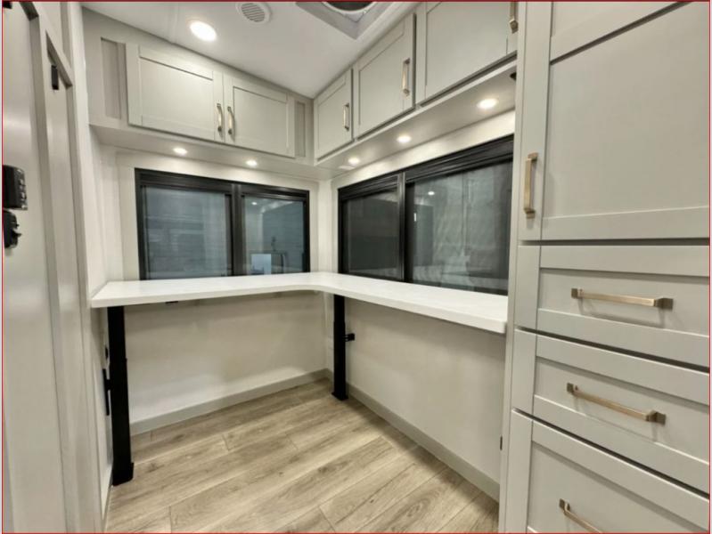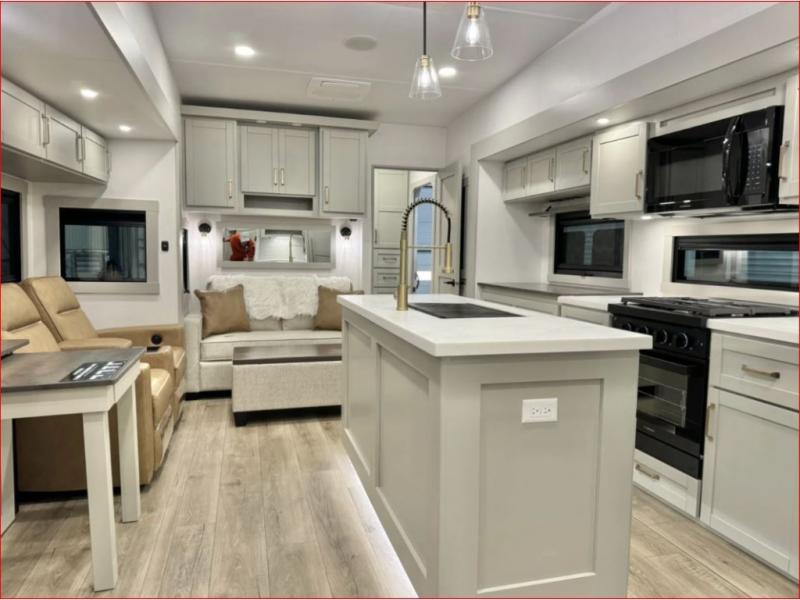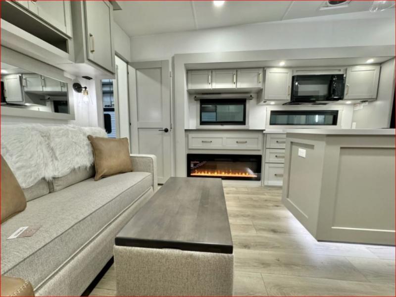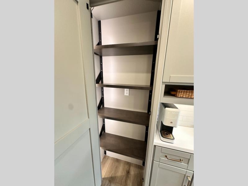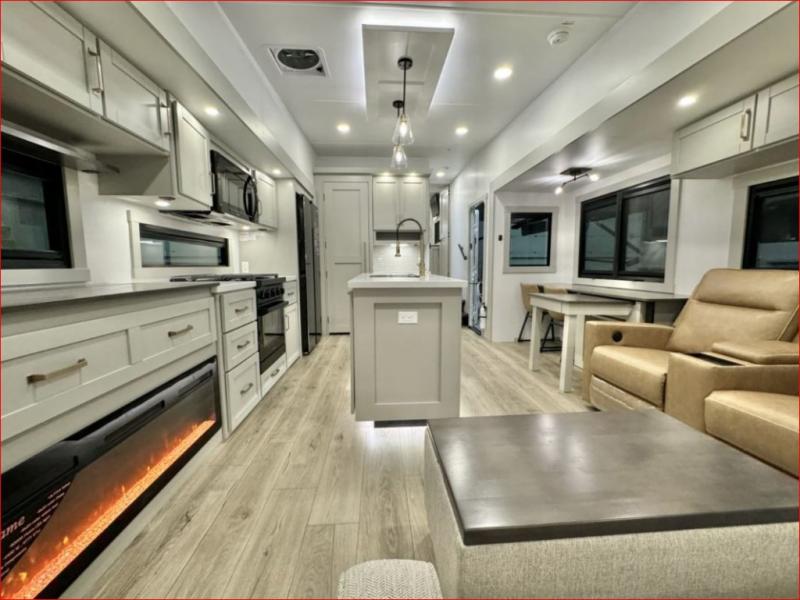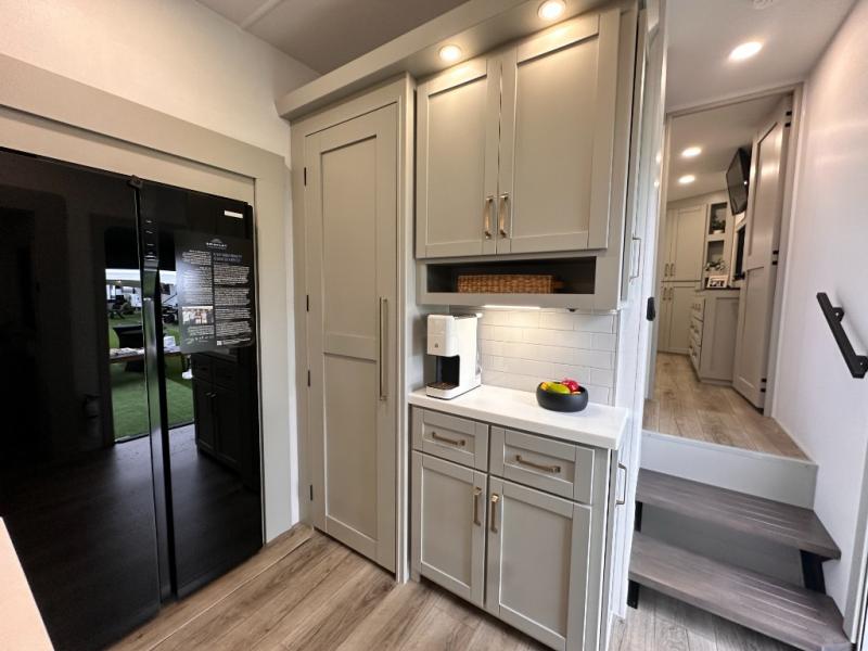If you're looking for a feature-packed fifth wheel, this is the one! The rear multipurpose flex space can be used as an office/butler's pantry/laundry room/mudroom! There is an adjustable-height desk, storage space, plus washer and dryer prep. One of the dual entry doors is even found here for added convenience. The combined middle kitchen and living room includes dual opposing slides, a tri-fold sofa, theater seating, and a sliding desk/dining table. There is also a televator and fireplace, kitchen island with pet bowls, and an 84" pantry with adjustable shelving to name a few more features. A full bath towards the front includes a 30" x 42" shower, and the front private bedroom will feel just like home with its king bed slide out. There is also a sliding dresser top with hidden storage, bedside shelves, a front wardrobe, and washer and dryer prep here also!