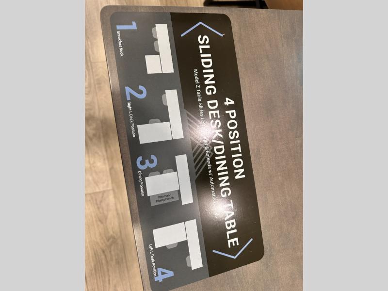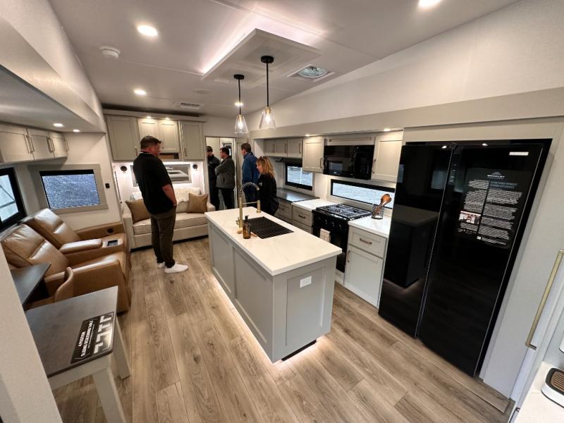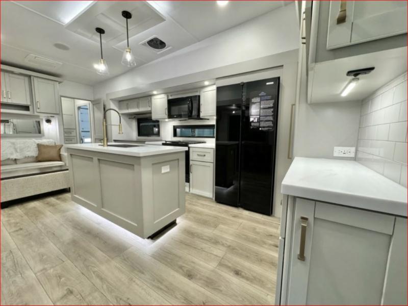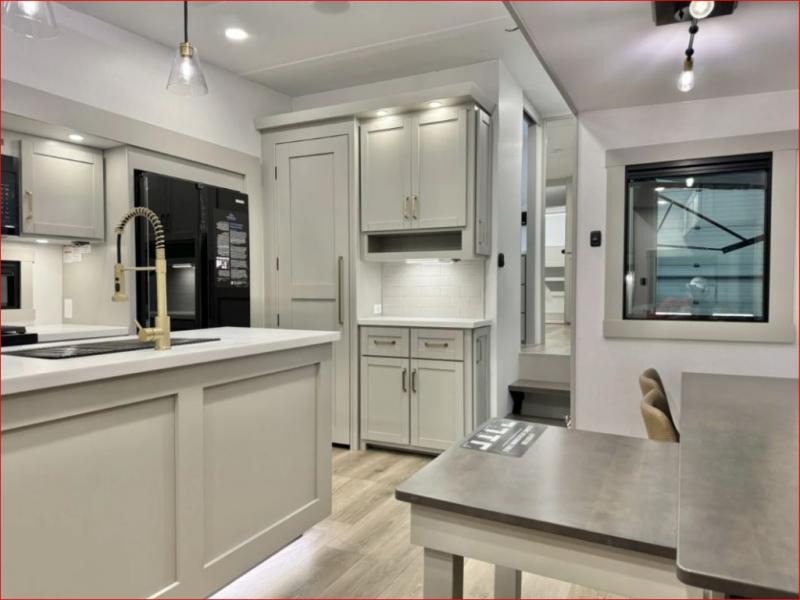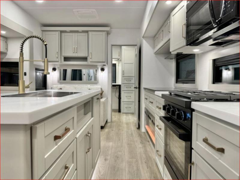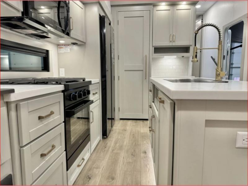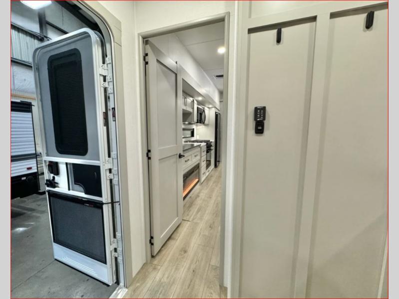 If you're looking for a feature-packed fifth wheel, this is the one! The rear multipurpose flex space can be used as an office/butler's pantry/laundry room/mudroom! There is an adjustable-height desk, storage space, plus washer and dryer prep. One of the dual entry doors is even found here for added convenience. The combined middle kitchen and living room includes dual opposing slides, a tri-fold sofa, theater seating, and a sliding desk/dining table. There is also a televator and fireplace, kitchen island with pet bowls, and an 84" pantry with adjustable shelving to name a few more features. A full bath towards the front includes a 30" x 42" shower, and the front private bedroom will feel just like home with its king bed slide out. There is also a sliding dresser top with hidden storage, bedside shelves, a front wardrobe, and washer and dryer prep here also!