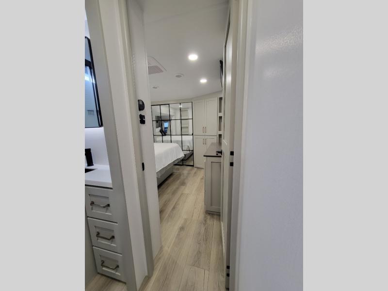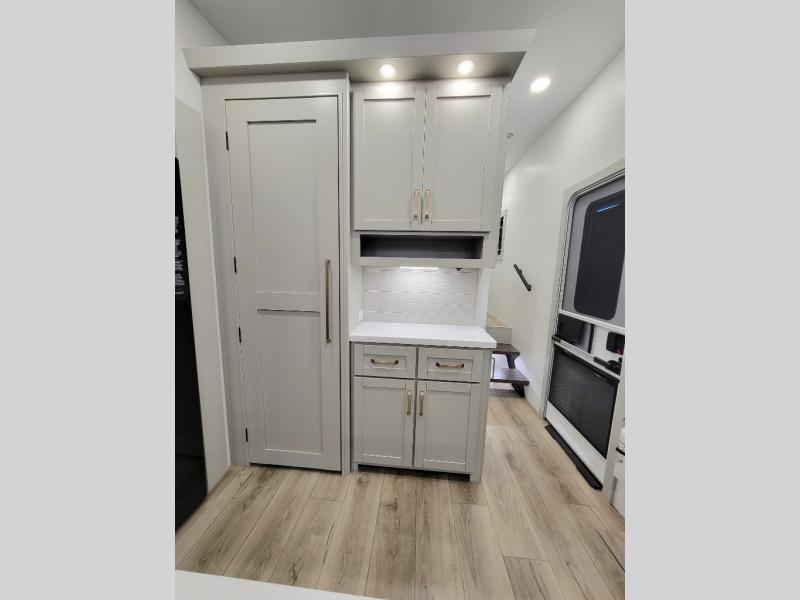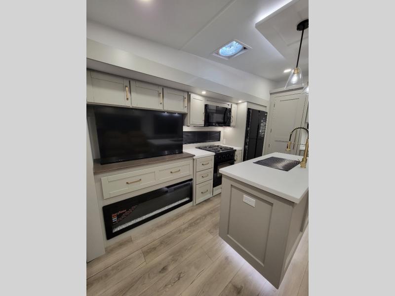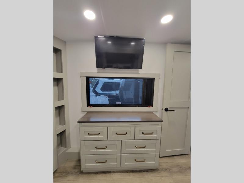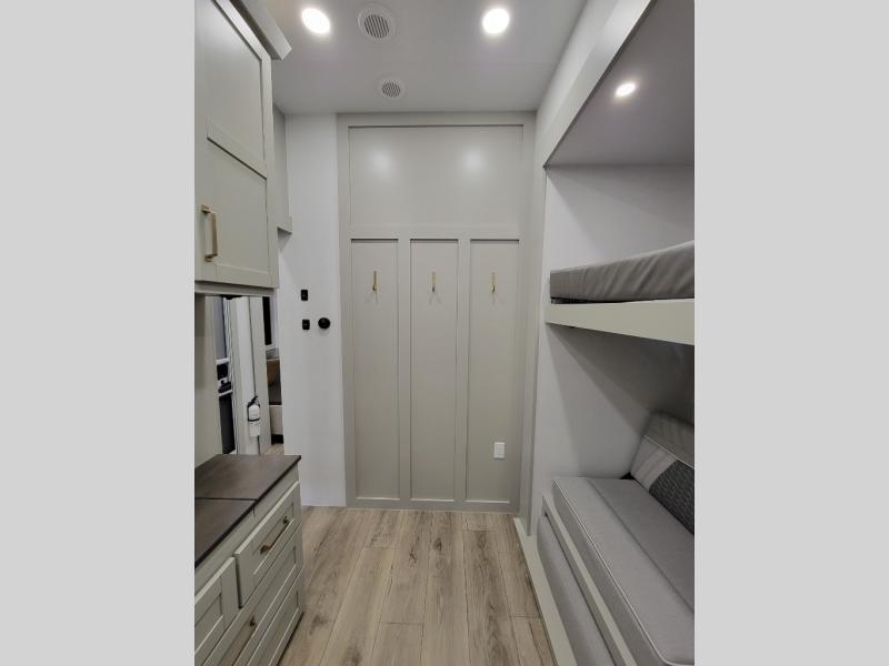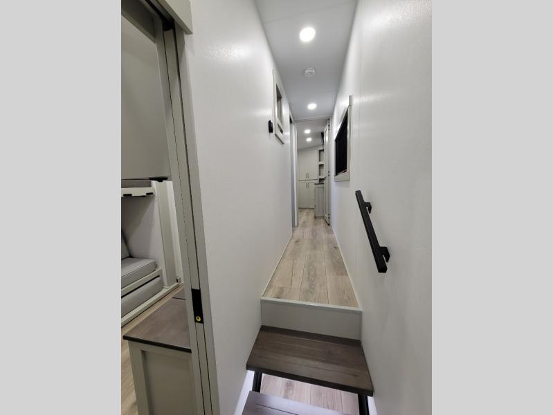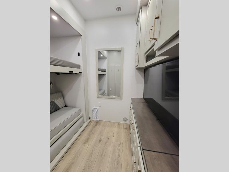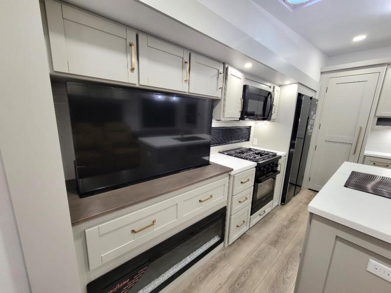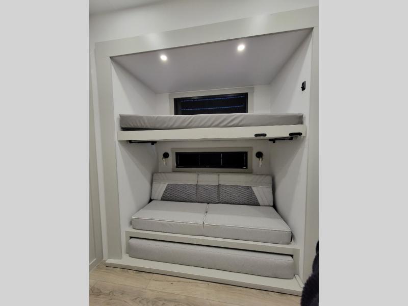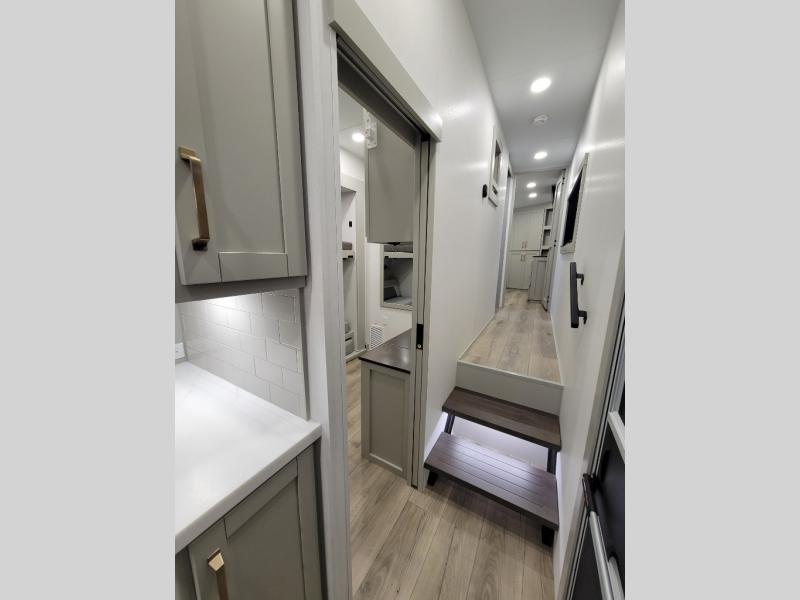 This unit is perfect for your family that needs sleeping space for eight! There is ample seating with a sliding desk/dining table, 62" theater seating, and a 72" tri-fold sofa along the rear wall. You can easily relax and enjoy the telescoping TV with a cozy fireplace below. The kitchen offers all that you need to prepare and cook meals just like home with a 16 cu. ft. refrigerator for your perishables, a 30" residential microwave oven, and three burner range top and oven. You will love the kitchen island all outfitted with pull-out pet bowls and double pull out trash bins with an integrated Stow & Go paper towel holder. There is also an 84" pantry with adjustable shelves for all of your canned and dry goods. Mid-coach, just ahead through the main entry, is a bonus room that can be used as a bedroom featuring a sofa bed with flip-up overhead bunk and trundle below, or an office with pull-out desk so that you can work easily while you travel, or it could also be used as a gaming room since there is also a 50" Smart TV. Head up the steps to a bathroom on your left and a private master suite with king bed slide all the way up front. A sliding dresser top features hidden storage which is perfect for jewelry and other personal belongings. The front wardrobe features mirrored doors and the corner closet has been prepped for a stackable washer and dryer if you choose to add that option.