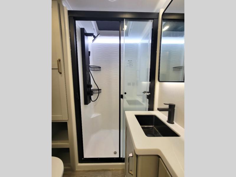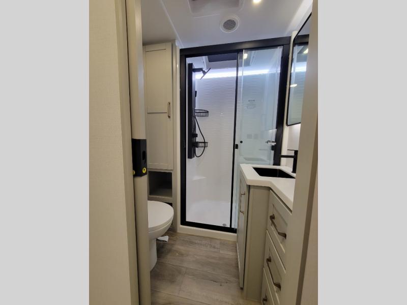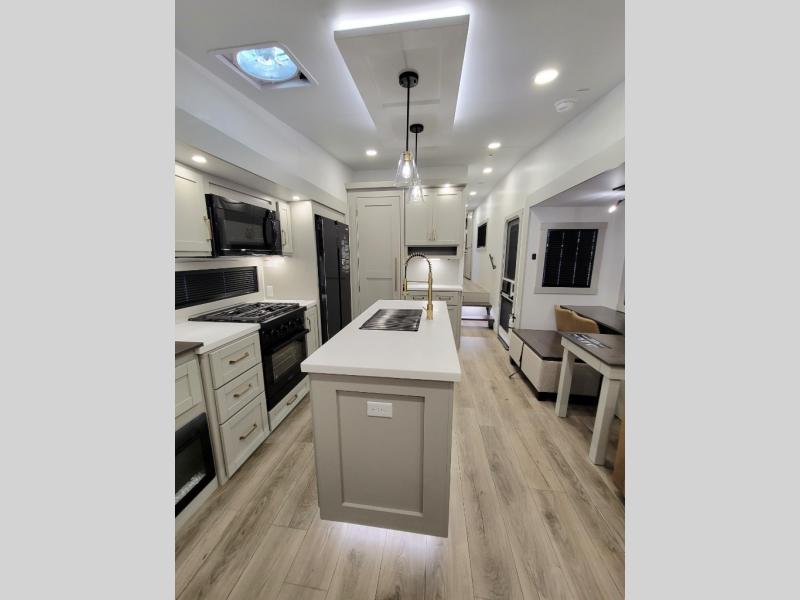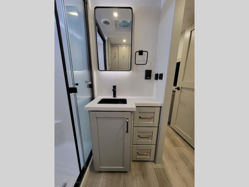 The Brinkley mid-profile Model Z fifth wheels bring you clean lines and an upscale look with plenty of style and exciting new features like the industry first brass plumbing connections. These units also feature an automotive grade front cap, plenty of exterior storage, dual exterior hot and cold showers, and wide stance leveling jacks for easy set up. Residential frameless windows provide a clean look and beautiful views, and ample electrical outlets and 6 USB/USB-C outlets allow all of your electronics and appliances to easily be used and charged.
