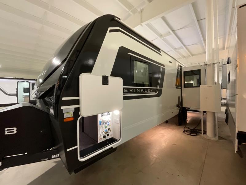 With any Model Z Air travel trailer by Brinkley, you will enjoy premium features at every turn. The industry-first low maintenance roof is sure to be appreciated, plus there are industry-first brass plumbing connections for excellent resistance to corrosion. The drop-frame chassis with over 100 cu. ft. of exterior storage will allow you to bring along camp gear galore, plus there are motion lighting and power outlets for added convenience! You'll also find two hot/cold showers outdoors, along with a 370-watt solar panel, a custom LP box with locked battery storage, and a premium utility center with a retractable 65' water hose to wash off mud from the lake. The interior is just as accommodating with its solid surface countertops, Brinkley CraftSense wood trim construction, integrated window screens and insulated blackout blinds, and the list of luxury features goes on!