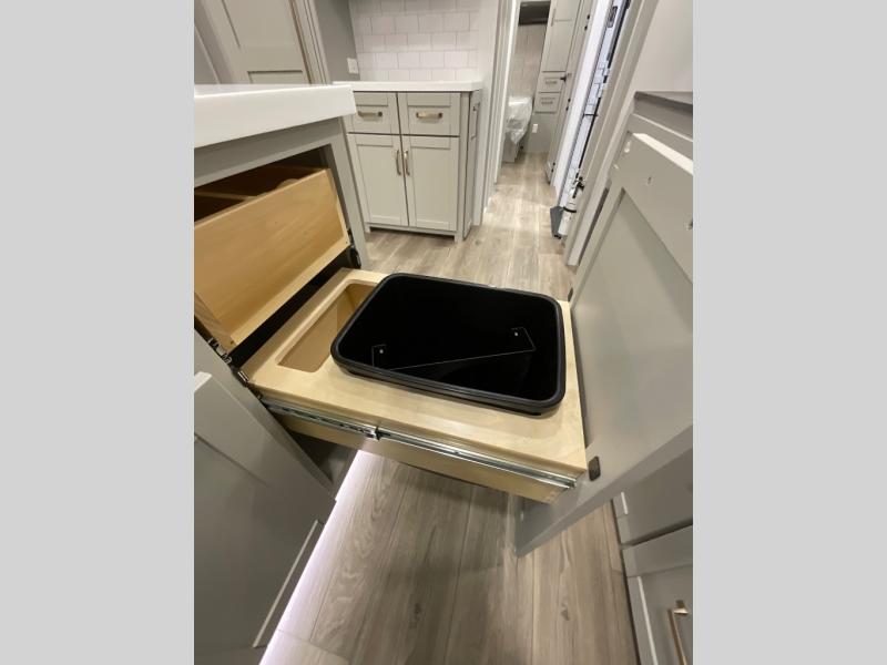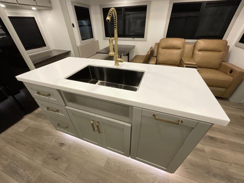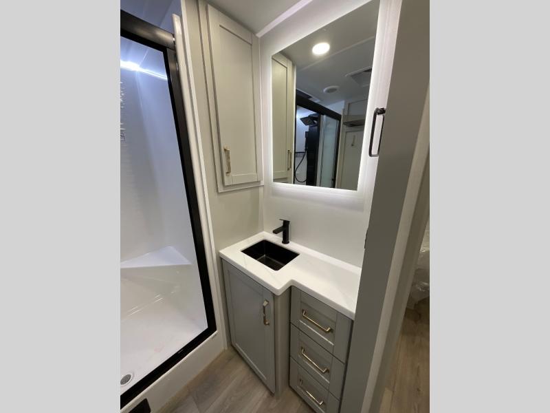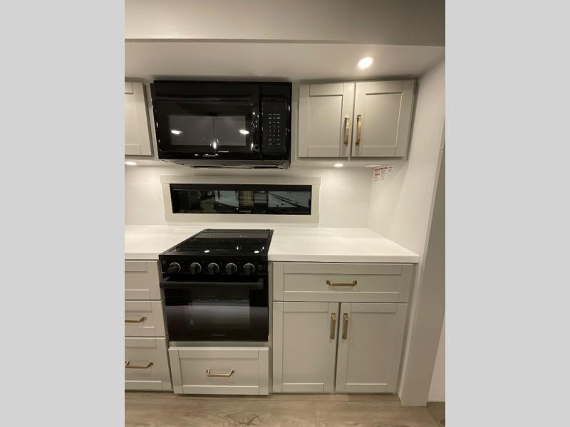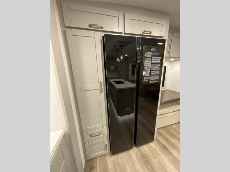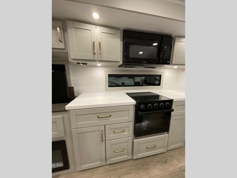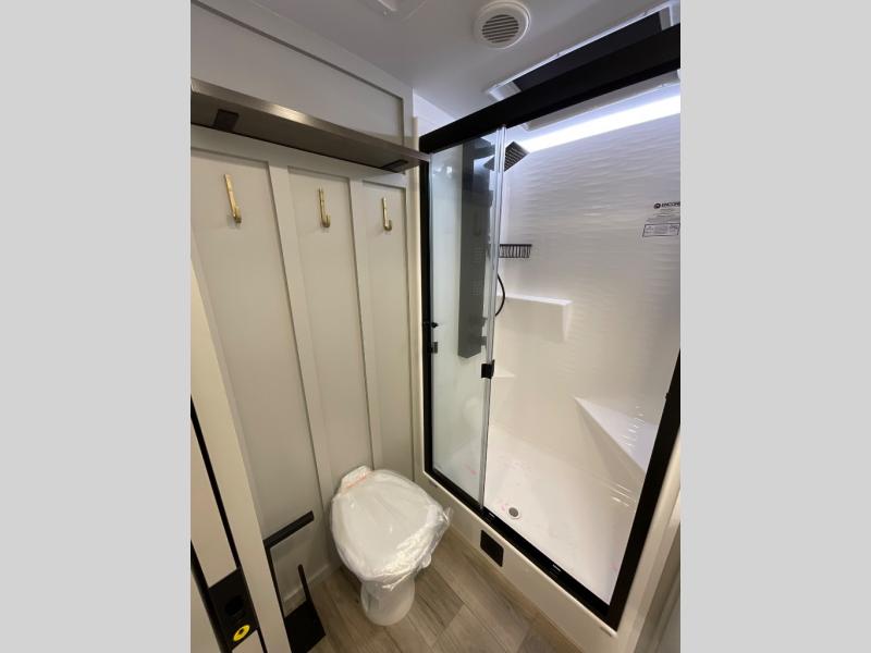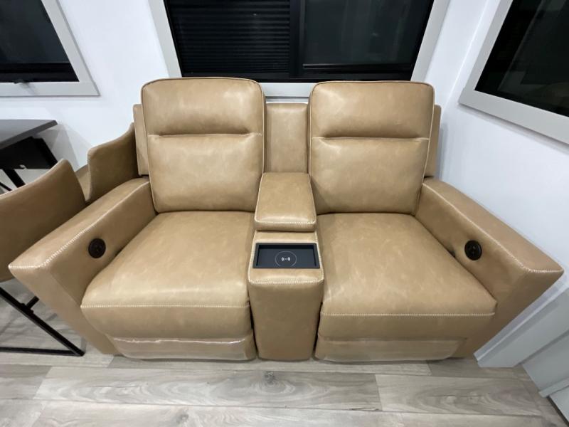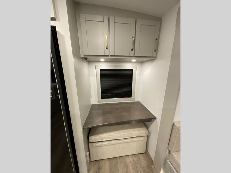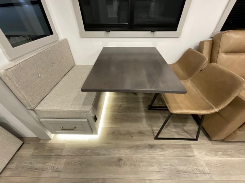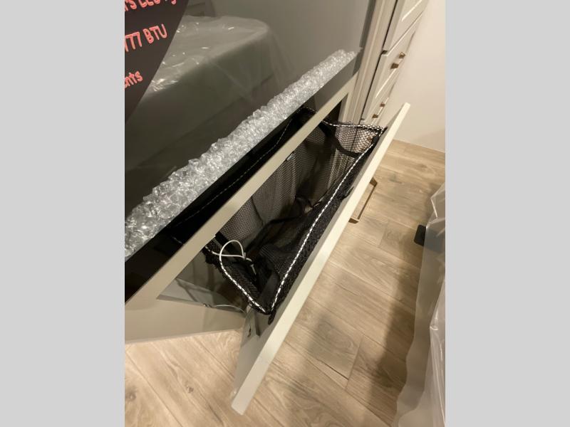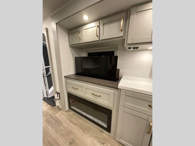 You are going to love every adventure in this cozy couples coach! In front, a private bedroom awaits you each night providing a comfortable place to get a good night sleep with built-in bedside and under bed storage including outlets and USB ports for your electronics. There are four drawers under the bed, two on each side for more clothing storage. There is also a fireplace in this room as well. A full bath next to the bedroom includes a 30" x 42" one-piece fiberglass shower so you can stay clean and refreshed throughout your trip. The combined kitchen and living area at the rear of the unit will be a favorite place to visit together since there is theater seating and a dinette with bench seat and two chairs. In the slide opposite, you will find a television and fireplace, that makes two fireplaces! You will also enjoy the kitchen island with bar stools, along with additional kitchen counter space, a pantry with adjustable shelves, and a spacious 16 cu. ft. refrigerator that can still open when the slide out is in. Head outside to find a drop-frame pass-thru storage and rear storage, two patio awnings, LED chassis lighting, quad step entry, and more!