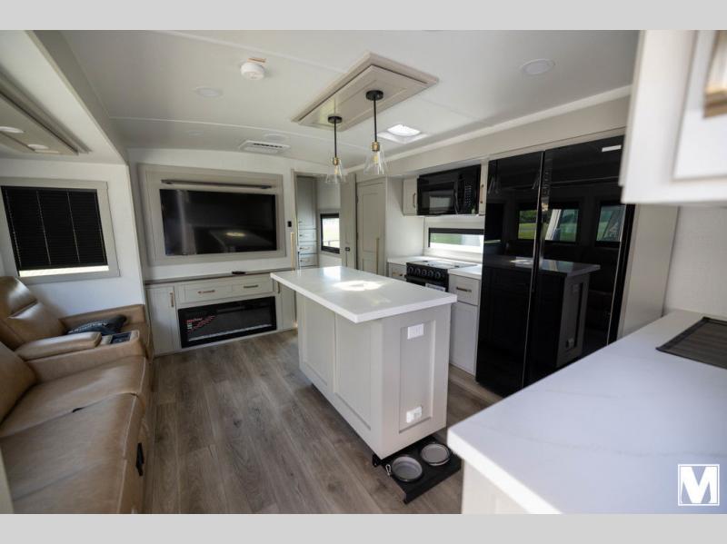 Camping with family or friends just got easier in this spacious travel trailer. There is a rear private bunkhouse with double-size bunks and storage space for your guests' things. You will appreciate your own space in the front private bedroom that includes a queen bed and built-in bedside storage with outlets and USB ports. And the full bath includes a 30" x 42" one-piece fiberglass shower so everyone can stay clean throughout your trip. The combined kitchen and living area will be a favorite place to visit together since there is theater seating with three recliners, a TV with swivel, plus a fireplace! You will also enjoy the kitchen island with bar stools and a flip-down bar, a pantry with adjustable shelves, and a spacious 16 cu. ft. refrigerator that can still open when the slide out is in. Head outside to find drop-frame pass-thru storage and rear storage, two patio awnings, LED chassis lighting, quad step entry, and more!