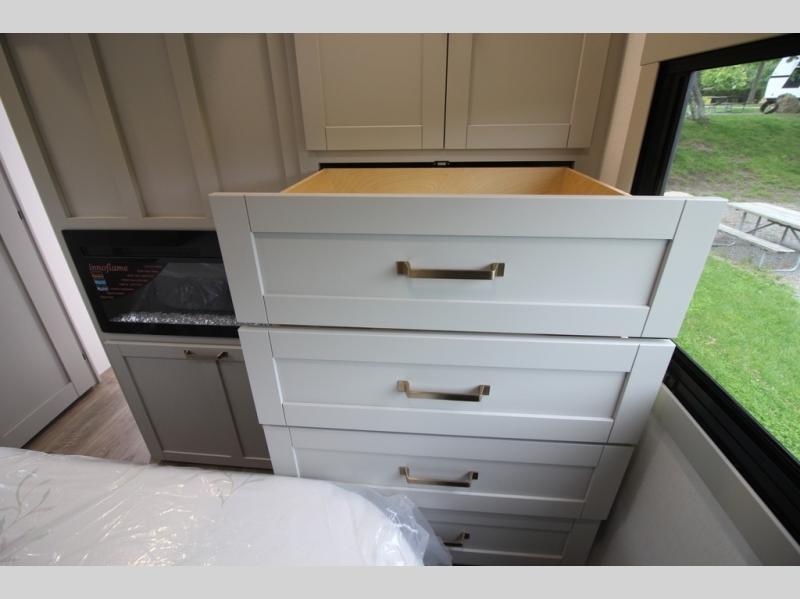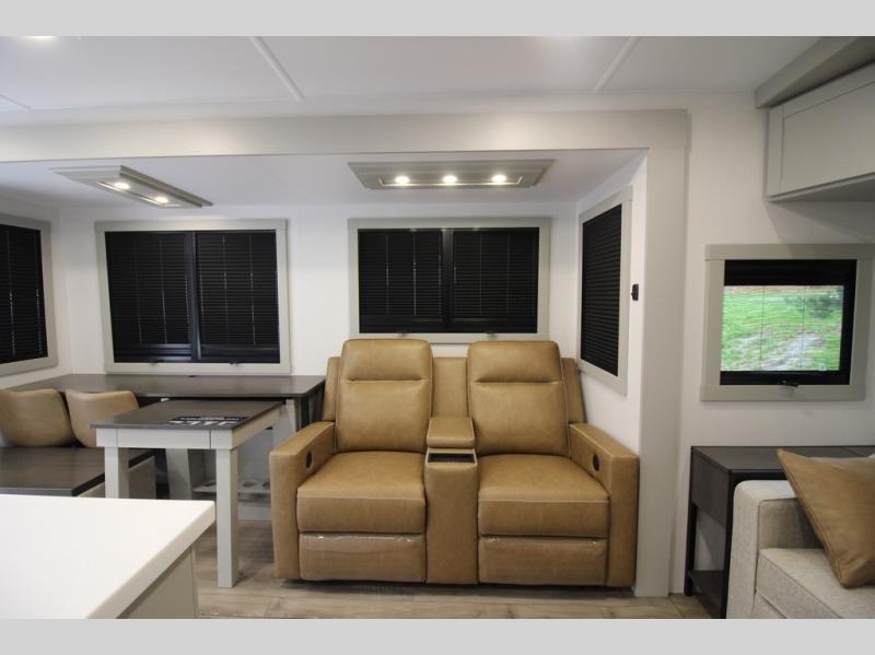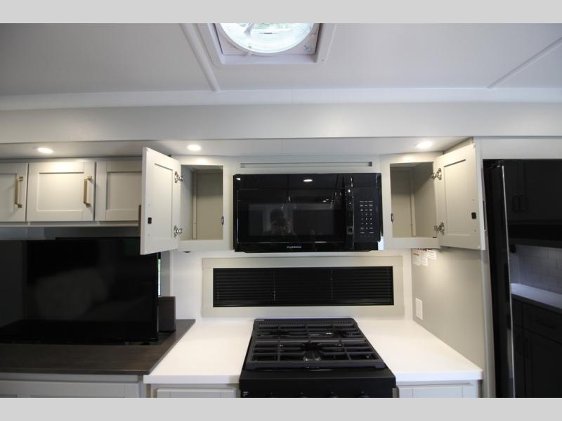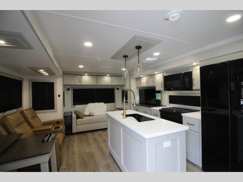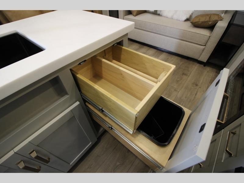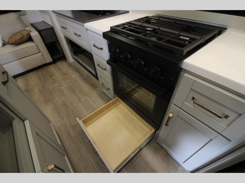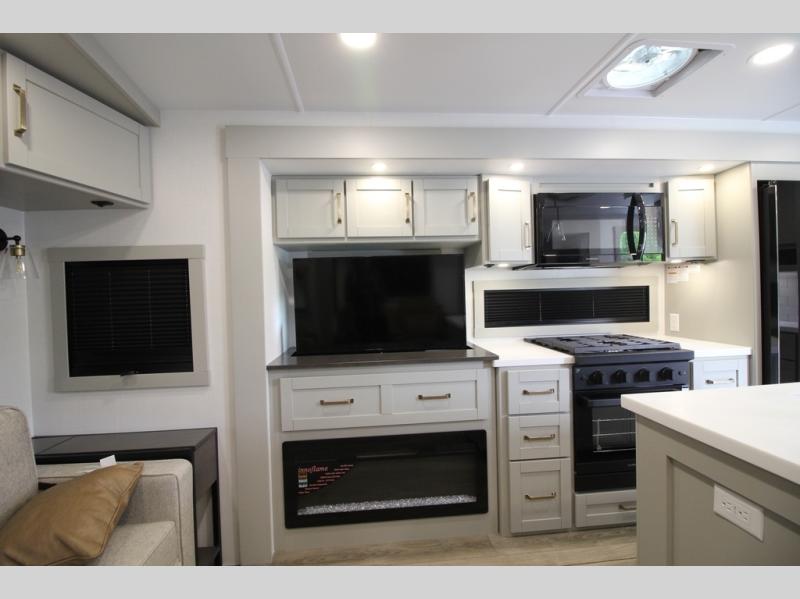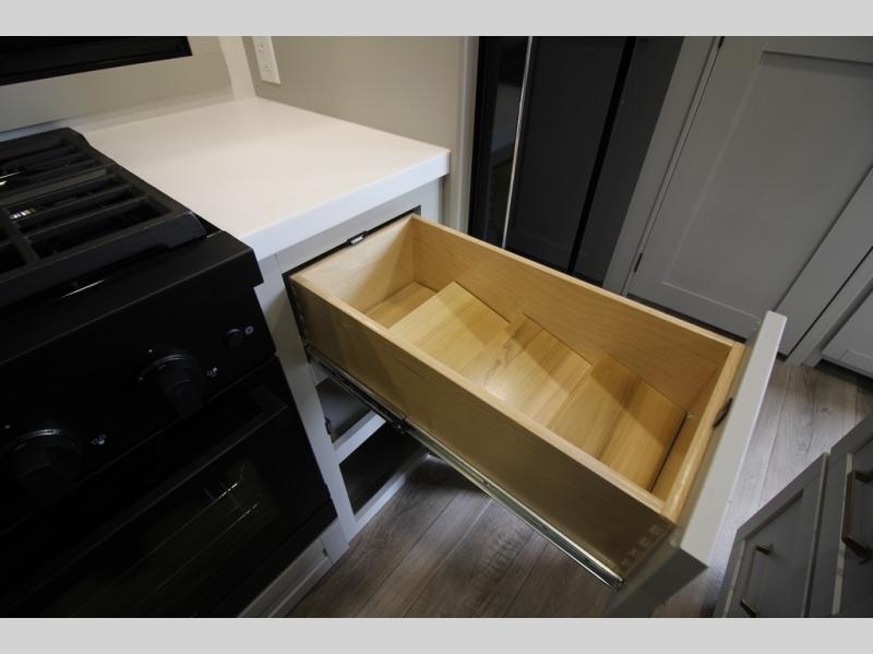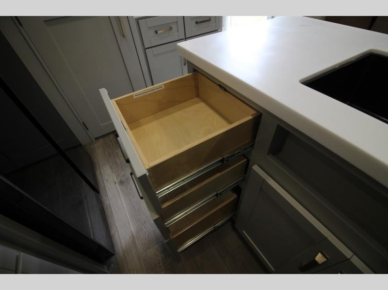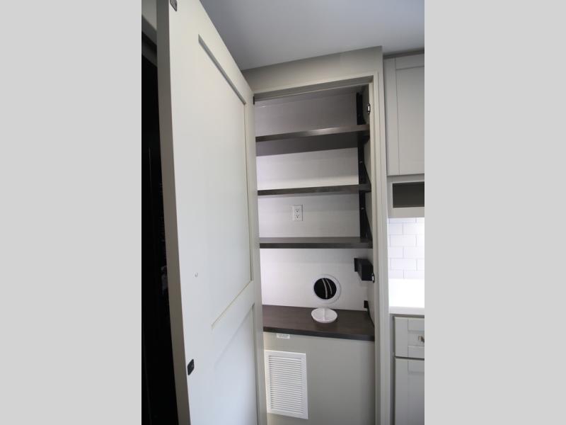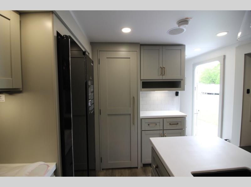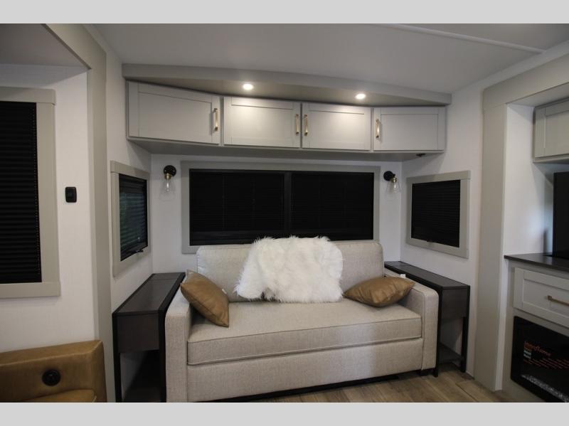 This travel trailer is spacious thanks to the dual opposing slides in the combined kitchen and living area. There is a rear 72" tri-fold sofa here, theater seating, and a sliding desk/dining table. The televator and fireplace will let you relax each evening with a movie or good book, and the full kitchen lets you make meals wherever you go. The chef of your group will also appreciate the pantry with adjustable shelving for all their ingredients, a hutch, 30" residential microwave, and even a pull-out trash bin for easy clean-up. When you're ready to call it a night, the front private bedroom will be waiting for you. This room includes a queen bed with four underbed drawers, a closet with pass-thru access to the bathroom closet, plus washer and dryer prep if you want the option to go full-time!