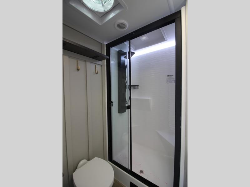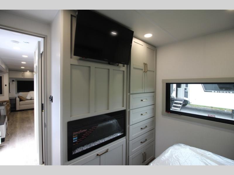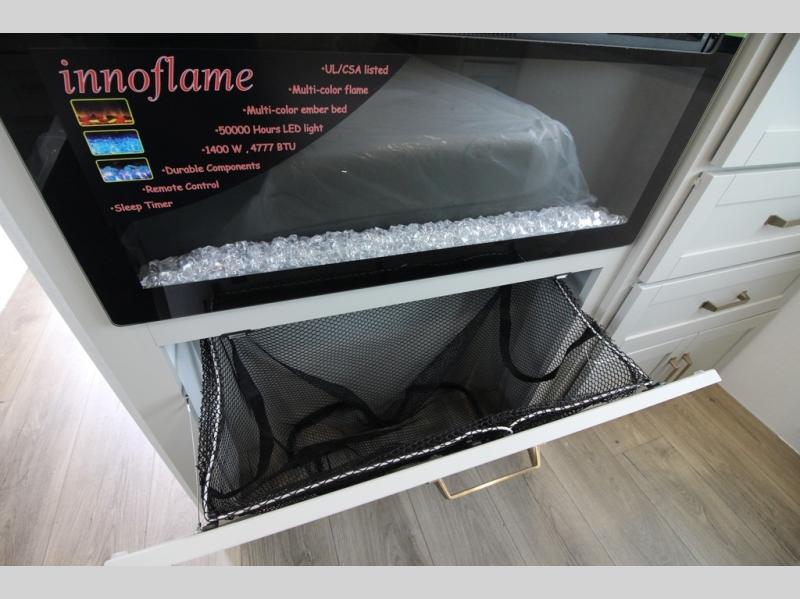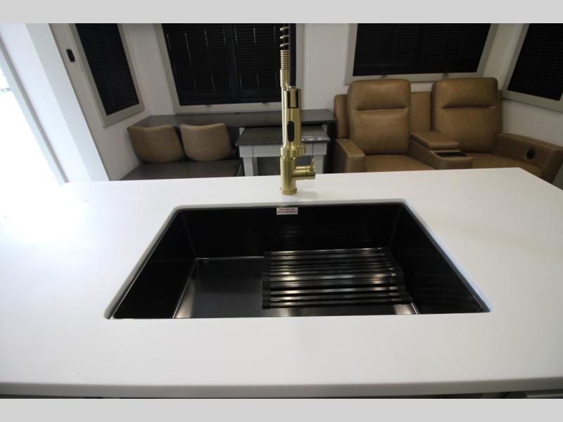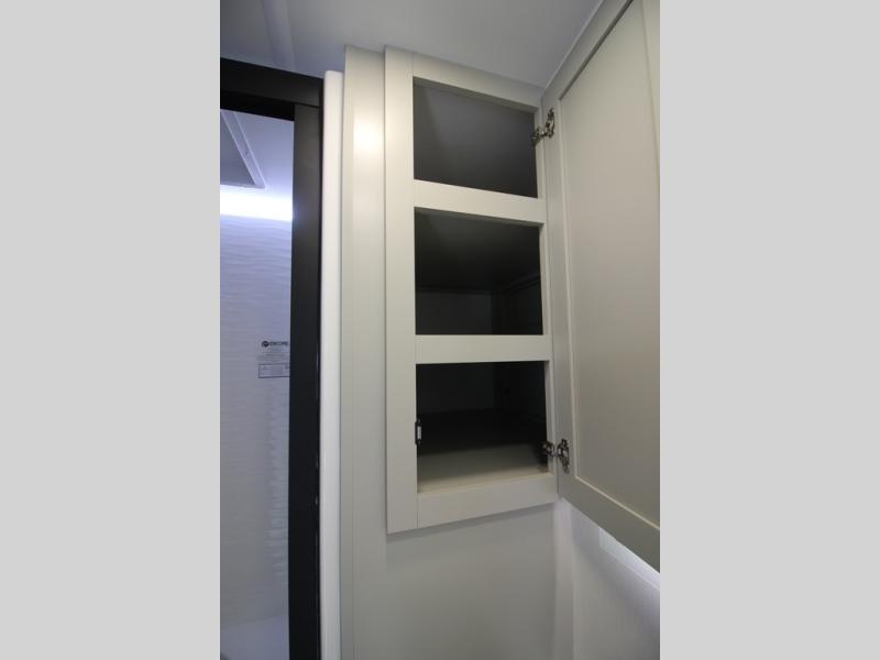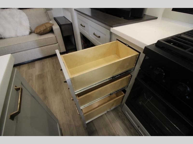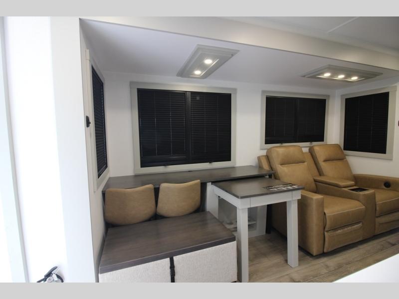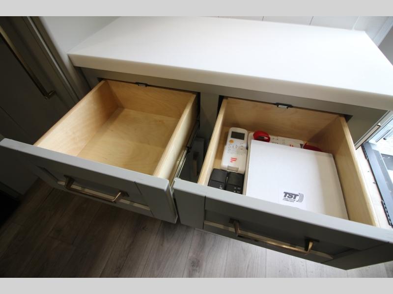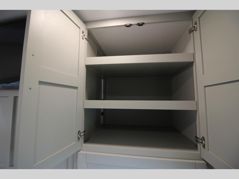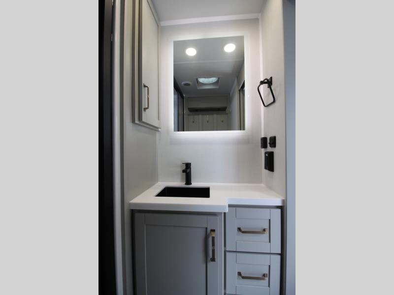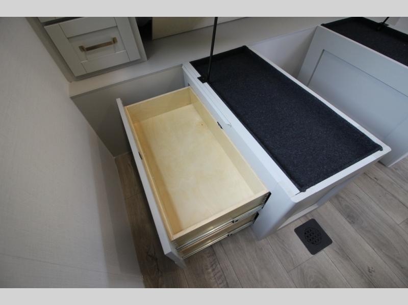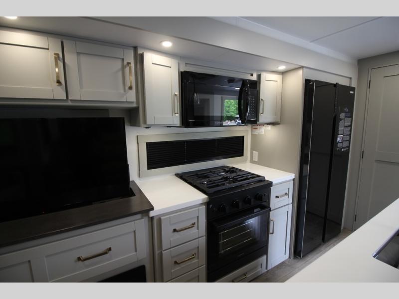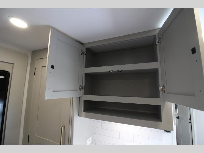 This travel trailer is spacious thanks to the dual opposing slides in the combined kitchen and living area. There is a rear 72" tri-fold sofa here, theater seating, and a sliding desk/dining table. The televator and fireplace will let you relax each evening with a movie or good book, and the full kitchen lets you make meals wherever you go. The chef of your group will also appreciate the pantry with adjustable shelving for all their ingredients, a hutch, 30" residential microwave, and even a pull-out trash bin for easy clean-up. When you're ready to call it a night, the front private bedroom will be waiting for you. This room includes a queen bed with four underbed drawers, a closet with pass-thru access to the bathroom closet, plus washer and dryer prep if you want the option to go full-time!
