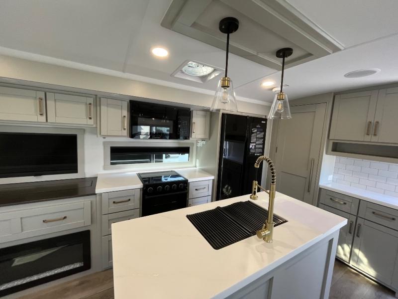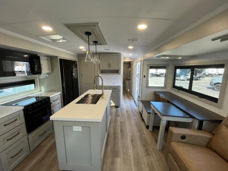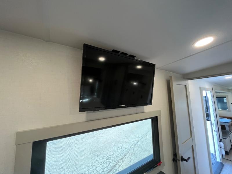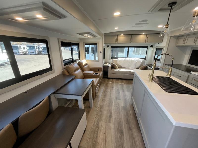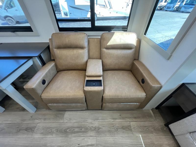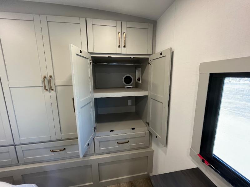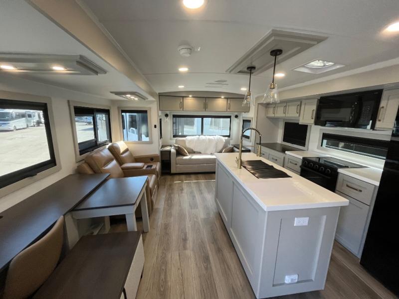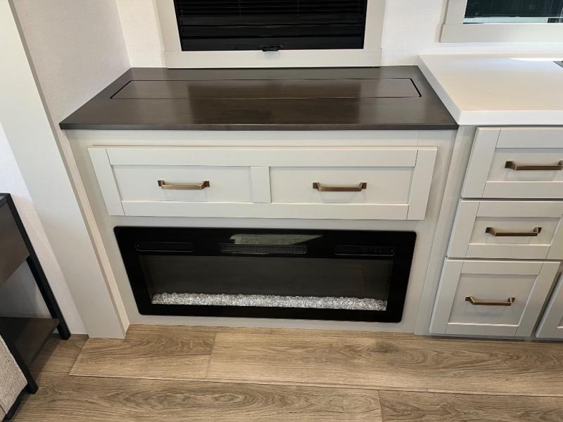 You will love all the space and features in this travel trailer! A luxurious rear living room offers plenty of room to spread out, with a 72" tri-fold sofa plus theater seats, all arranged with a perfect view of the 50" TV over the fireplace. A central kitchen area includes an island with hidden pet bowls. Find even more storage with the hutch plus pantry with adjustable shelves. The front bedroom comes with a queen bed, but if you'd like you can upgrade to a king for even more room. No matter which you choose, you will enjoy watching the 32" bedroom TV. The full-width wardrobe has room for all of your clothes and also includes prep for an optional washer and dryer. And the full bath includes a 30" x 42" one-piece fiberglass shower. Outside you'll enjoy two awnings, pass-through storage, and LED chassis lighting.
