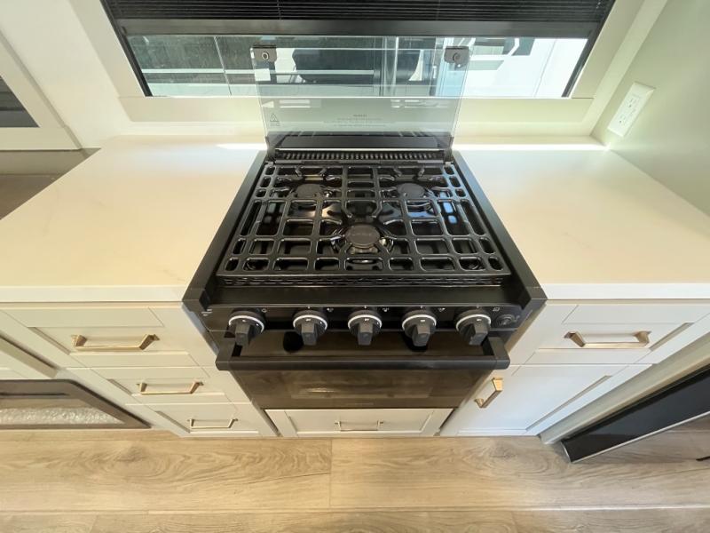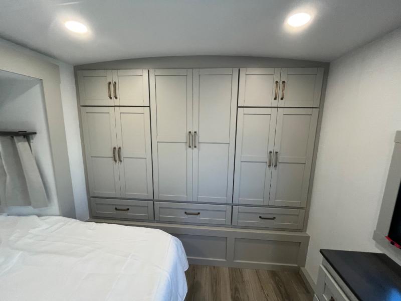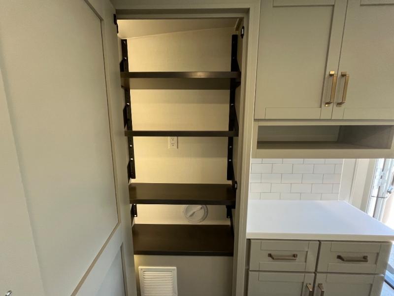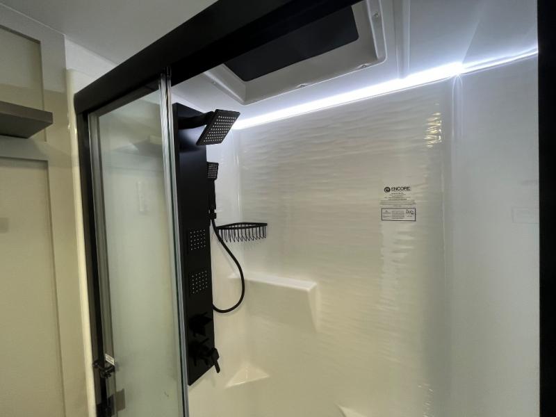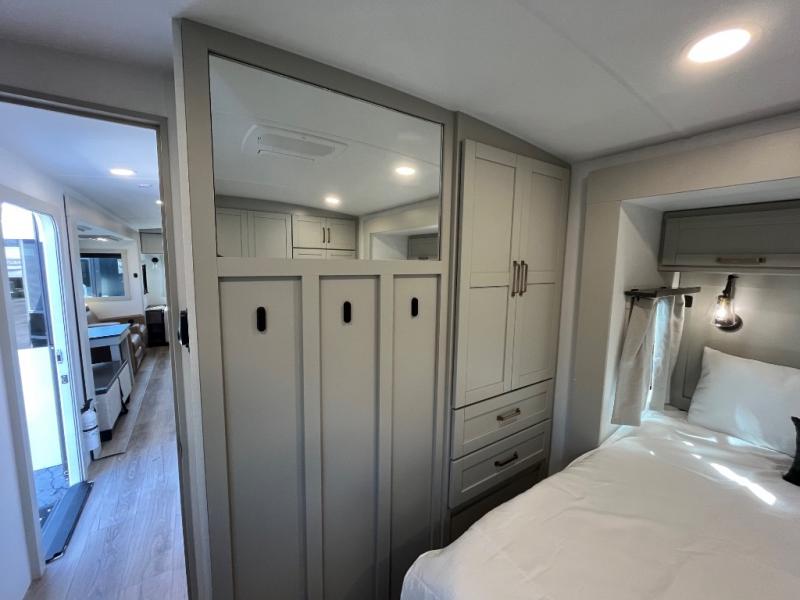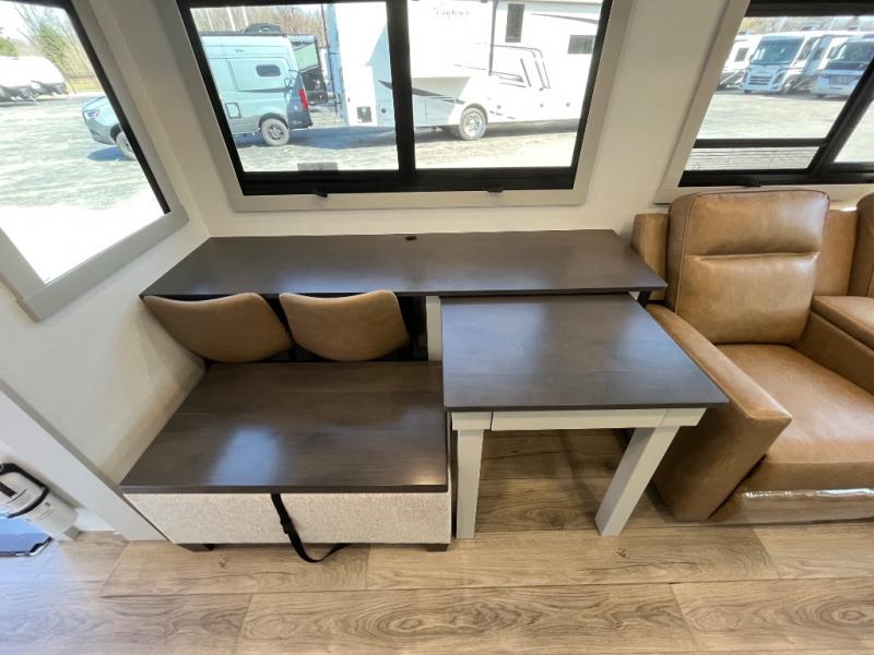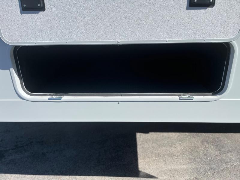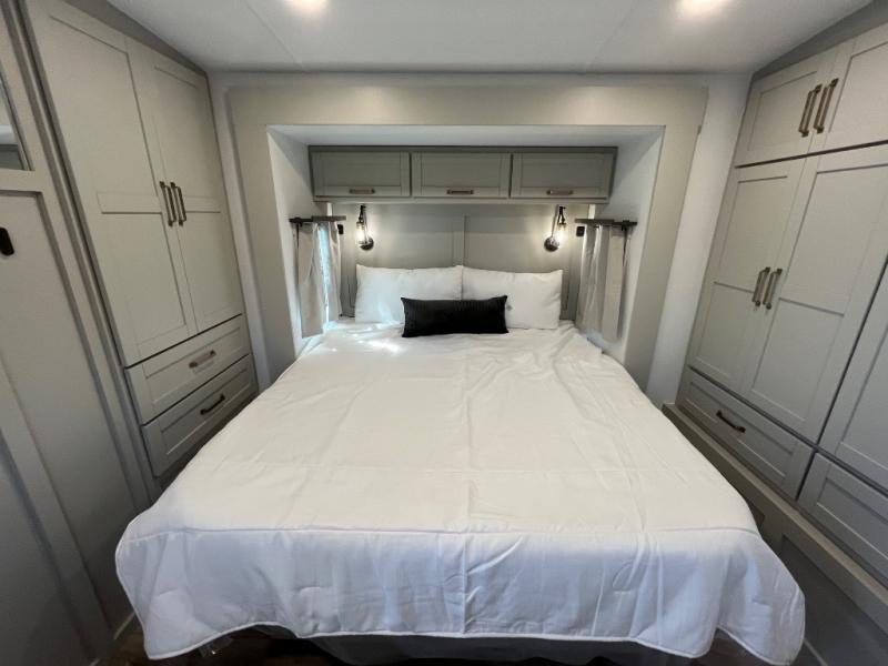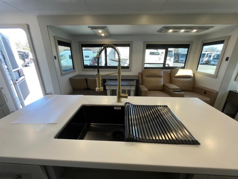 You will love all the space and features in this travel trailer! A luxurious rear living room offers plenty of room to spread out, with a 72" tri-fold sofa plus theater seats, all arranged with a perfect view of the 50" TV over the fireplace. A central kitchen area includes an island with hidden pet bowls. Find even more storage with the hutch plus pantry with adjustable shelves. The front bedroom comes with a queen bed, but if you'd like you can upgrade to a king for even more room. No matter which you choose, you will enjoy watching the 32" bedroom TV. The full-width wardrobe has room for all of your clothes and also includes prep for an optional washer and dryer. And the full bath includes a 30" x 42" one-piece fiberglass shower. Outside you'll enjoy two awnings, pass-through storage, and LED chassis lighting.