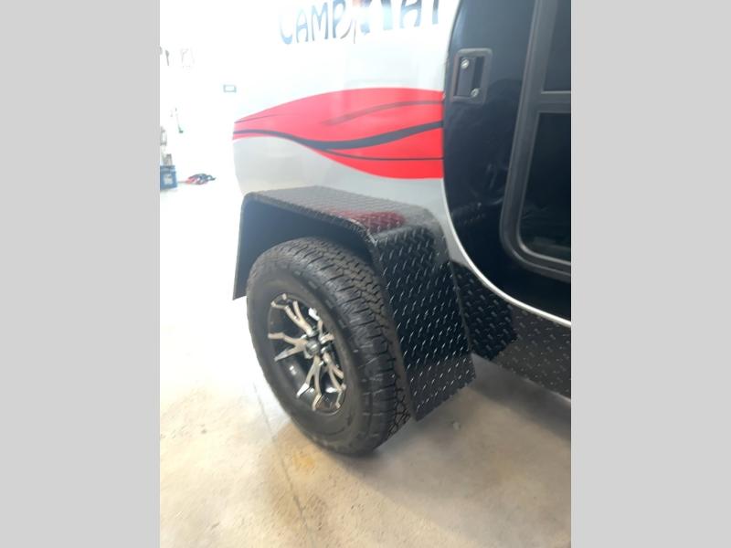 With any CampKat teardrop you will enjoy oversized doors with opening windows making it easy to get in and out of. The cross ventilation will be great for warm summer nights. Weighing in at 880 lbs., the CampKat can easily be maneuvered by hand to hook-up and move into the garage out of the way when you are not using. The one-piece fiberglass body makes the CampKat easy to maintain for years of fun and adventure. If you like, you can add the optional clear front rock guard, front storage box, spare tire and rack, or even alloy wheels if you wish.