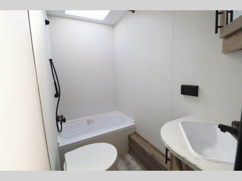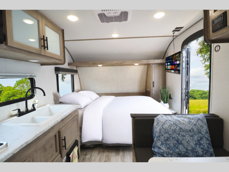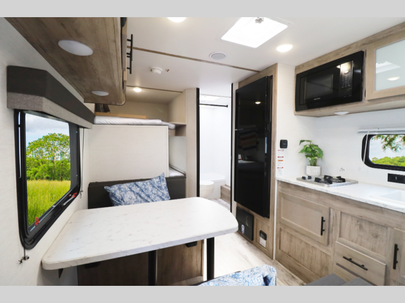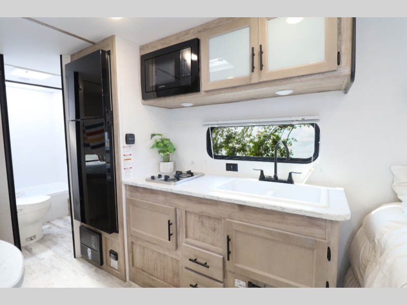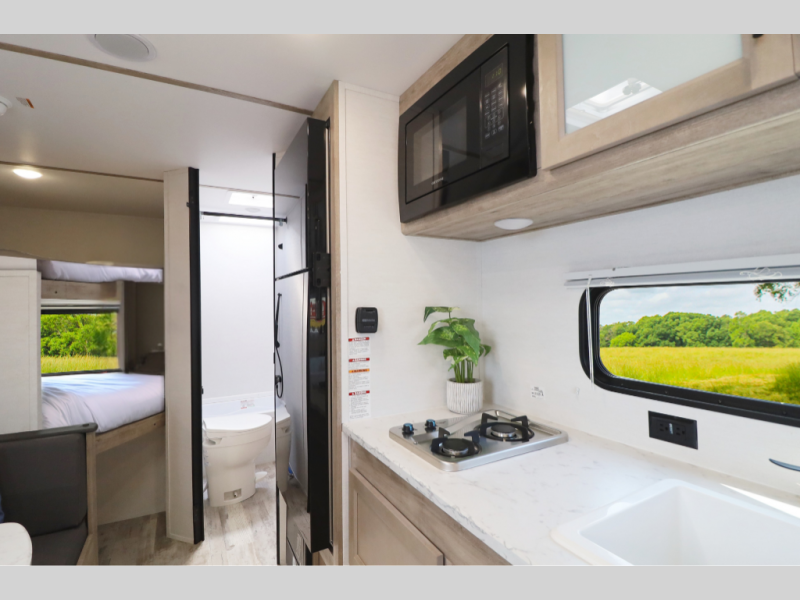 Modern Kitchen – Complete with a 2-burner cooktop, microwave, and 10 cu. ft. 12V refrigerator for fresh meals wherever you roam.