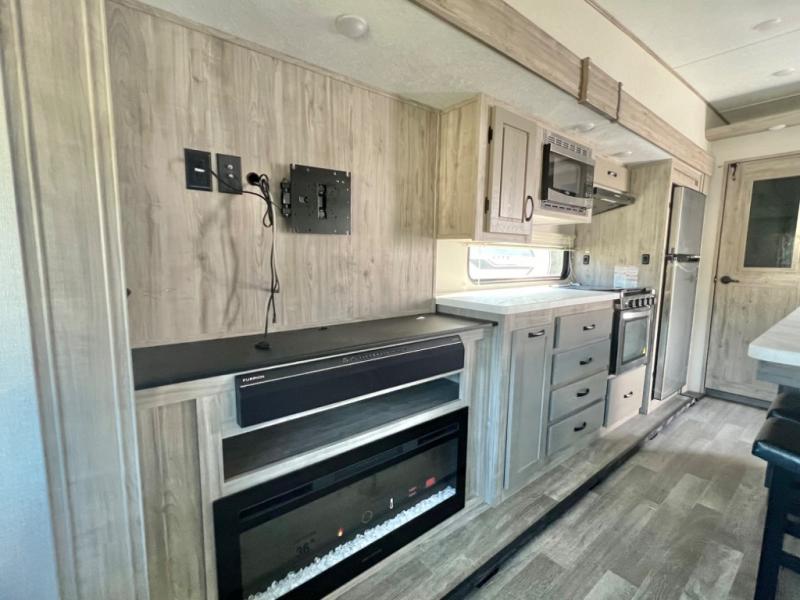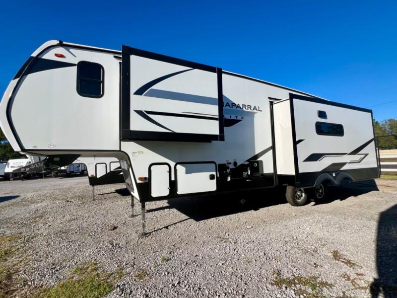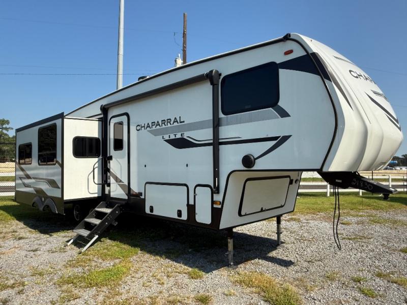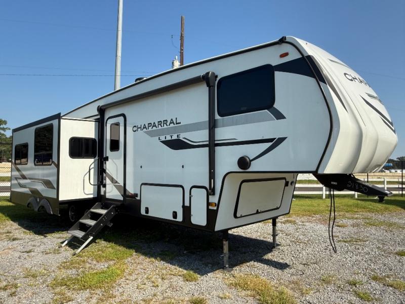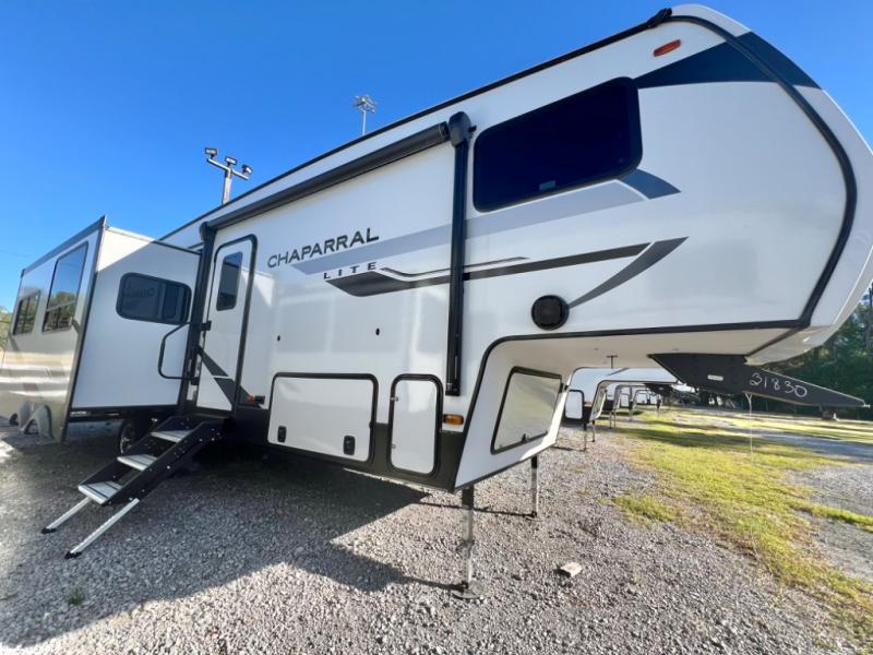 Comfort, convenience, and an easy haul is what you will find with each one of these Coachmen RV Chaparral Lite fifth wheels! Their Tri-Tex powder coated frame technology is up to 5X more weather resistant, and the dual-sided Azdel composite sidewall panels is ultra durable. The Road Armor suspension by Trail Air comes with heavy duty shackles and wet bolts so you can be sure it will hold up through every adventure, and you might want to add the exterior back-up and sideview camera prep for easy parking. You will feel right at home inside with a modern sound bar with a stereo, blackout roller night shades, Thomas Payne furniture, a high BTU output modern electric fireplace, and many more comforts! The exterior is just as inviting with its electric awning with LED lights, Solid Step entry steps, and pass-through storage for all your gear!