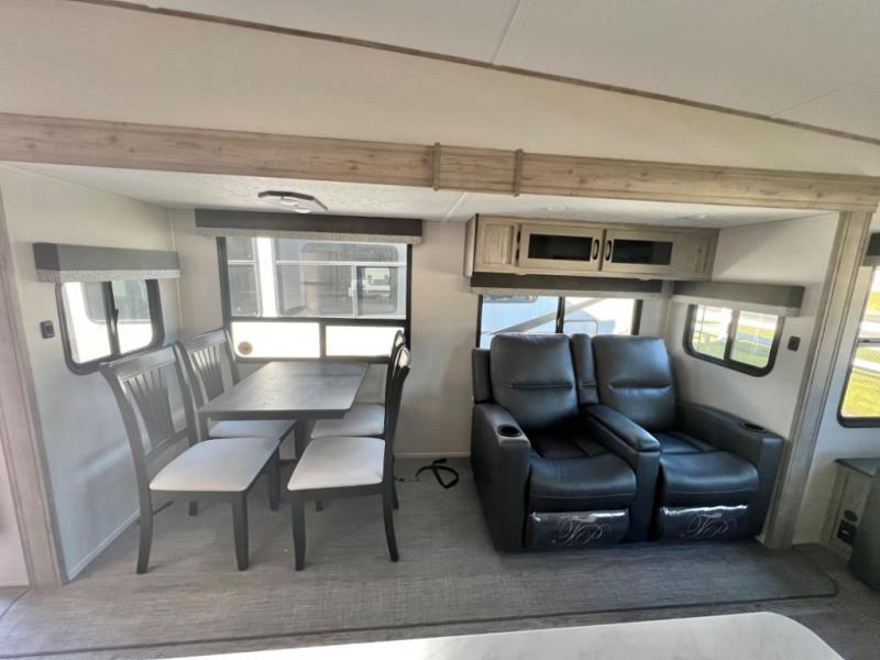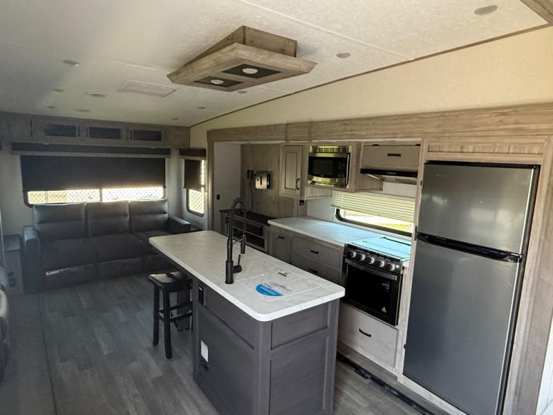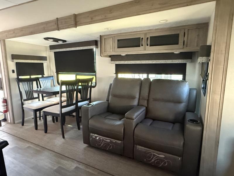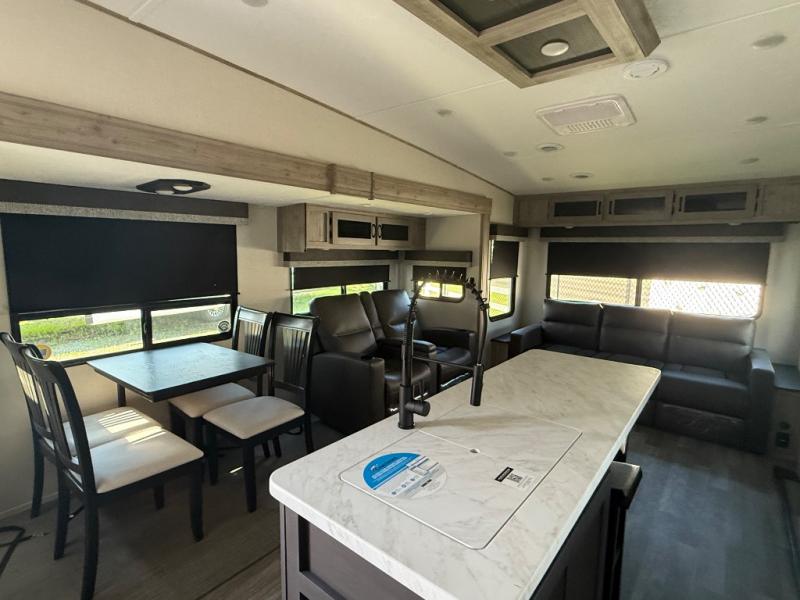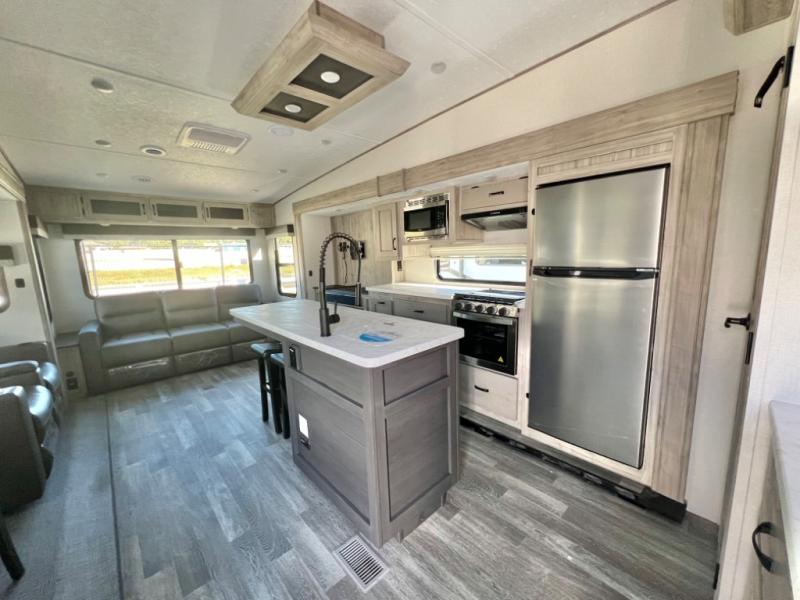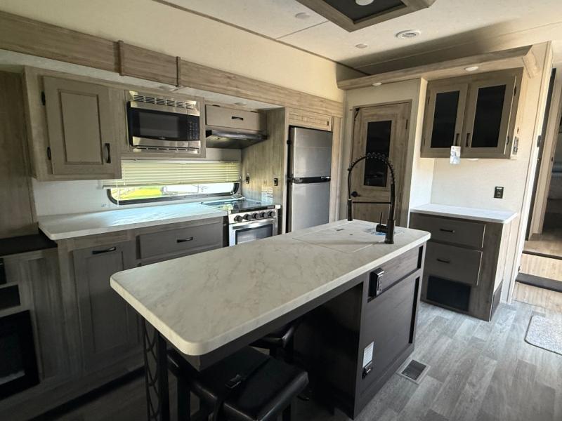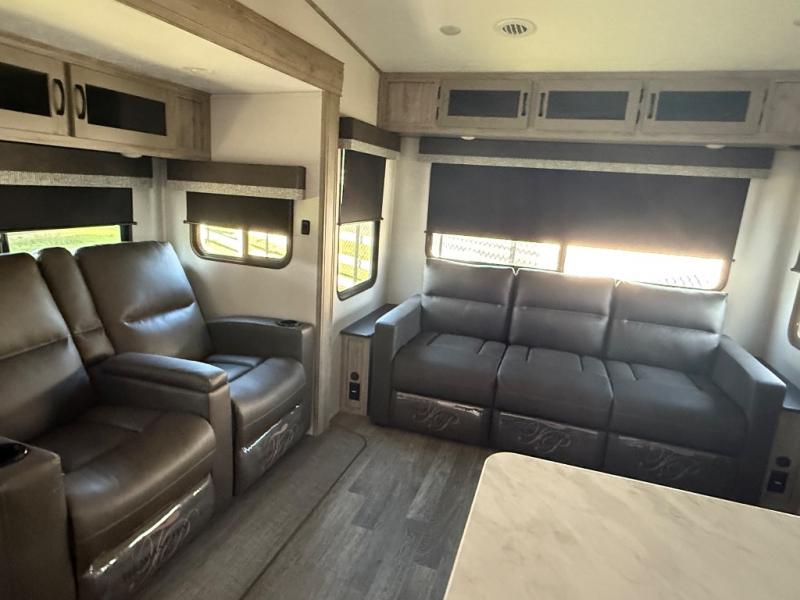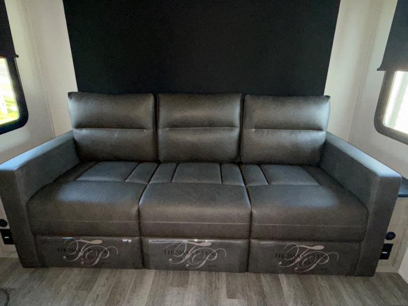 Get ready for a luxurious getaway in this fifth wheel! The rear living area is the perfect place to wind down your nights by relaxing on either the 78" tri-fold hide-a-bed sofa or the theater seating across from the entertainment center. You could even play a few card games at the free-standing table while enjoying snacks that were stored in the pantry. The kitchen island comes with two bar stools so you can have two helpers get dinner ready while you're cooking on the three-burner cooktop. The dual entry bathroom is easy for everyone to access and has a radius shower with glass doors to freshen up in, plus it leads directly into the front master bedroom where you will find a queen bed to lay your head on at night and a wardrobe/linen slide to keep your clothes looking their best!