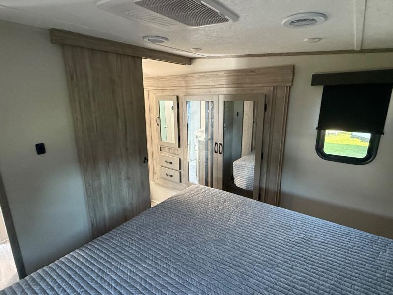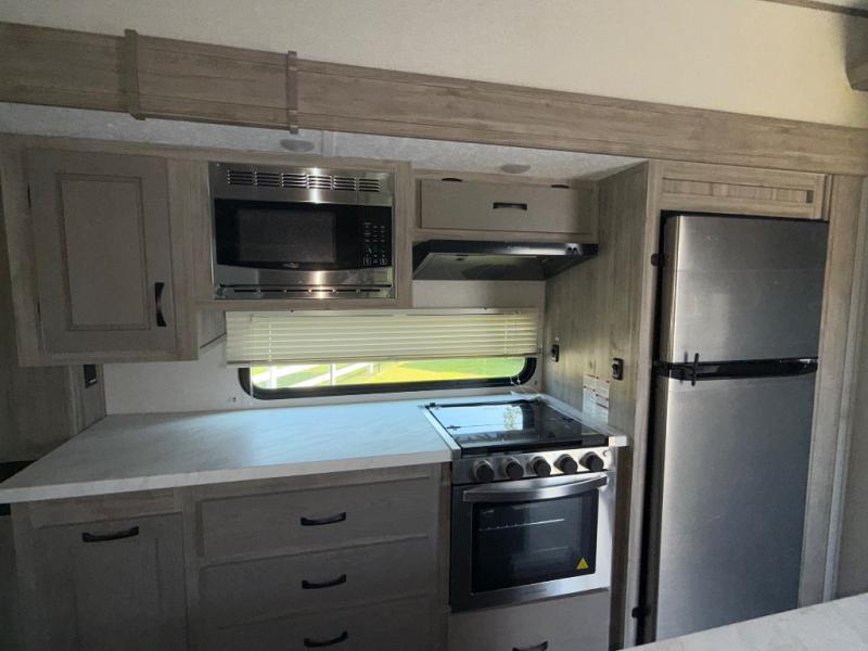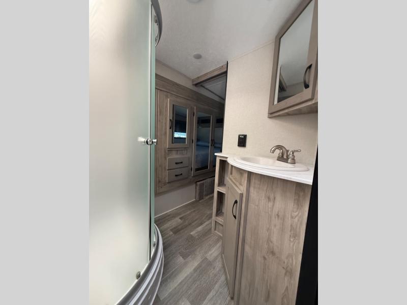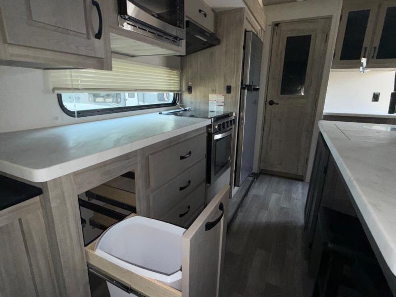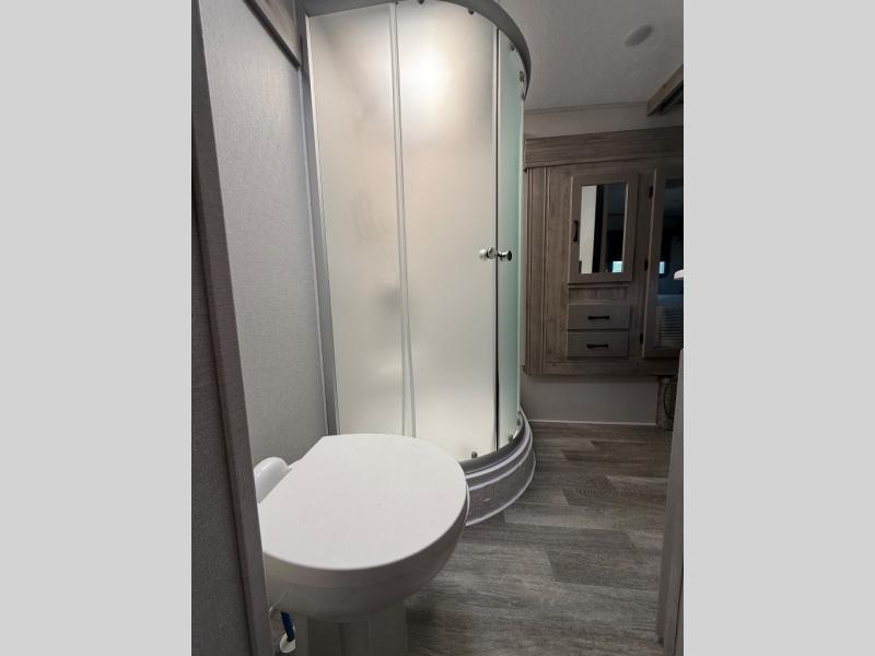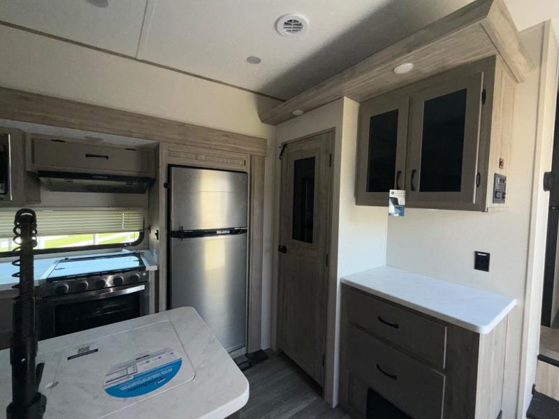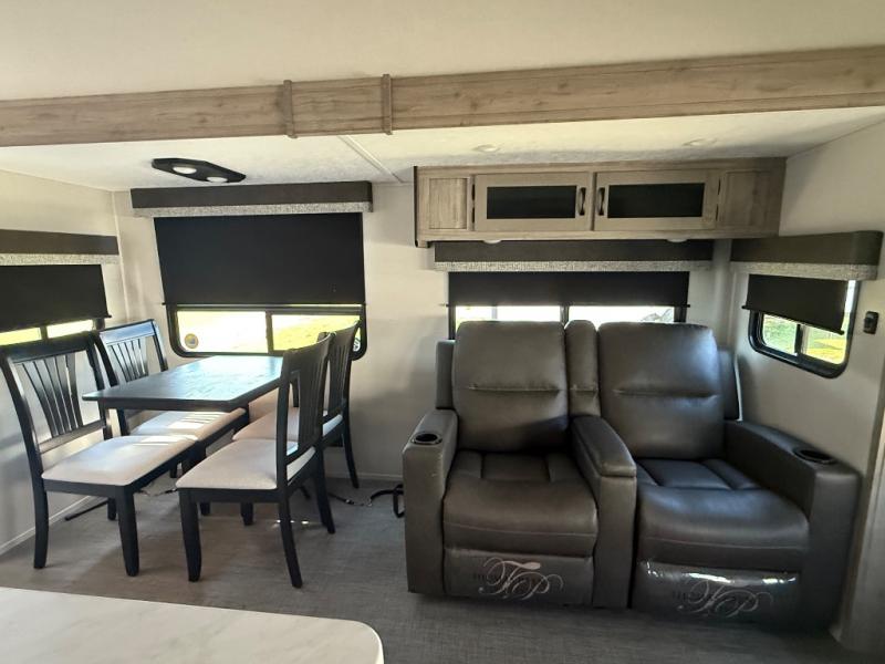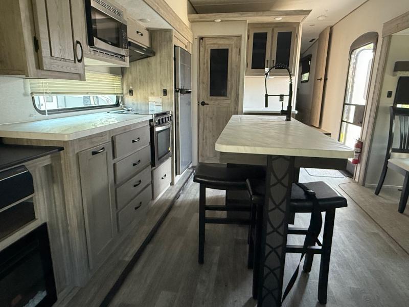 Get ready for a luxurious getaway in this fifth wheel! The rear living area is the perfect place to wind down your nights by relaxing on either the 78" tri-fold hide-a-bed sofa or the theater seating across from the entertainment center. You could even play a few card games at the free-standing table while enjoying snacks that were stored in the pantry. The kitchen island comes with two bar stools so you can have two helpers get dinner ready while you're cooking on the three-burner cooktop. The dual entry bathroom is easy for everyone to access and has a radius shower with glass doors to freshen up in, plus it leads directly into the front master bedroom where you will find a queen bed to lay your head on at night and a wardrobe/linen slide to keep your clothes looking their best!