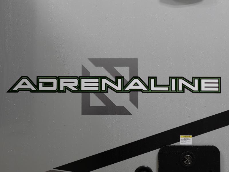 With any Adrenaline toy hauler travel trailer by Coachmen, the required Exterior Value package includes a one-piece Tufflex PVC roof membrane, a fiberglass front cap with rock guard to help against road debris, heavy duty Dexter axles with Nev-R-Adjust brakes and E-Z Lube, and aluminum wheels. Some exterior standards include a heated and enclosed underbelly, a patio ready ramp door with cables for an outdoor above ground space to enjoy, a power tongue jack for easy setup, and an outside spray port to clean off your toys. The interior standards include HD rubberized oil/gas/moisture resistant flooring in the garage area, hidden hinge cabinets and doors, a rear detachable screen, and USB charging ports in multiple locations for your electronics to mention a few.