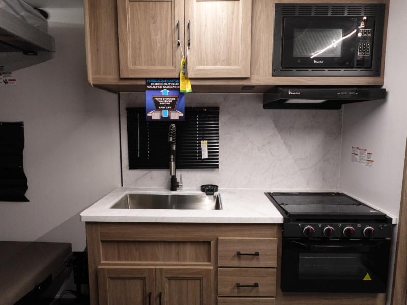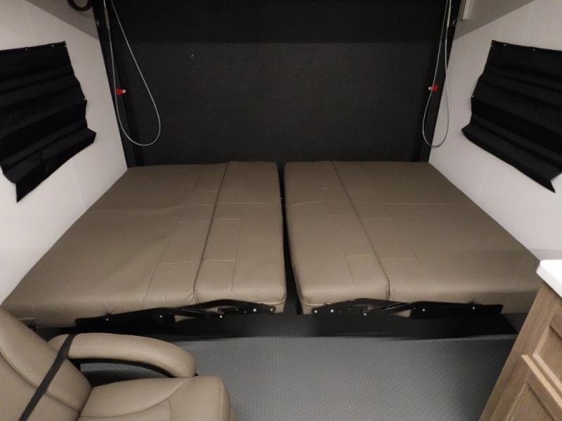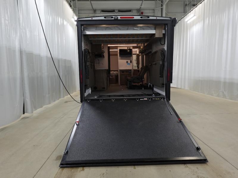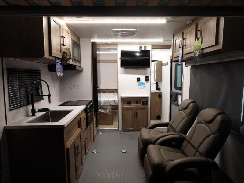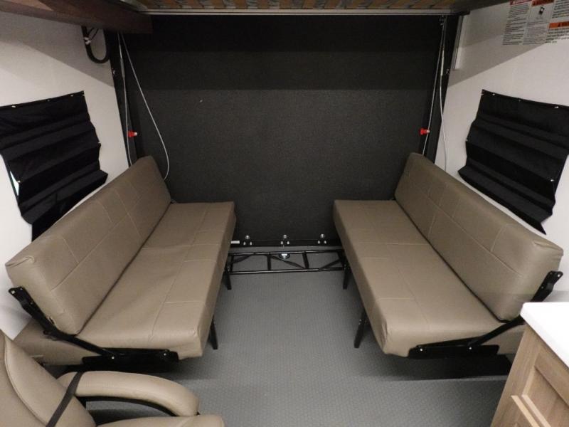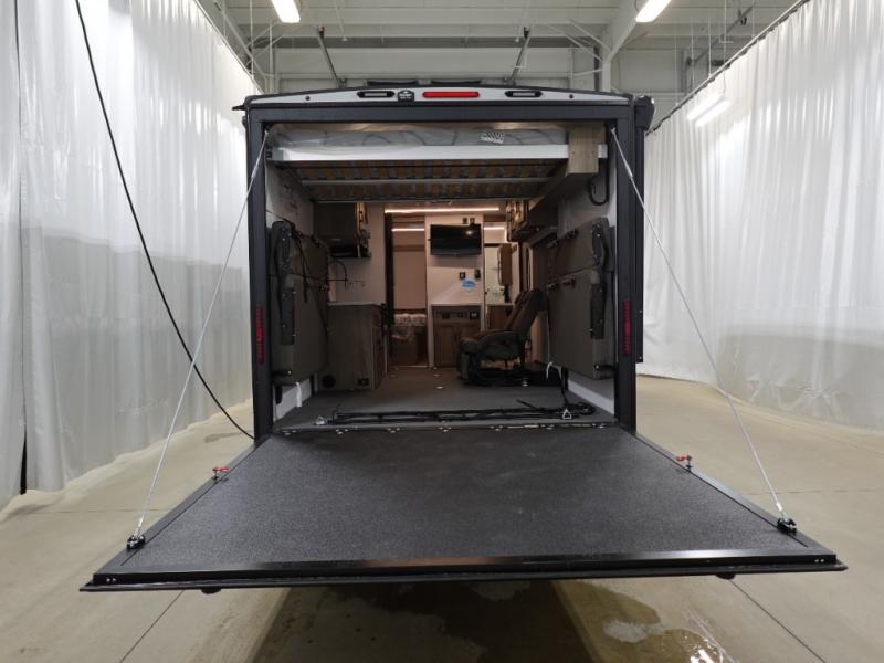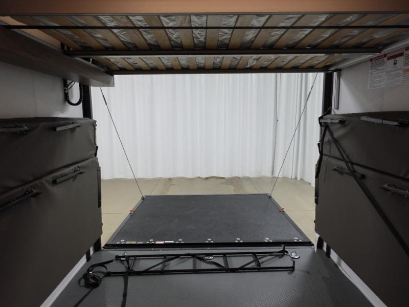 Load up your toys into 13' 8" of cargo space, your clothes in the dresser, your gear in the overhead cabinets, and your food in the refrigerator for a weekend or longer trail ride! The chef of the group can prepare breakfast on the three burner cooktop that includes an oven or use the microwave, and there is plenty of storage space in the overhead cabinets for kitchen necessities and snacks. The dual entry bath and a master bedroom are both along the front of the trailer giving you privacy and convenience. When it's finally time to call it a night, you will enjoy the queen bed slide and your guests can convert the two roll-over sofas for a great night's rest, and there is a queen bed electric lift if you need more sleeping space.