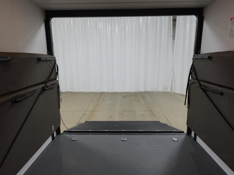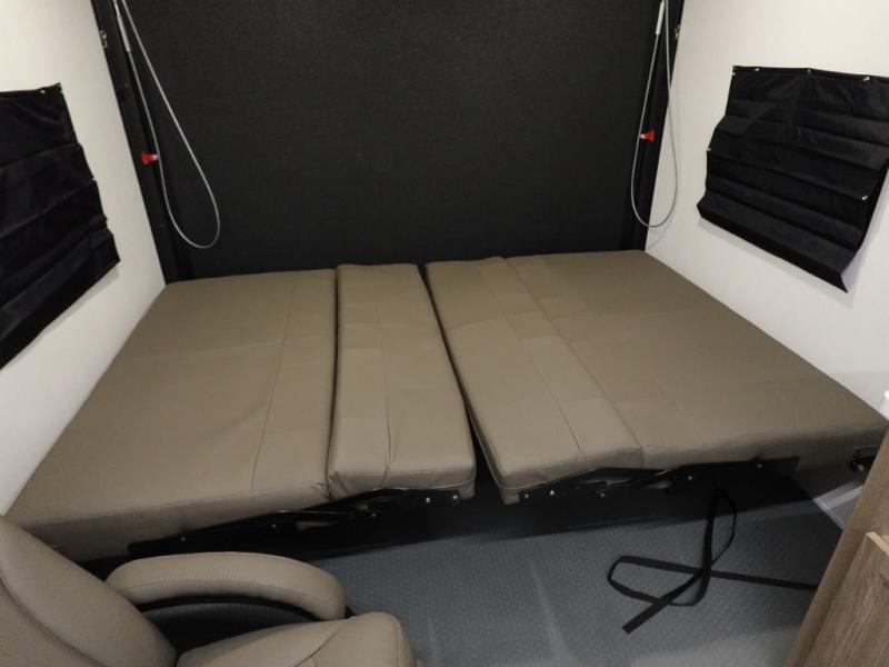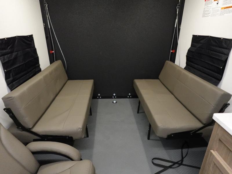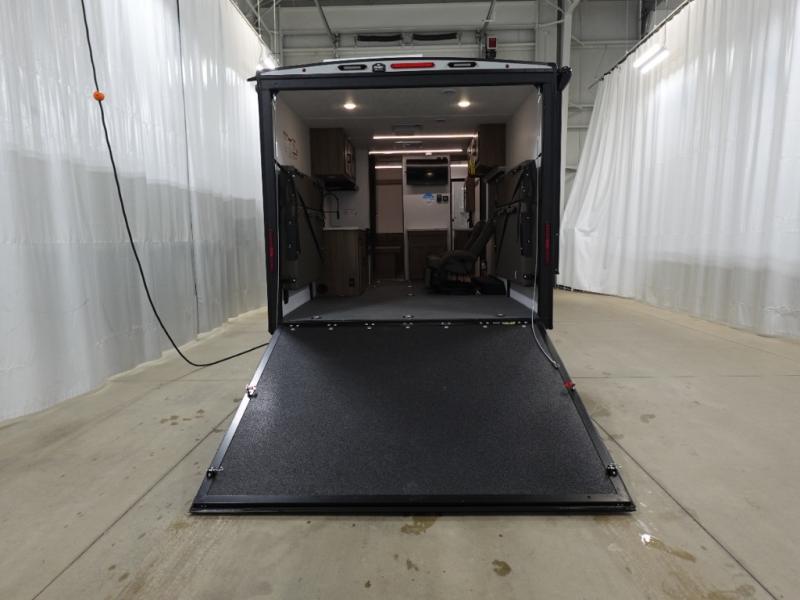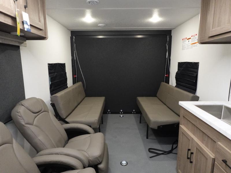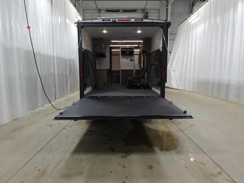 Load up your toys into 13' 8" of cargo space, your clothes in the dresser, your gear in the overhead cabinets, and your food in the refrigerator for a weekend or longer trail ride! The chef of the group can prepare breakfast on the three burner cooktop that includes an oven or use the microwave, and there is plenty of storage space in the overhead cabinets for kitchen necessities and snacks. The dual entry bath and a master bedroom are both along the front of the trailer giving you privacy and convenience. When it's finally time to call it a night, you will enjoy the queen bed slide and your guests can convert the two roll-over sofas for a great night's rest.