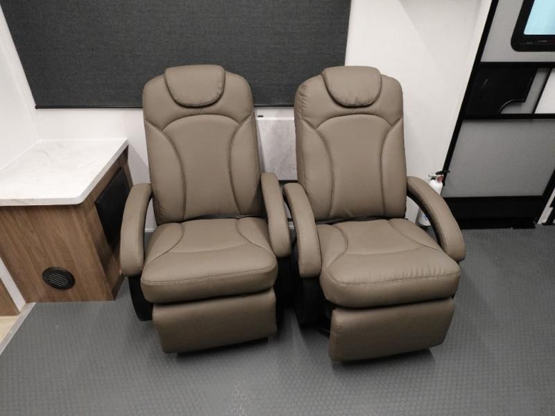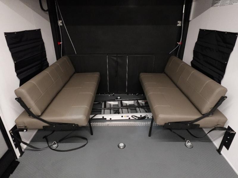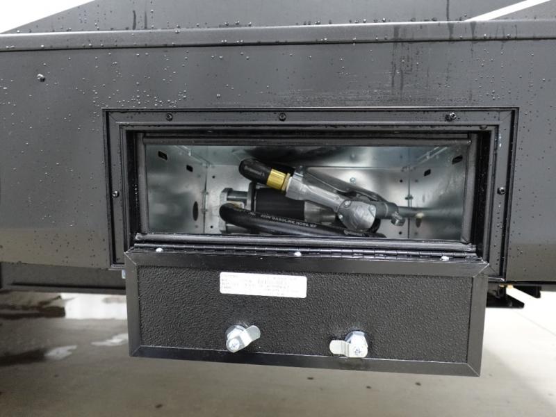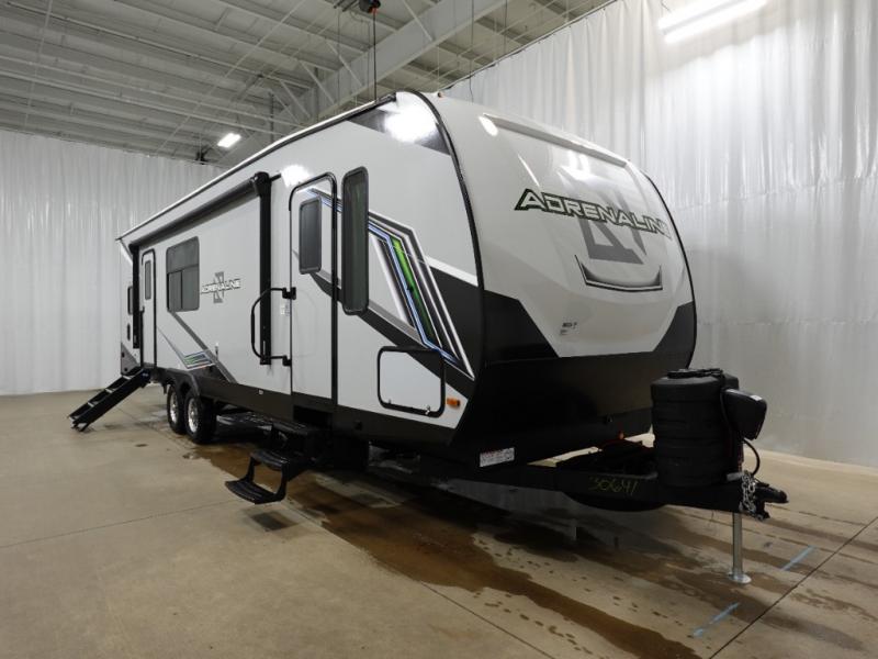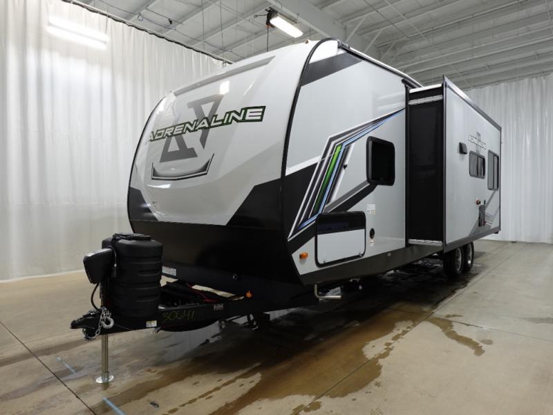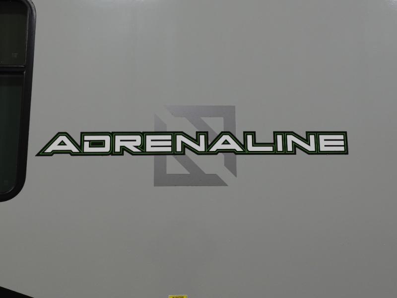 With any Adrenaline toy hauler travel trailer by Coachmen, the required Exterior Value package includes a one-piece Tufflex PVC roof membrane, a fiberglass front cap with rock guard to help against road debris, heavy duty Dexter axles with Nev-R-Adjust brakes and E-Z Lube, and aluminum wheels. Some exterior standards include a heated and enclosed underbelly, a patio ready ramp door with cables for an outdoor above ground space to enjoy, a power tongue jack for easy setup, and an outside spray port to clean off your toys. The interior standards include HD rubberized oil/gas/moisture resistant flooring in the garage area, hidden hinge cabinets and doors, a rear detachable screen, and USB charging ports in multiple locations for your electronics to mention a few.
