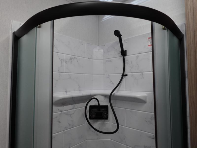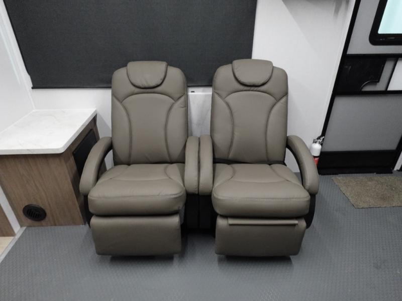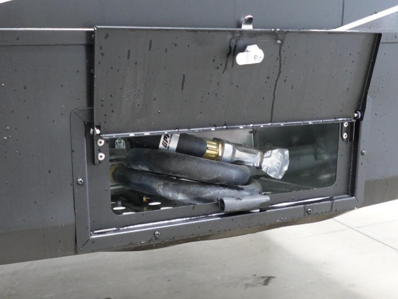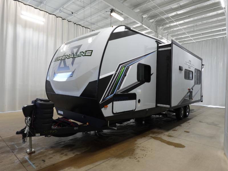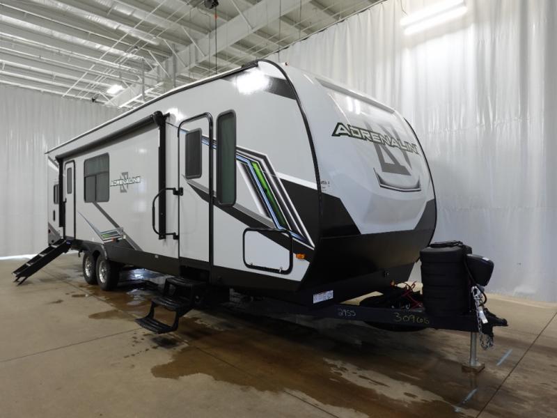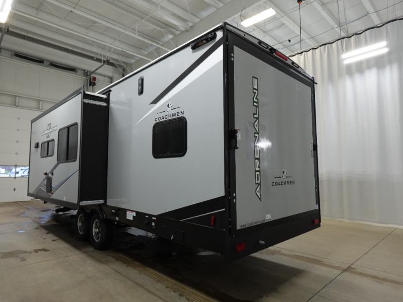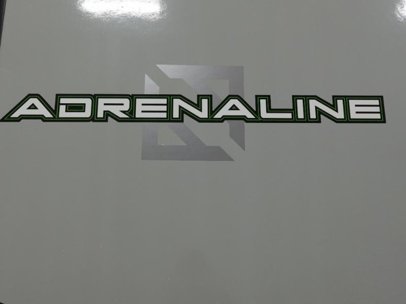 With any Adrenaline toy hauler travel trailer by Coachmen, the required Exterior Value package includes a one-piece Tufflex PVC roof membrane, a fiberglass front cap with rock guard to help against road debris, heavy duty Dexter axles with Nev-R-Adjust brakes and E-Z Lube, and aluminum wheels. Some exterior standards include a heated and enclosed underbelly, a patio ready ramp door with cables for an outdoor above ground space to enjoy, a power tongue jack for easy setup, and an outside spray port to clean off your toys. The interior standards include HD rubberized oil/gas/moisture resistant flooring in the garage area, hidden hinge cabinets and doors, a rear detachable screen, and USB charging ports in multiple locations for your electronics to mention a few.