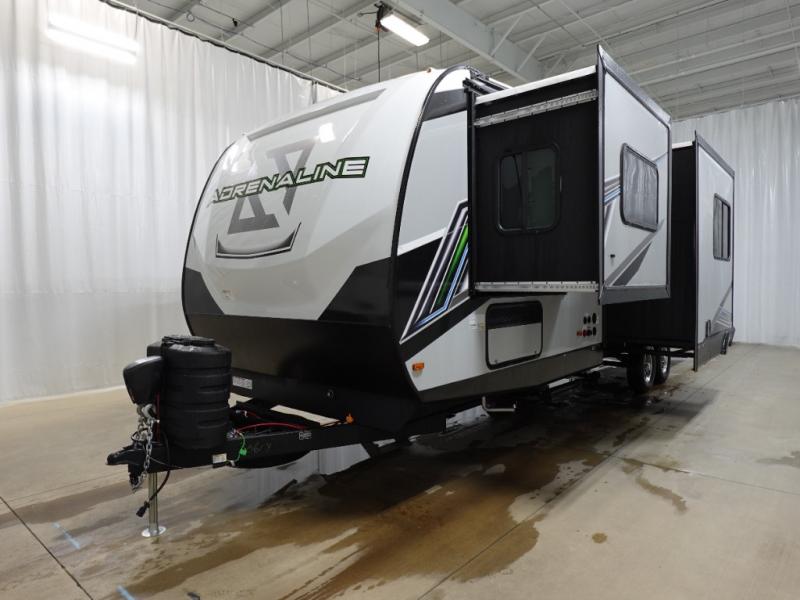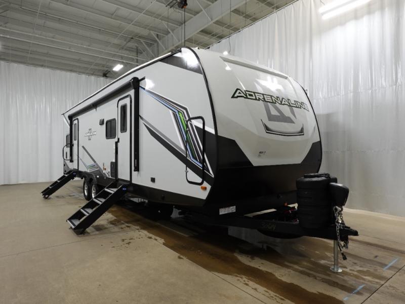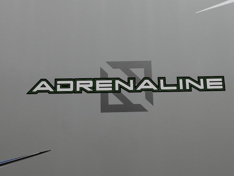 With any Adrenaline toy hauler travel trailer by Coachmen, the required Exterior Value package includes a one-piece Tufflex PVC roof membrane, a fiberglass front cap with rock guard to help against road debris, heavy duty Dexter axles with Nev-R-Adjust brakes and E-Z Lube, and aluminum wheels. Some exterior standards include a heated and enclosed underbelly, a patio ready ramp door with cables for an outdoor above ground space to enjoy, a power tongue jack for easy setup, and an outside spray port to clean off your toys. The interior standards include HD rubberized oil/gas/moisture resistant flooring in the garage area, hidden hinge cabinets and doors, a rear detachable screen, and USB charging ports in multiple locations for your electronics to mention a few.