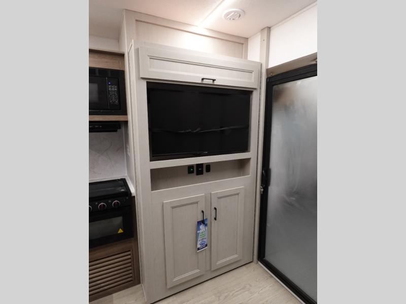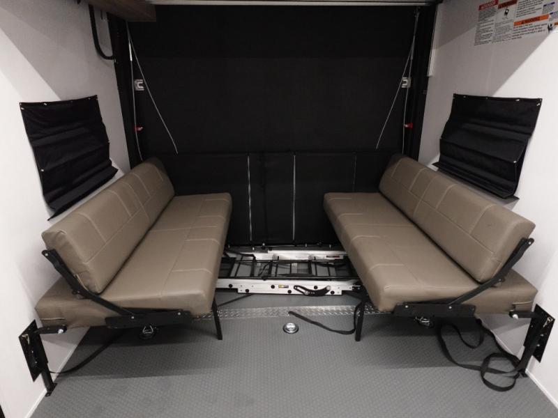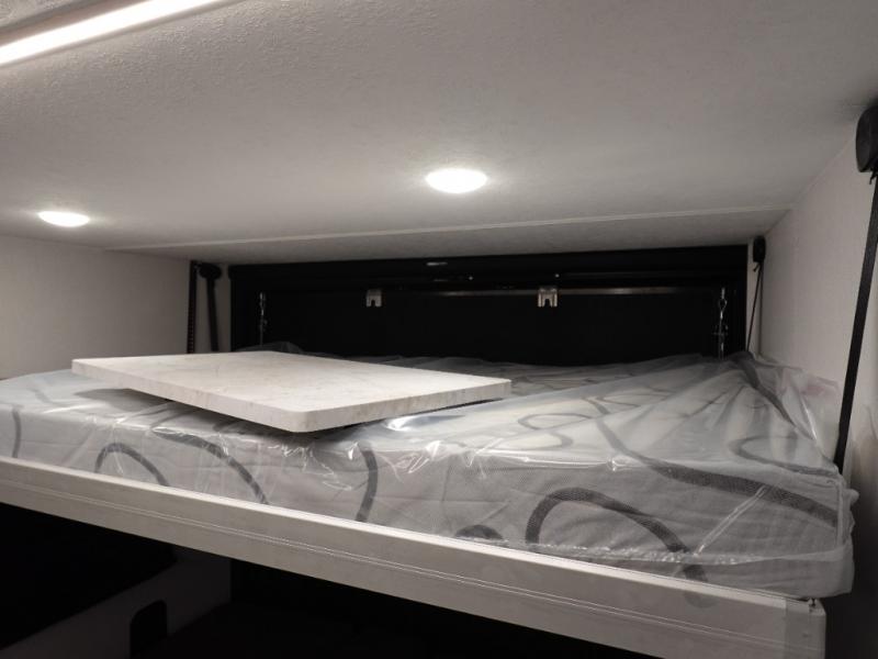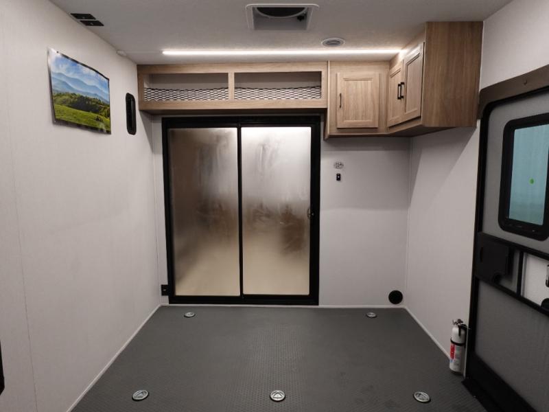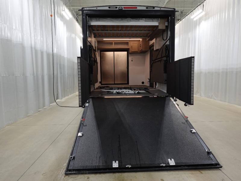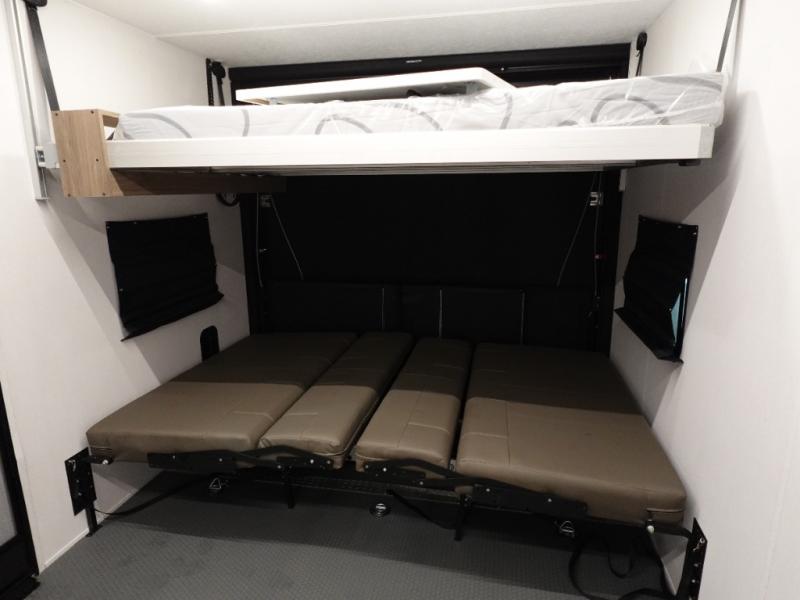 Looking for 13' of toy parking space, and sleeping space for six? You are going to love this model! You will appreciate the large cargo area for all your toys, and the extra sleeping space for family and friends with the roll over sofas converted and the overhead queen bed lift dropped down in the garage area. And the queen bed slide in the front master bedroom will be perfect for the owners. The chef of the family or group can prepare dinner on the three burner cooktop or use the microwave, and the double entry bath is conveniently located just inside the main side entry and includes a nice size shower, vanity with a sink and an overhead medicine cabinet. This toy hauler also includes dual entry/exit doors with the second one into the garage area. You will also find a rear pull down screen in the garage, pull-down roller night shades to be able to sleep in late, and a solar package to help you stay off-grid.