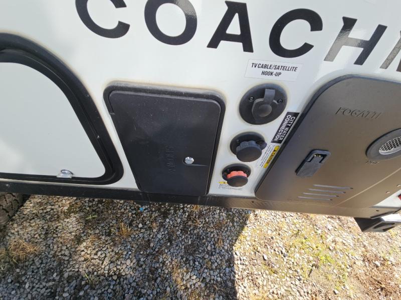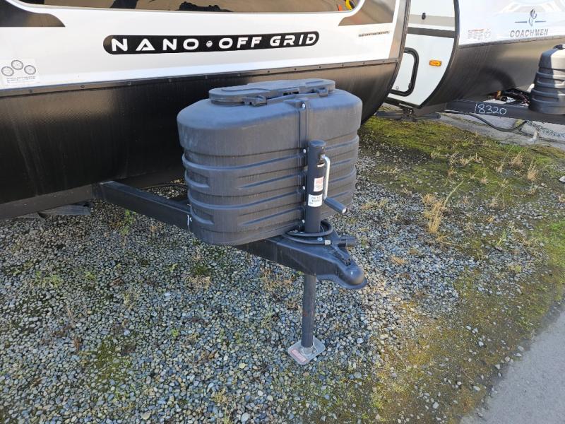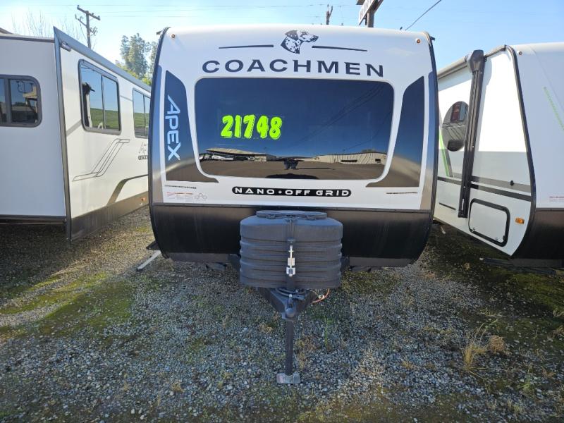 You will find comfort, convenience, and a sturdy construction with each of these Coachmen RV Apex Nano travel trailers! They are held together with an aluma-cage construction, an I-beam chassis, plus vacuum-bonded laminated dual Azdel fiberglass walls for double the protection against the elements. The 200-watt solar panel with a 30 amp control charger is included within the Off-Grid Package, along with two 20 lb. LP tanks, a high velocity power roof vent, plus 12V outlets to keep you powered up. More exterior feature include a hot/cold shower, four stabilizer jacks, a power awning with LED lighting, and magnetic baggage door catches to easily pack and unload your gear. You will love the interior of your Apex Nano with Congoleum residential flooring, one-piece seamless edge countertops, matte black hardware in the galley, and a hand-crafted wood medicine cabinet in the bath.
