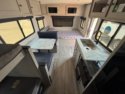 There's a comfortable place for everyone to sleep in this travel trailer with a front 54" x 80" bed and set of 30" x 74" bunk beds! The booth dinette can even transform into an extra sleeping space when you're not using it to enjoy a meal prepared with the two burner cooktop, microwave, and 8 cu. ft. 12V refrigerator. The rear corner bathroom has a tub/shower for you to start your mornings feeling clean and fresh, plus a medicine cabinet to keep your toiletries close. You will have plenty of room to store your outdoor gear between the front exterior pass-through storage area and the rear exterior storage area!