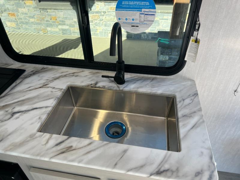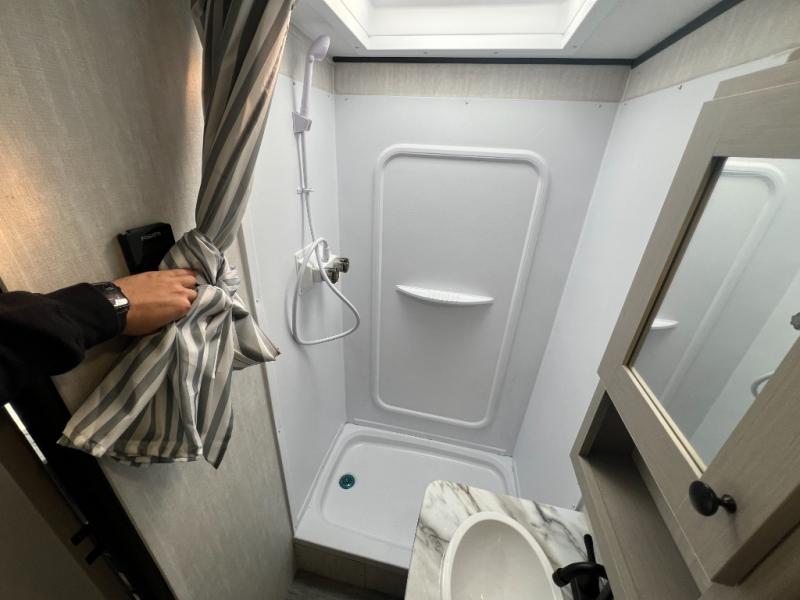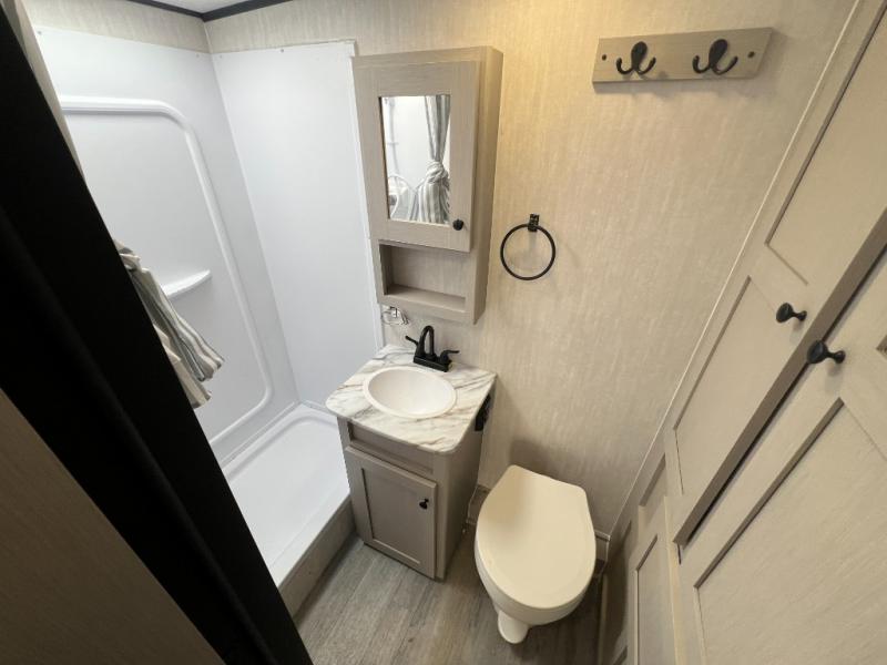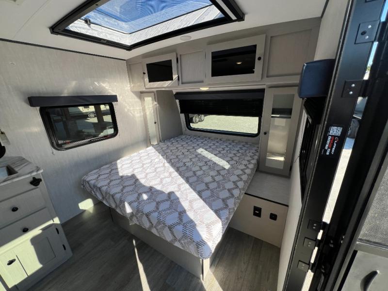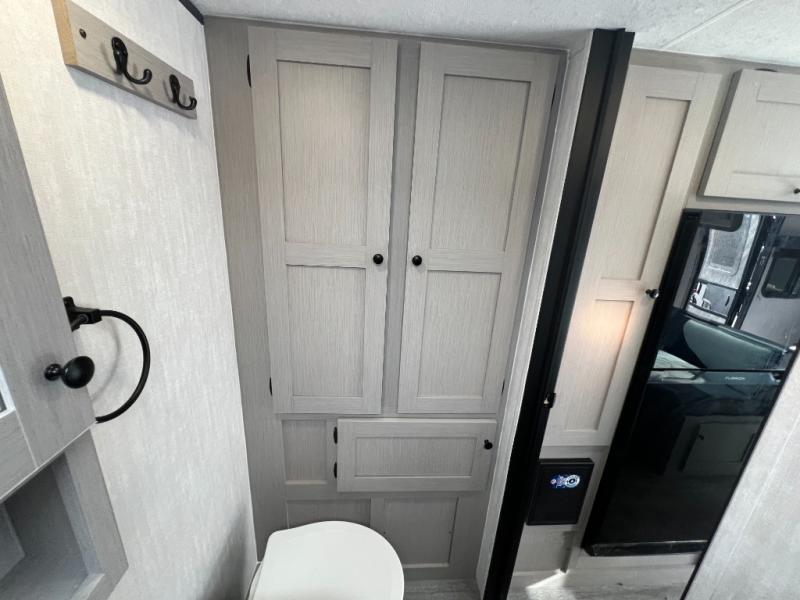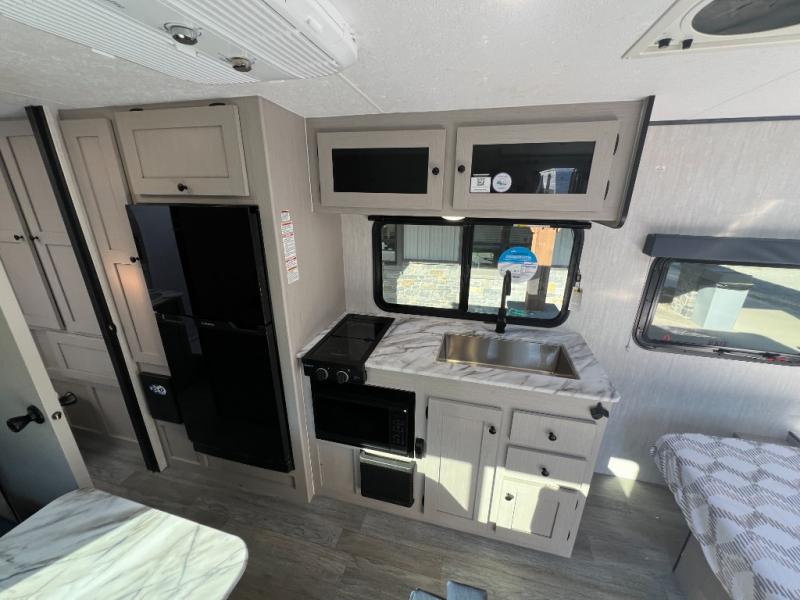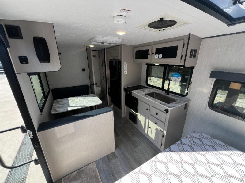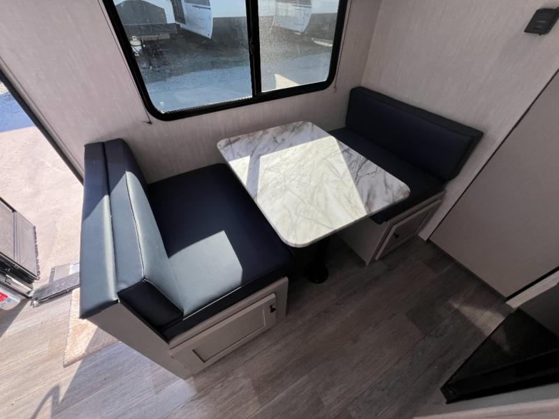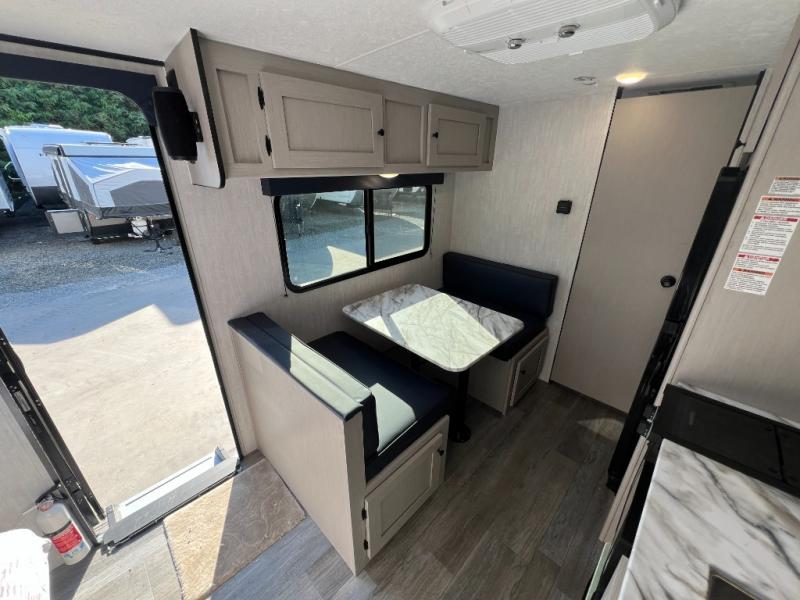 Easily head out to the campgrounds with this easy to tow trailer that offers indoor amenities to keep you fed, cleaned and relaxed! The galley kitchen provides a microwave, two burner cooktop and a pantry, plus an 8 cu. ft. 12V refrigerator all at your fingertips, and the rear full bathroom gives you a shower, wardrobe and more! You can eat your meals inside at the booth dinette which also provides sleeping space for one, and the walk-around queen-size bed up front with two wardrobes will allow you to sleep well while away from home.