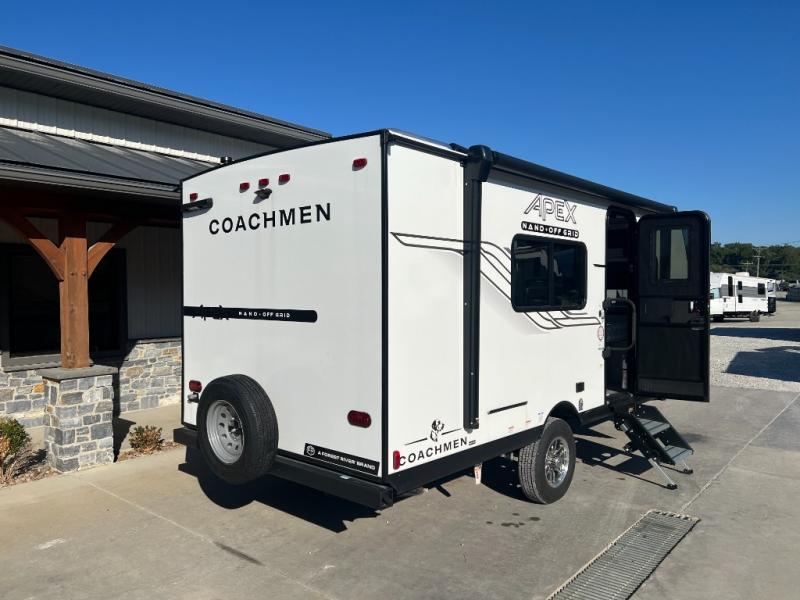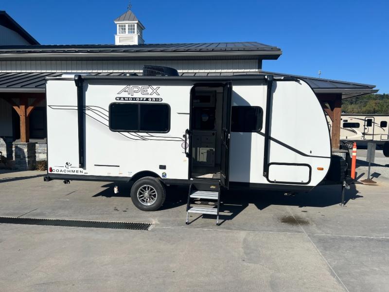 You will find comfort, convenience, and a sturdy construction with each of these Coachmen RV Apex Nano travel trailers! They are held together with an aluma-cage construction, an I-beam chassis, plus vacuum-bonded laminated dual Azdel fiberglass walls for double the protection against the elements. The 200-watt solar panel with a 30 amp control charger is included within the Off-Grid Package, along with two 20 lb. LP tanks, a high velocity power roof vent, plus 12V outlets to keep you powered up. More exterior feature include a hot/cold shower, four stabilizer jacks, a power awning with LED lighting, and magnetic baggage door catches to easily pack and unload your gear. You will love the interior of your Apex Nano with Congoleum residential flooring, one-piece seamless edge countertops, matte black hardware in the galley, and a hand-crafted wood medicine cabinet in the bath.