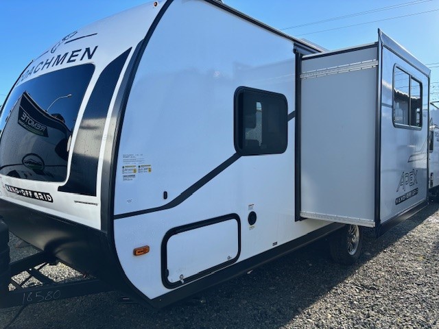 You will find comfort, convenience, and a sturdy construction with each of these Coachmen RV Apex Nano travel trailers! They are held together with an aluma-cage construction, an I-beam chassis, plus vacuum-bonded laminated dual Azdel fiberglass walls for double the protection against the elements. The 200-watt solar panel with a 30 amp control charger is included within the Off-Grid Package, along with two 20 lb. LP tanks, a high velocity power roof vent, plus 12V outlets to keep you powered up. More exterior feature include a hot/cold shower, four stabilizer jacks, a power awning with LED lighting, and magnetic baggage door catches to easily pack and unload your gear. You will love the interior of your Apex Nano with Congoleum residential flooring, one-piece seamless edge countertops, matte black hardware in the galley, and a hand-crafted wood medicine cabinet in the bath.