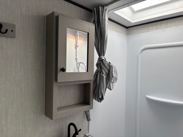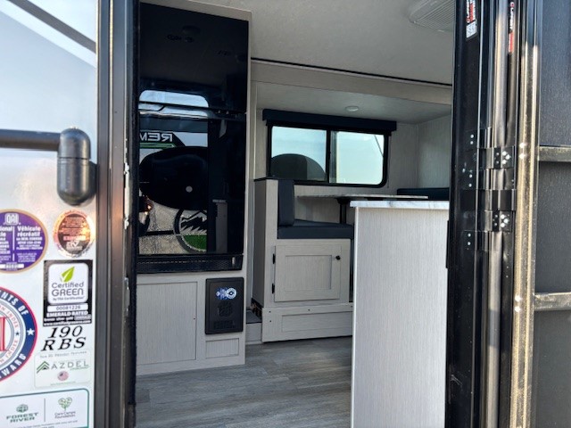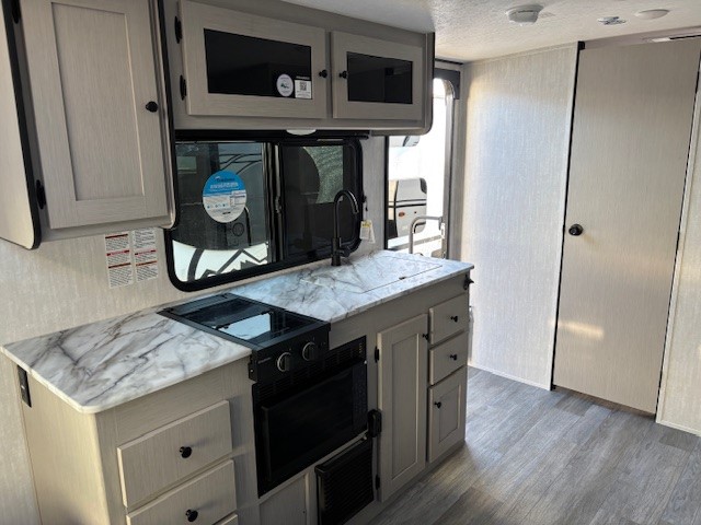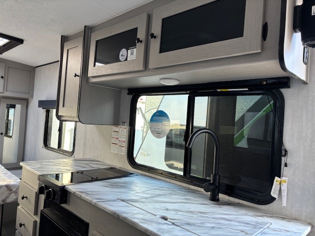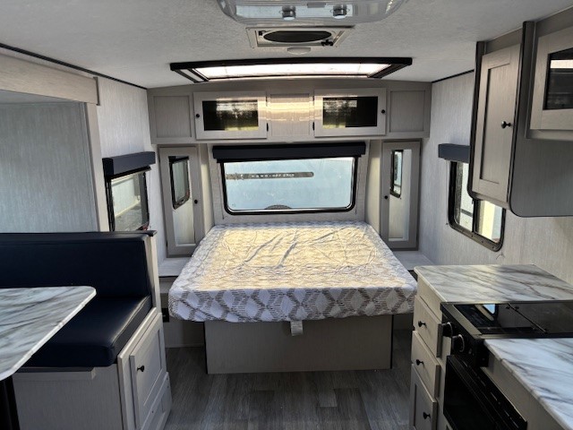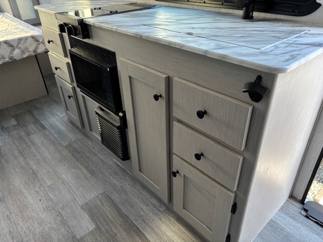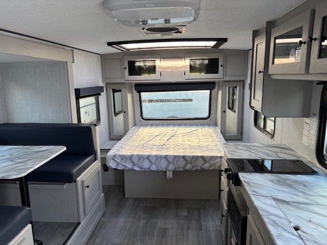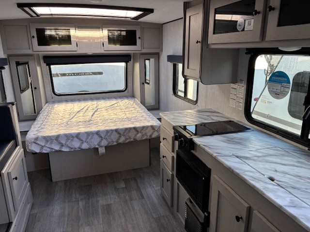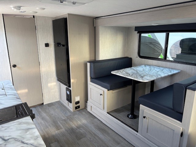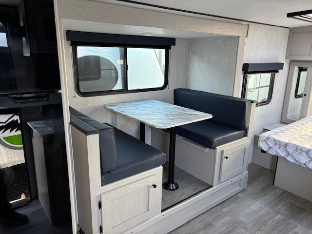 Whether you camp with friends, family or solo, this trailer gives you space for all with a spacious main living and kitchen area thanks to the booth dinette slide! The rear full bath offers a shower, sink, toilet and a wardrobe so you can get ready in privacy. A two burner cooktop and microwave underneath will let you make meals each day, and the 12V refrigerator will be perfect for perishables. The walk-around queen-size bed provides convenience when getting in and out of bed and there are two wardrobes and overhead cabinets to keep your belongings up and away. The power awning protects you from the elements when relaxing outside, and the exterior pass-through storage gives you a place to stow the outdoor equipment like camping chairs, tables, fishing poles and charcoal.