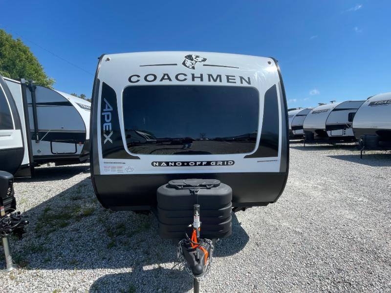You will find comfort, convenience, and a sturdy construction with each of these Coachmen RV Apex Nano travel trailers! They are held together with an aluma-cage construction, an I-beam chassis, plus vacuum-bonded laminated dual Azdel fiberglass walls for double the protection against the elements. The 200-watt solar panel with a 30 amp control charger is included within the Off-Grid Package, along with two 20 lb. LP tanks, a high velocity power roof vent, plus 12V outlets to keep you powered up. More exterior feature include a hot/cold shower, four stabilizer jacks, a power awning with LED lighting, and magnetic baggage door catches to easily pack and unload your gear. You will love the interior of your Apex Nano with Congoleum residential flooring, one-piece seamless edge countertops, matte black hardware in the galley, and a hand-crafted wood medicine cabinet in the bath.