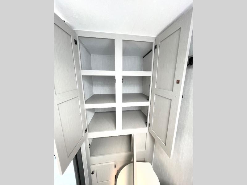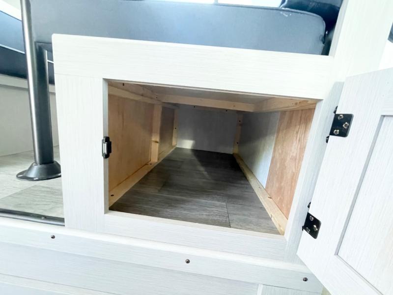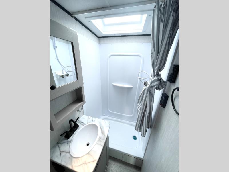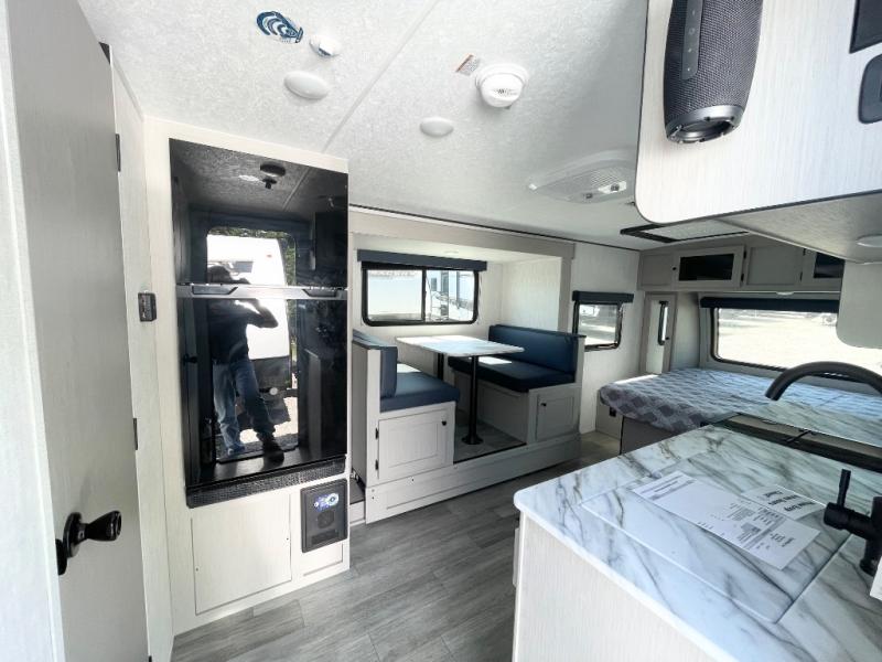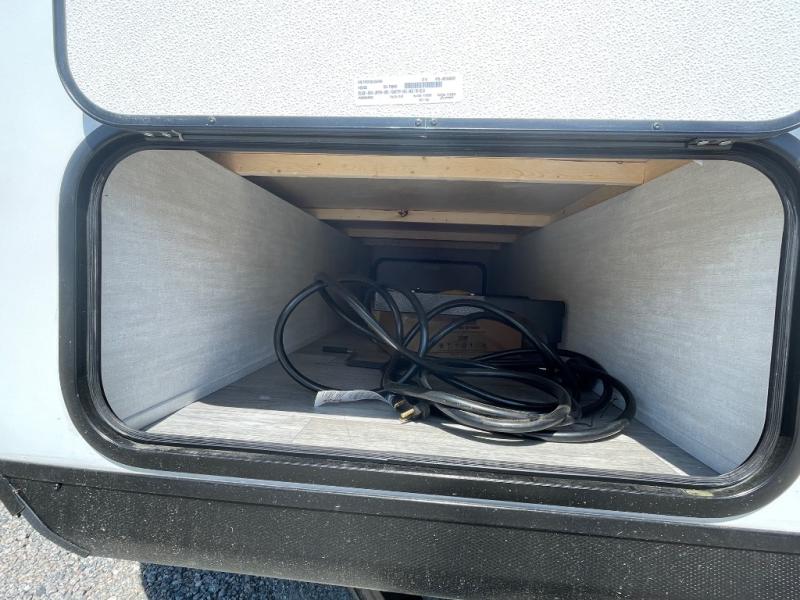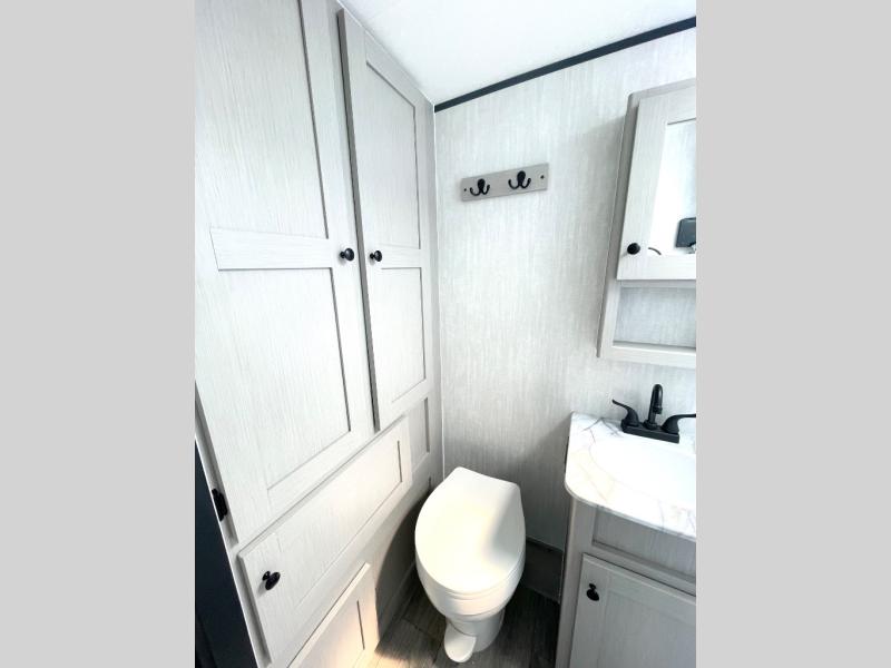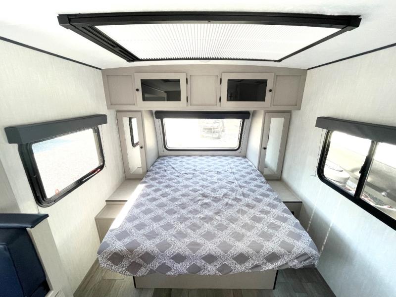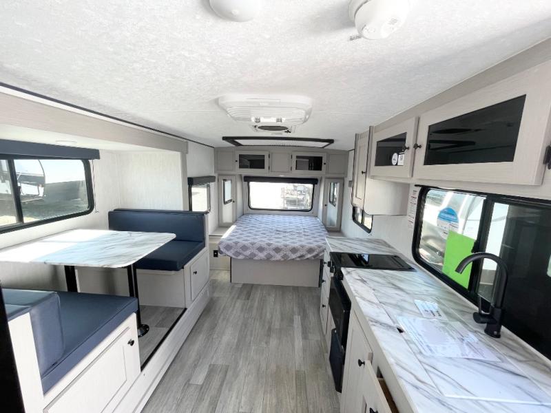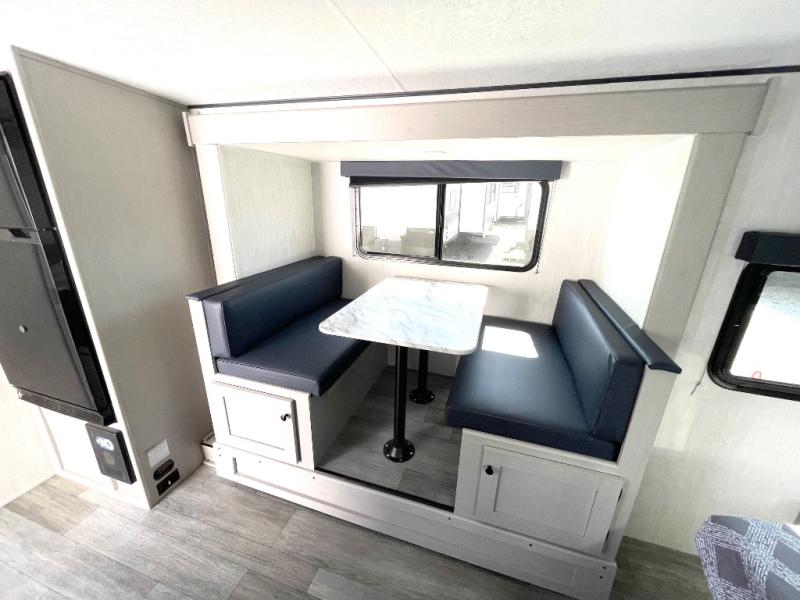 Whether you camp with friends, family or solo, this trailer gives you space for all with a spacious main living and kitchen area thanks to the booth dinette slide! The rear full bath offers a shower, sink, toilet and a wardrobe so you can get ready in privacy. A two burner cooktop and microwave underneath will let you make meals each day, and the 12V refrigerator will be perfect for perishables. The walk-around queen-size bed provides convenience when getting in and out of bed and there are two wardrobes and overhead cabinets to keep your belongings up and away. The power awning protects you from the elements when relaxing outside, and the exterior pass-through storage gives you a place to stow the outdoor equipment like camping chairs, tables, fishing poles and charcoal.