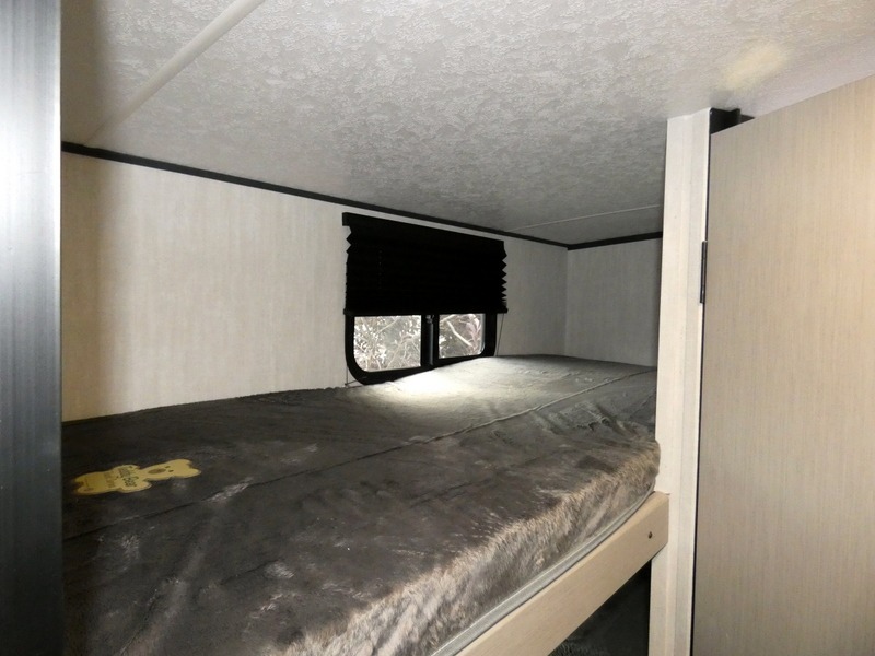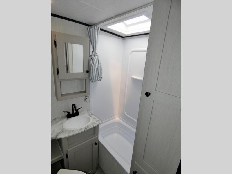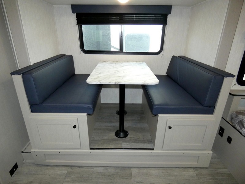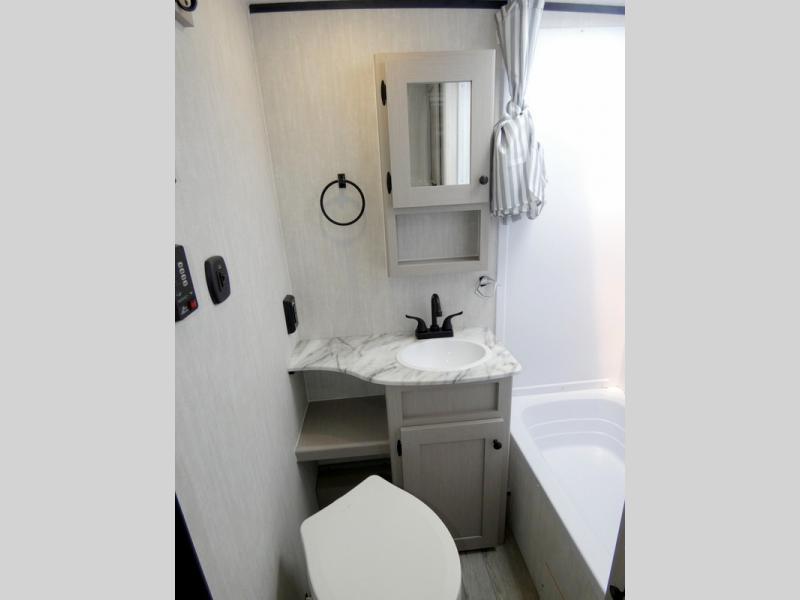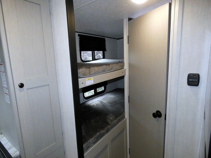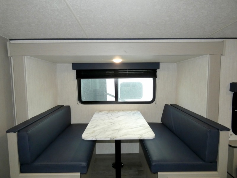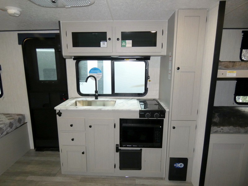 You will have more interior space with a booth dinette slide in this travel trailer! The chef will love cooking indoors with the two burner cooktop, microwave, and 8 cu. ft. 12V refrigerator, as well as outdoors with the exterior camp kitchen. Start each morning feeling clean and refreshed after sleeping on the front queen bed with a headboard and showering in the tub/shower inside the rear corner bathroom, plus the bathroom has a wardrobe to keep your towels close. The kids will love sleeping on the rear corner set of 30" x 74" bunk beds too!