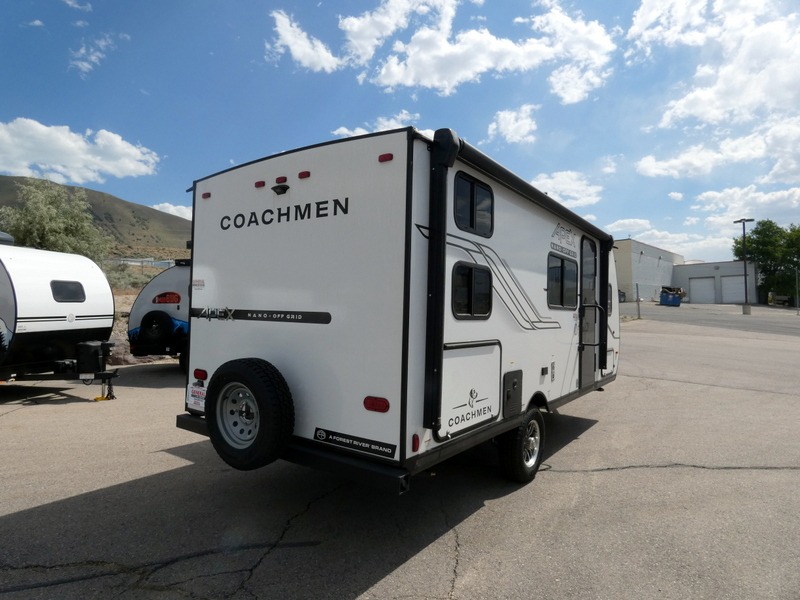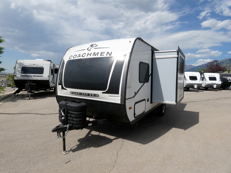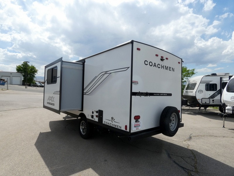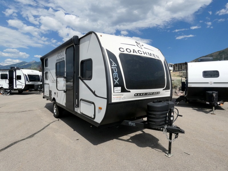 You will find comfort, convenience, and a sturdy construction with each of these Coachmen RV Apex Nano travel trailers! They are held together with an aluma-cage construction, an I-beam chassis, plus vacuum-bonded laminated dual Azdel fiberglass walls for double the protection against the elements. The 200-watt solar panel with a 30 amp control charger is included within the Off-Grid Package, along with two 20 lb. LP tanks, a high velocity power roof vent, plus 12V outlets to keep you powered up. More exterior feature include a hot/cold shower, four stabilizer jacks, a power awning with LED lighting, and magnetic baggage door catches to easily pack and unload your gear. You will love the interior of your Apex Nano with Congoleum residential flooring, one-piece seamless edge countertops, matte black hardware in the galley, and a hand-crafted wood medicine cabinet in the bath.