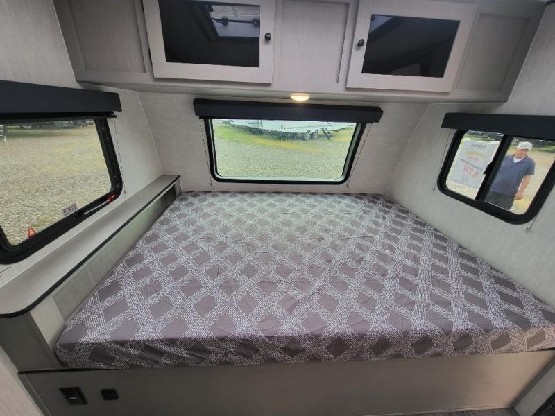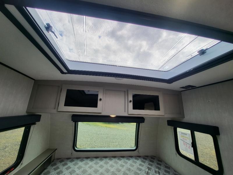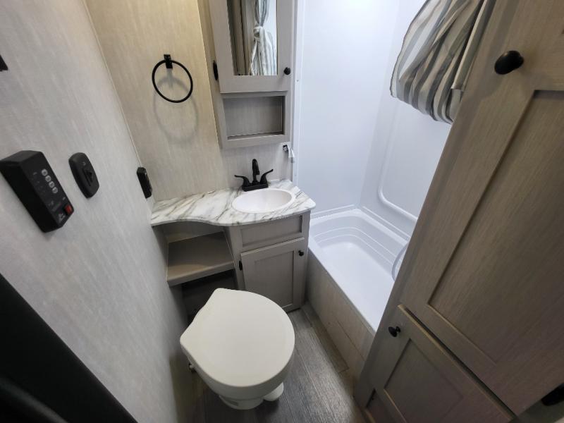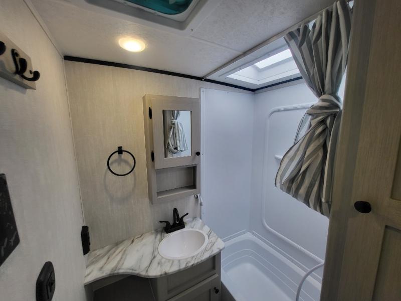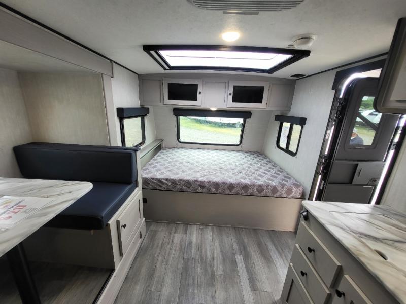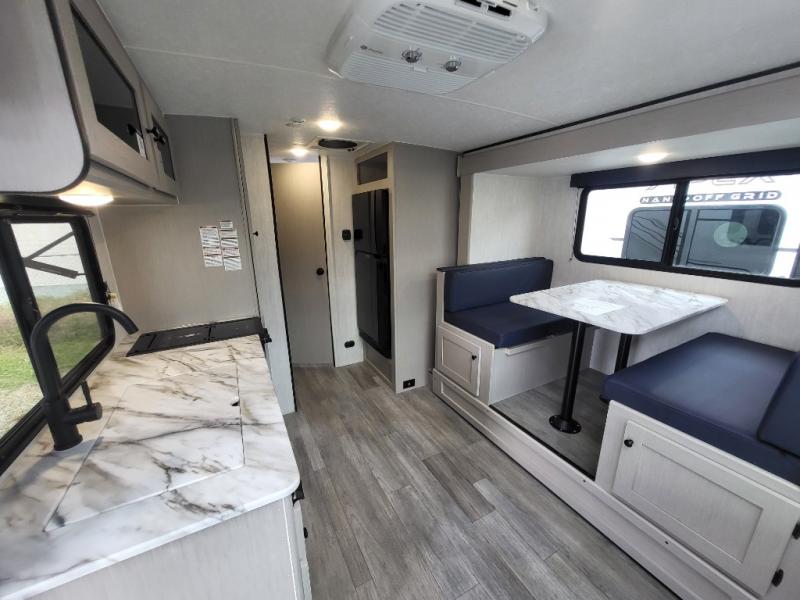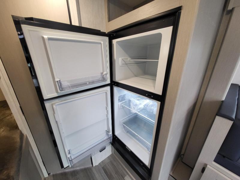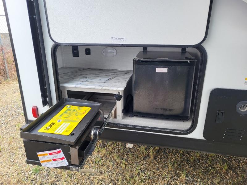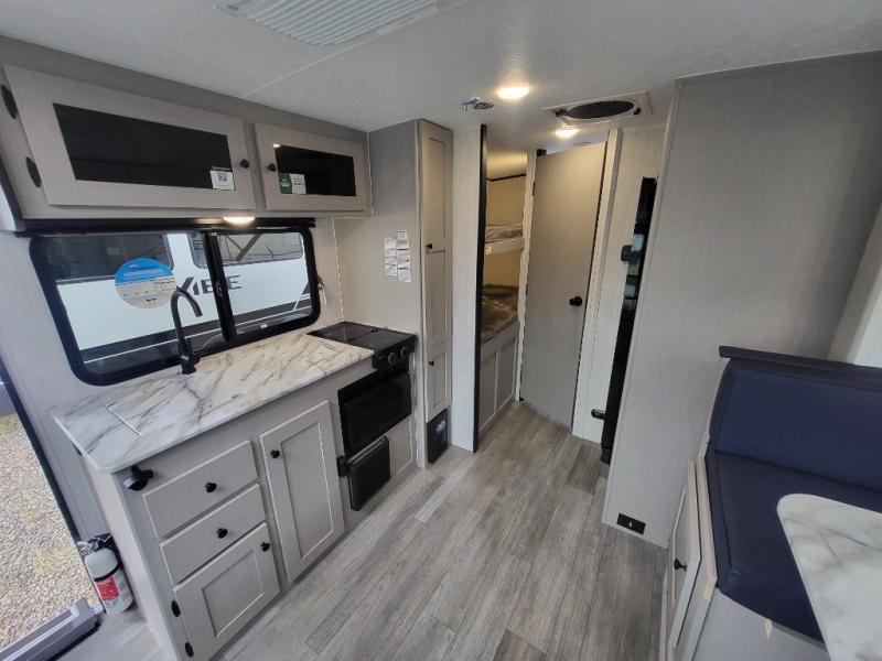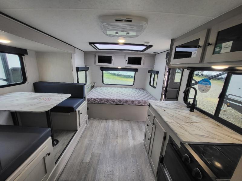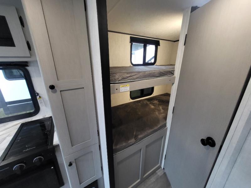 You will have more interior space with a booth dinette slide in this travel trailer! The chef will love cooking indoors with the two burner cooktop, microwave, and 8 cu. ft. 12V refrigerator, as well as outdoors with the exterior camp kitchen. Start each morning feeling clean and refreshed after sleeping on the front queen bed with a headboard and showering in the tub/shower inside the rear corner bathroom, plus the bathroom has a wardrobe to keep your towels close. The kids will love sleeping on the rear corner set of 30" x 74" bunk beds too!