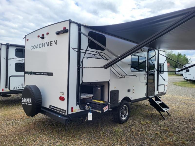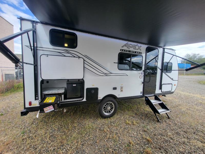 You will find comfort, convenience, and a sturdy construction with each of these Coachmen RV Apex Nano travel trailers! They are held together with an aluma-cage construction, an I-beam chassis, plus vacuum-bonded laminated dual Azdel fiberglass walls for double the protection against the elements. The 200-watt solar panel with a 30 amp control charger is included within the Off-Grid Package, along with two 20 lb. LP tanks, a high velocity power roof vent, plus 12V outlets to keep you powered up. More exterior feature include a hot/cold shower, four stabilizer jacks, a power awning with LED lighting, and magnetic baggage door catches to easily pack and unload your gear. You will love the interior of your Apex Nano with Congoleum residential flooring, one-piece seamless edge countertops, matte black hardware in the galley, and a hand-crafted wood medicine cabinet in the bath.