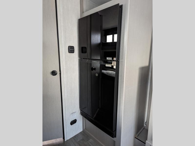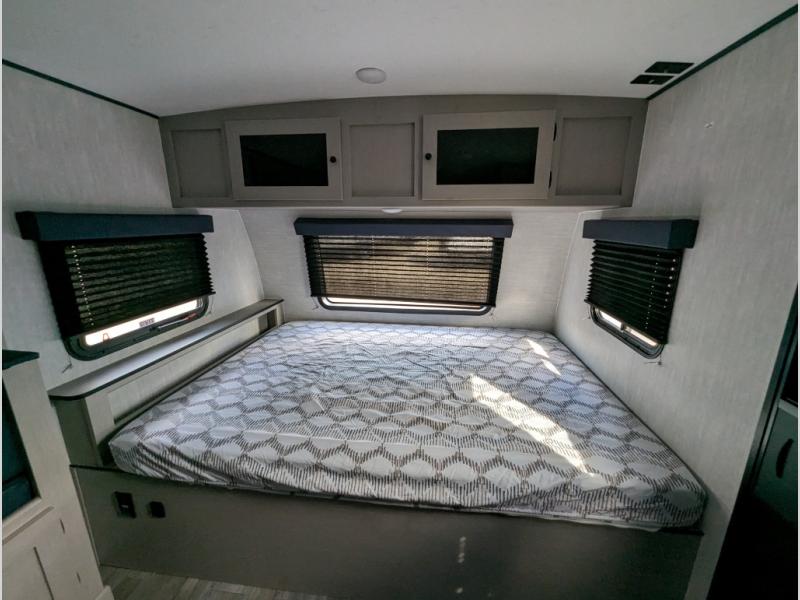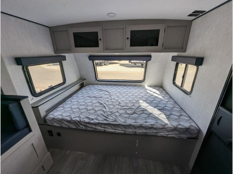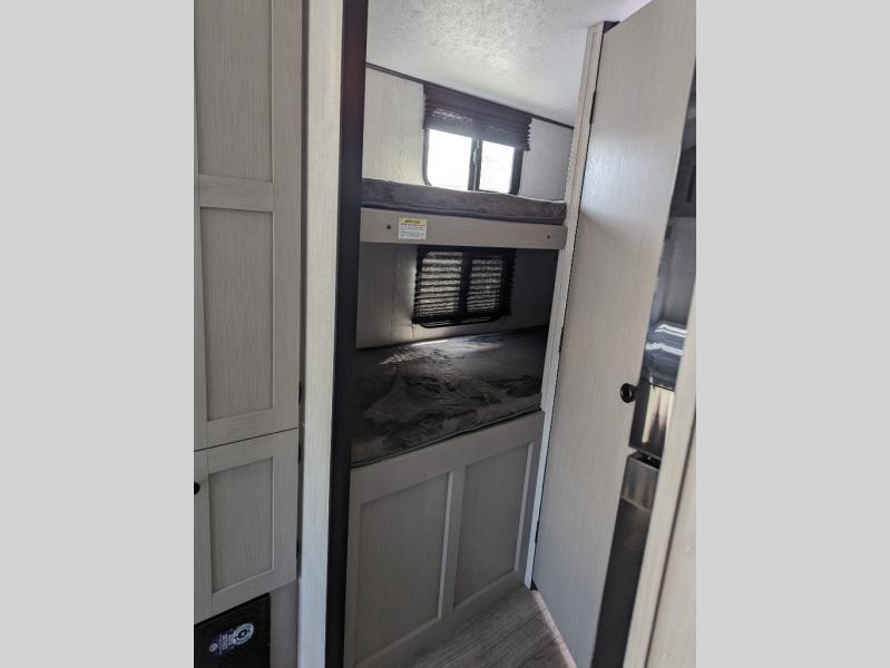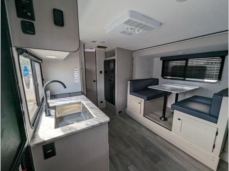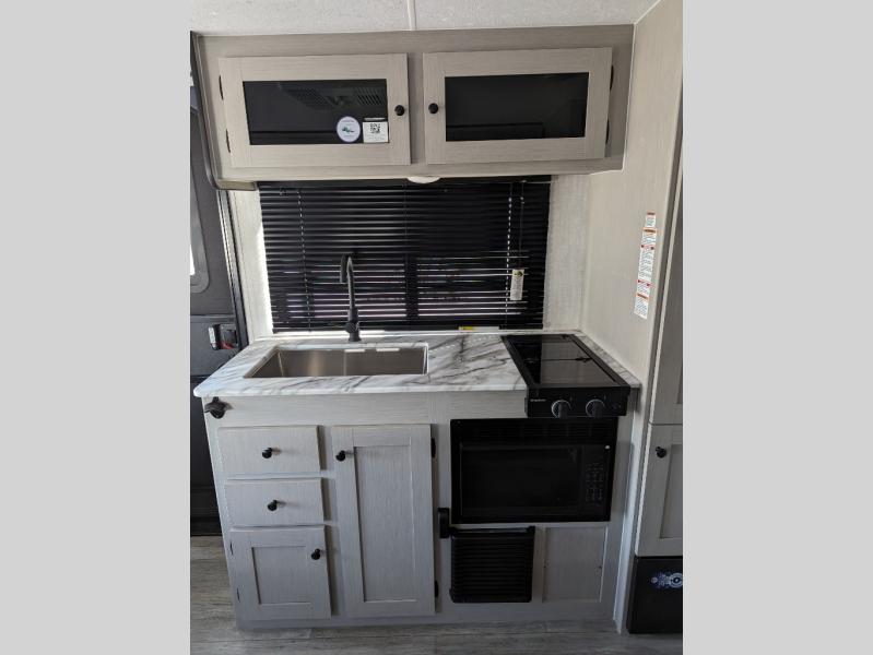 You will have more interior space with a booth dinette slide in this travel trailer! The chef will love cooking indoors with the two burner cooktop, microwave, and 8 cu. ft. 12V refrigerator, as well as outdoors with the exterior camp kitchen. Start each morning feeling clean and refreshed after sleeping on the front queen bed with a headboard and showering in the tub/shower inside the rear corner bathroom, plus the bathroom has a wardrobe to keep your towels close. The kids will love sleeping on the rear corner set of 30" x 74" bunk beds too!