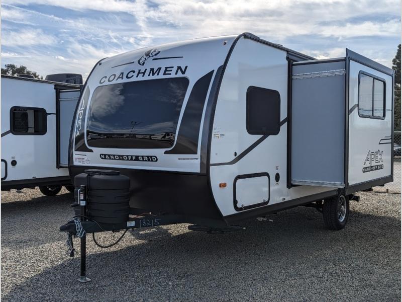 You will find comfort, convenience, and a sturdy construction with each of these Coachmen RV Apex Nano travel trailers! They are held together with an aluma-cage construction, an I-beam chassis, plus vacuum-bonded laminated dual Azdel fiberglass walls for double the protection against the elements. The 200-watt solar panel with a 30 amp control charger is included within the Off-Grid Package, along with two 20 lb. LP tanks, a high velocity power roof vent, plus 12V outlets to keep you powered up. More exterior feature include a hot/cold shower, four stabilizer jacks, a power awning with LED lighting, and magnetic baggage door catches to easily pack and unload your gear. You will love the interior of your Apex Nano with Congoleum residential flooring, one-piece seamless edge countertops, matte black hardware in the galley, and a hand-crafted wood medicine cabinet in the bath.